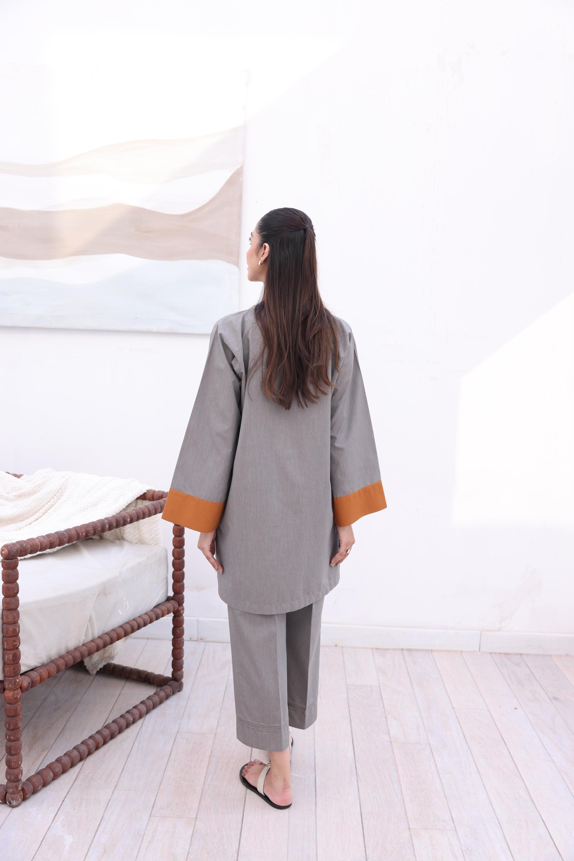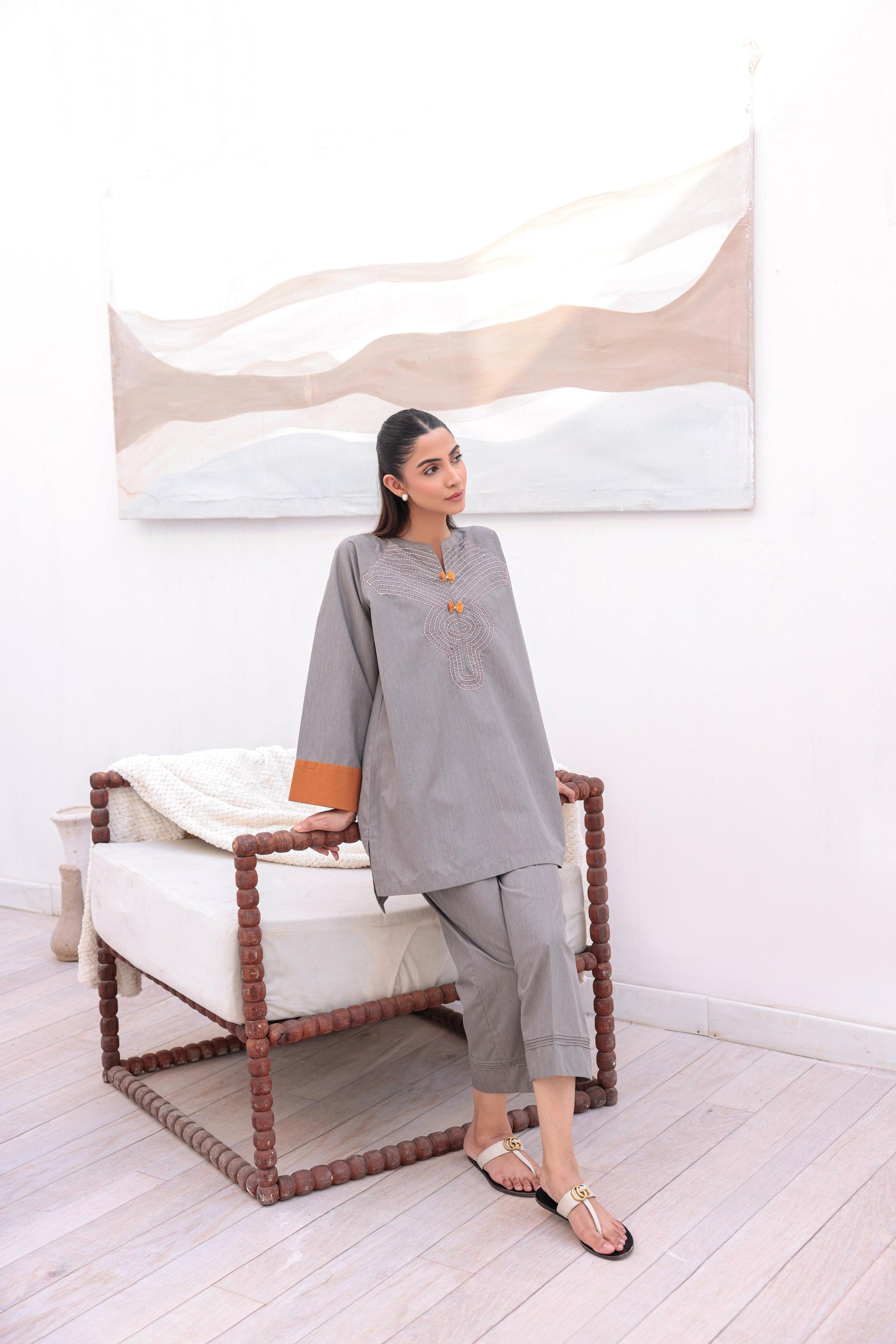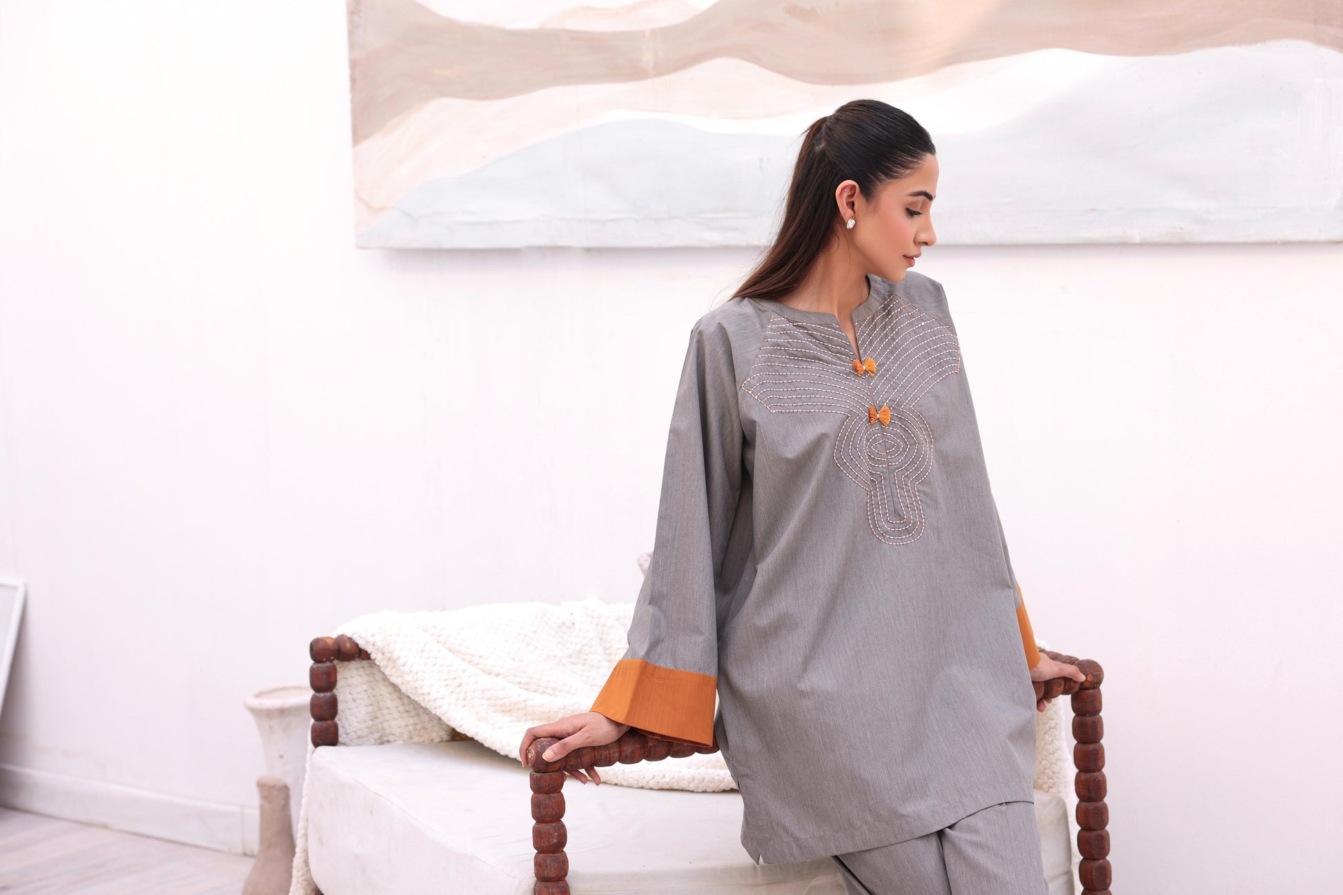 Chic and understated. Luxe italian blend in grey with a hint of tangerine dainty embroidery. Amelia’s structured high-low silhouette fits like a dream. Pants come with.