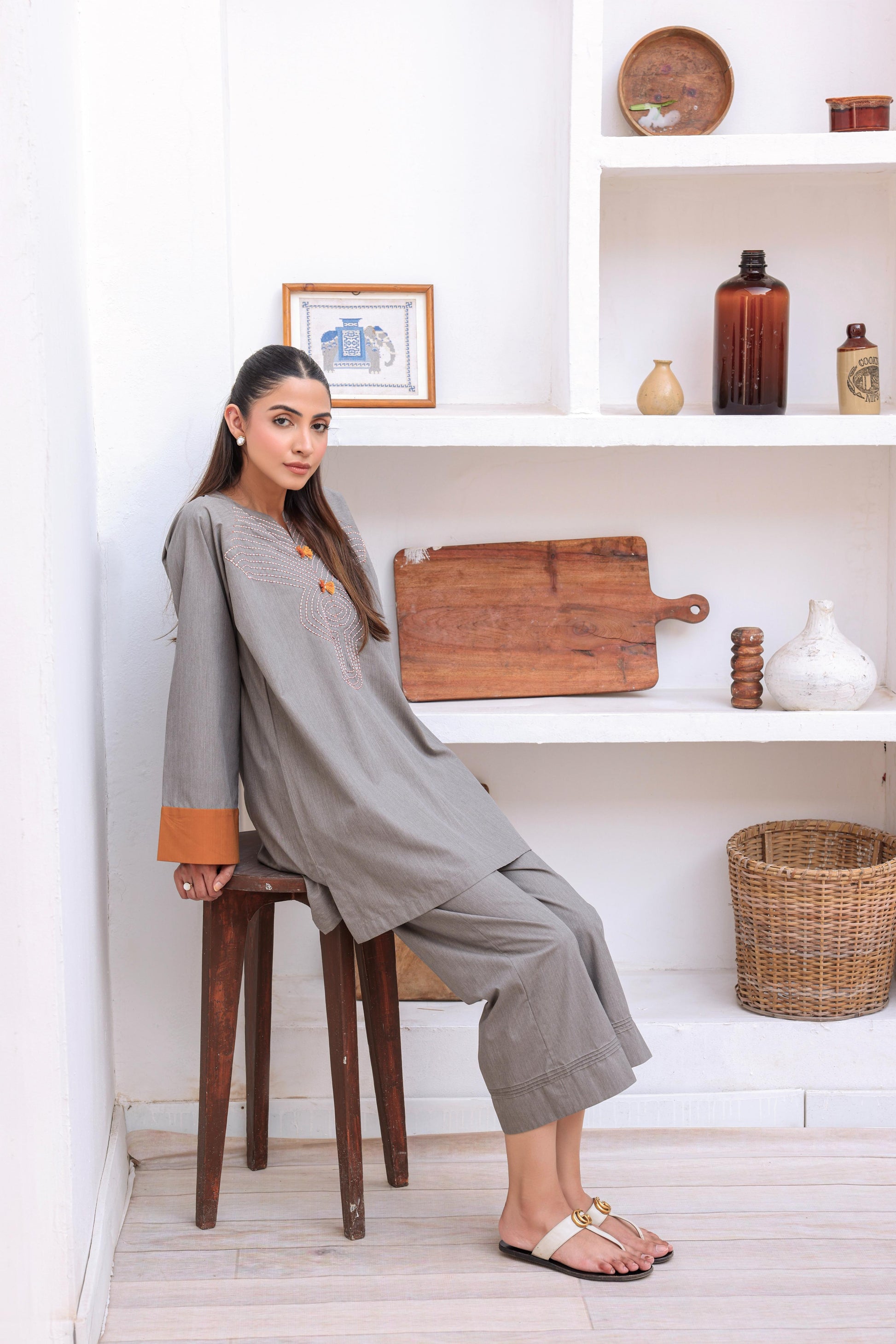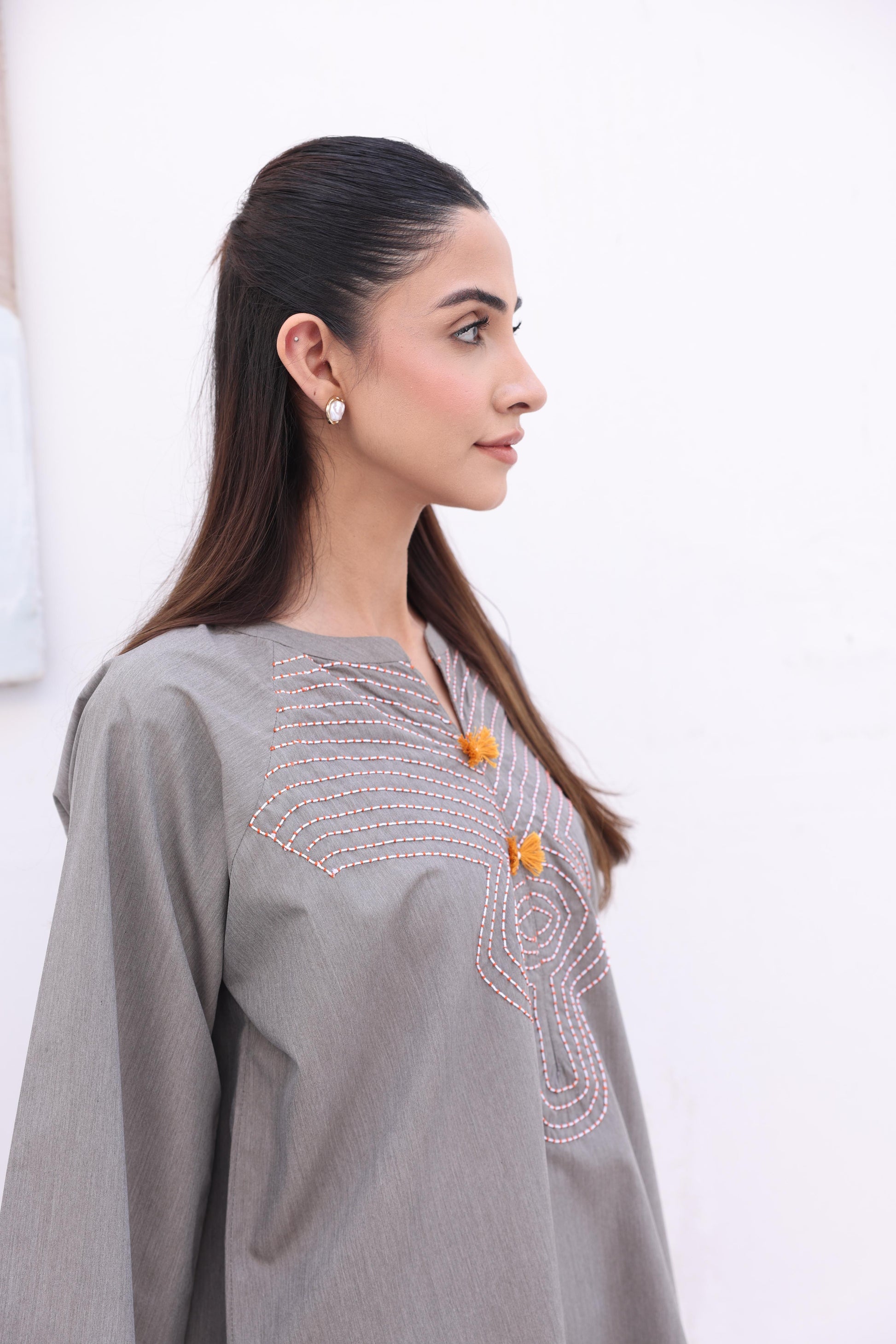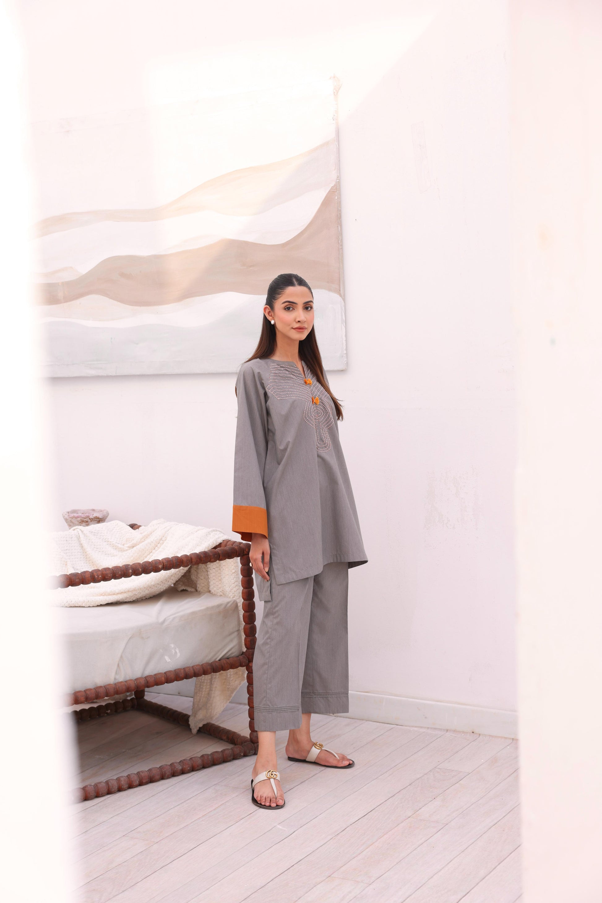 Chic and understated. Luxe italian blend in grey with a hint of tangerine dainty embroidery. Amelia’s structured high-low silhouette fits like a dream. Pants come with.