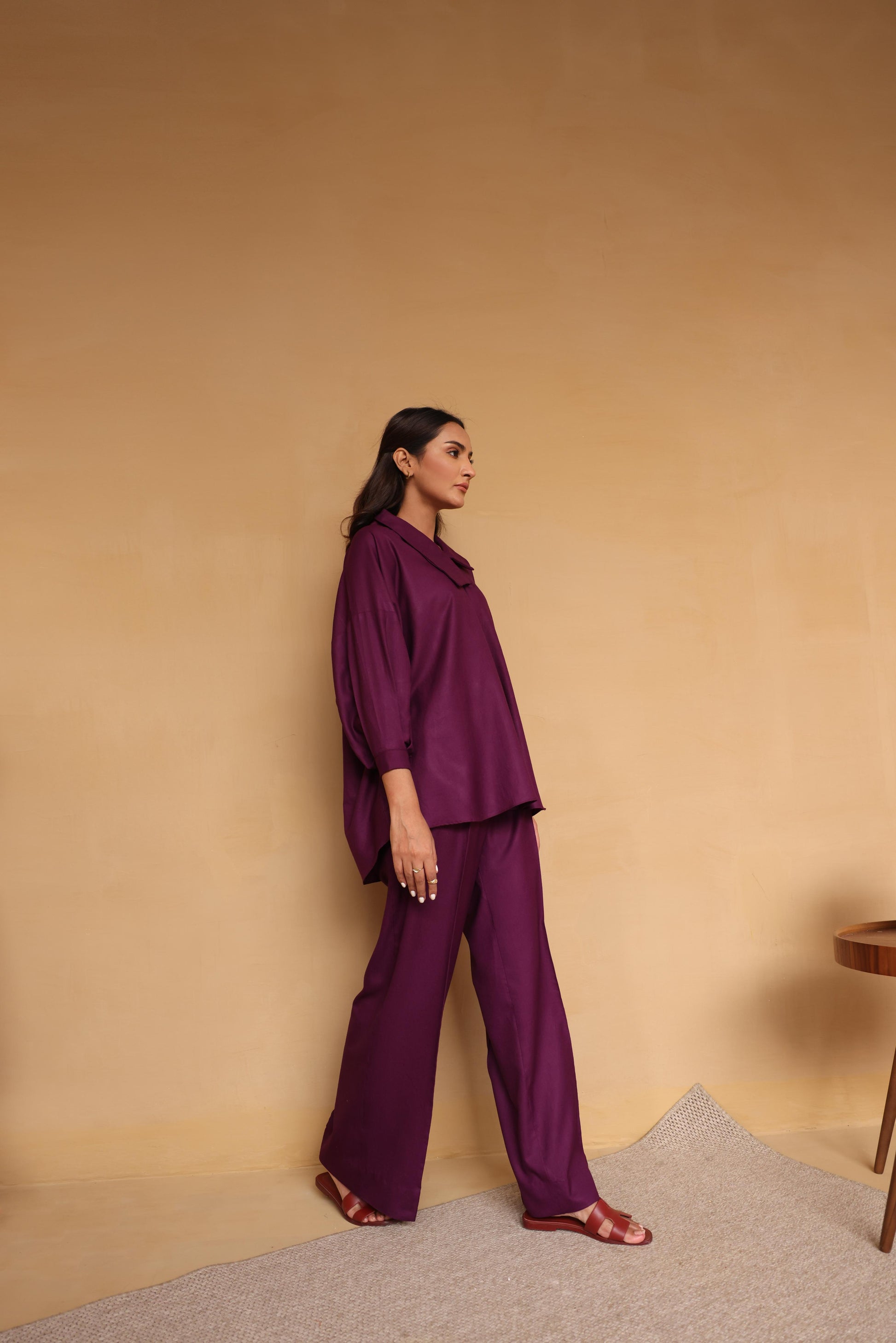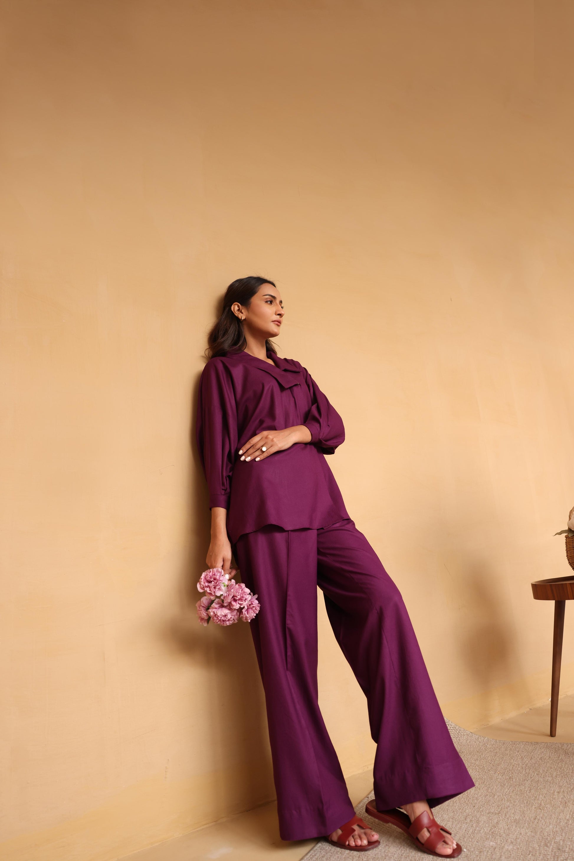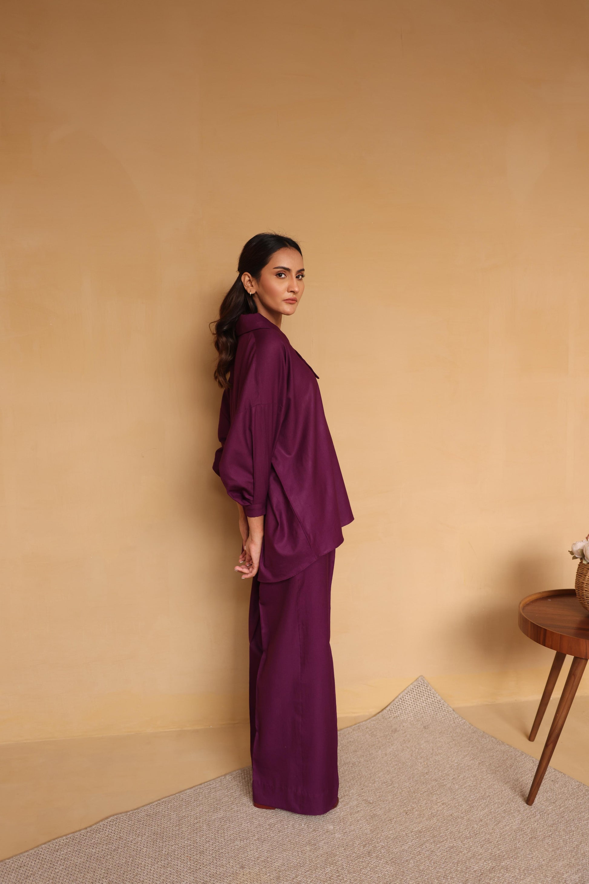 Aria is a deep aubergine matching set that includes a baggy-fit top and a flared floor length pants cut from a flowy fabric ideal for winters.