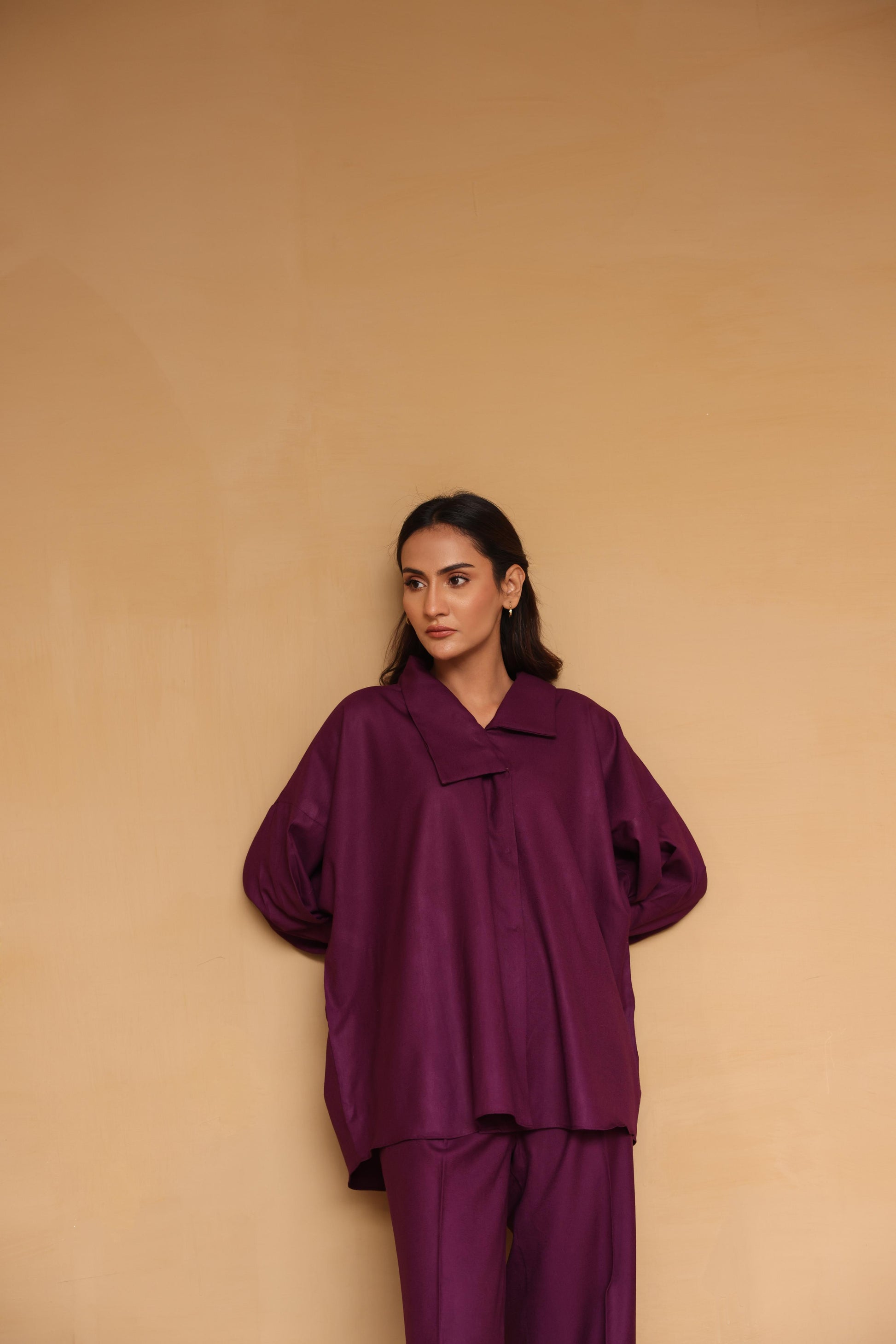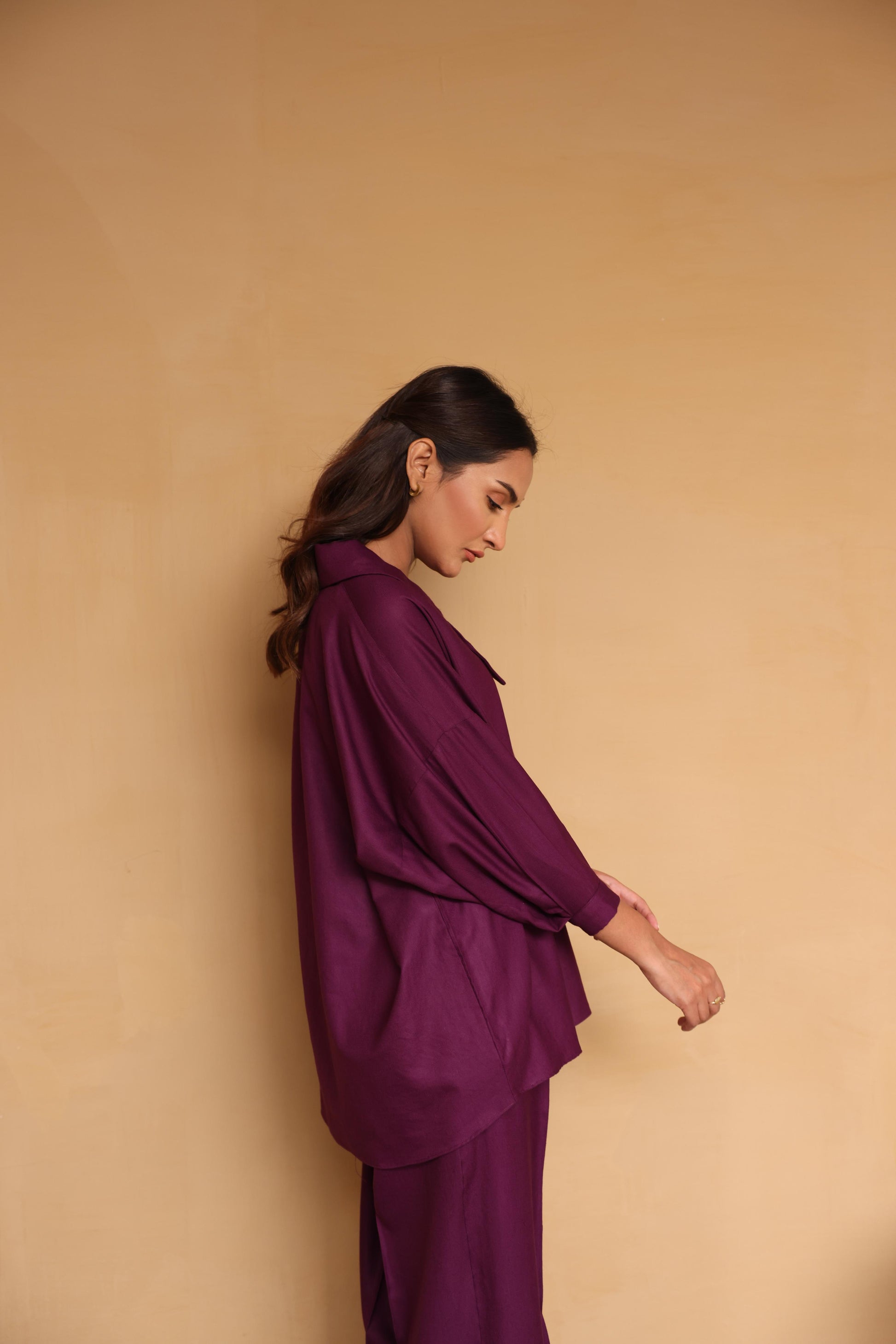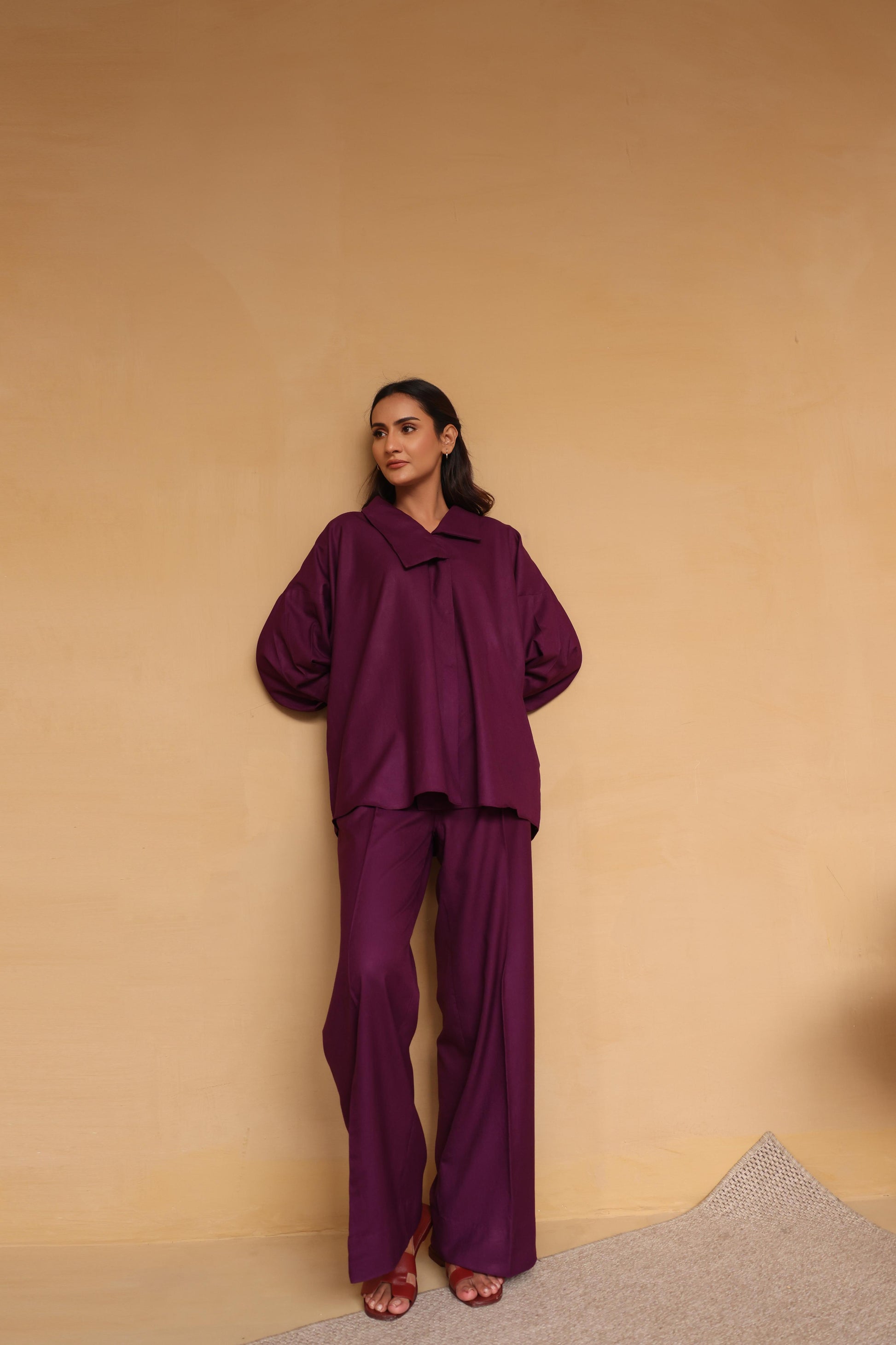 Aria is a deep aubergine matching set that includes a baggy-fit top and a flared floor length pants cut from a flowy fabric ideal for winters.
