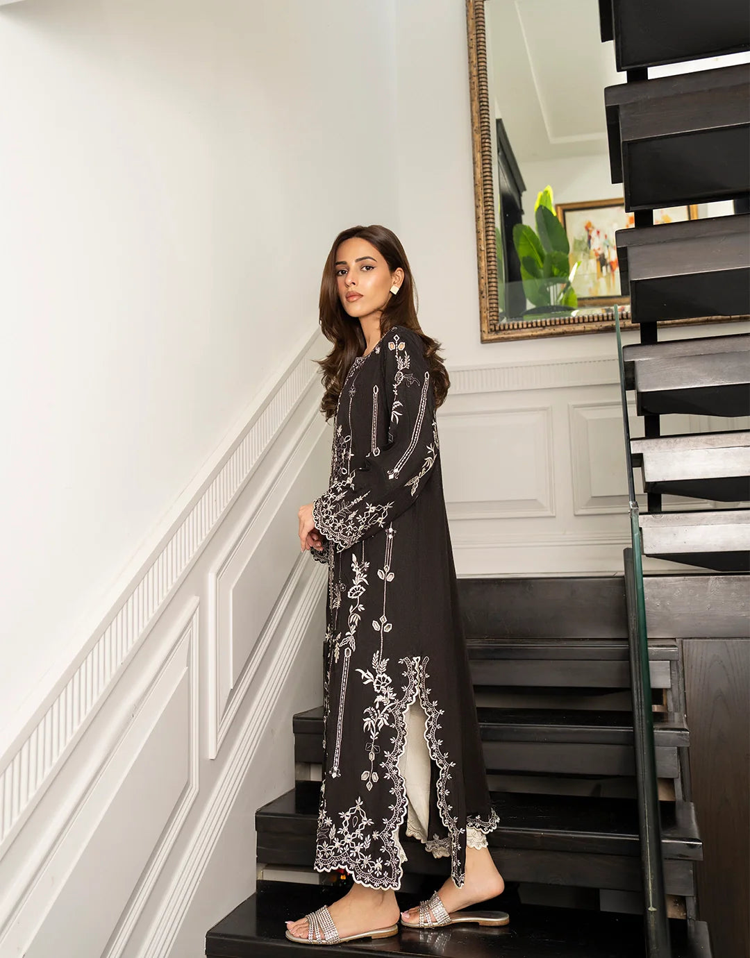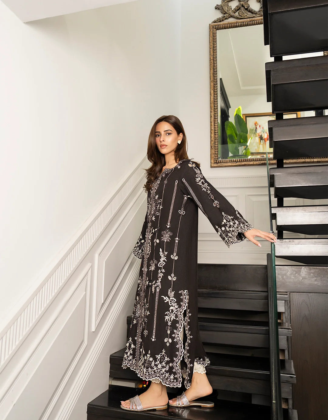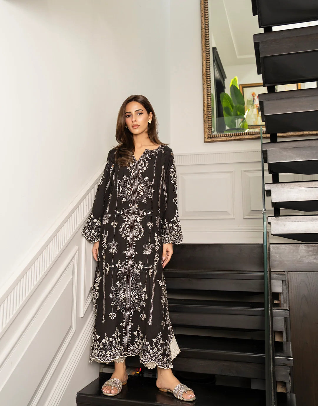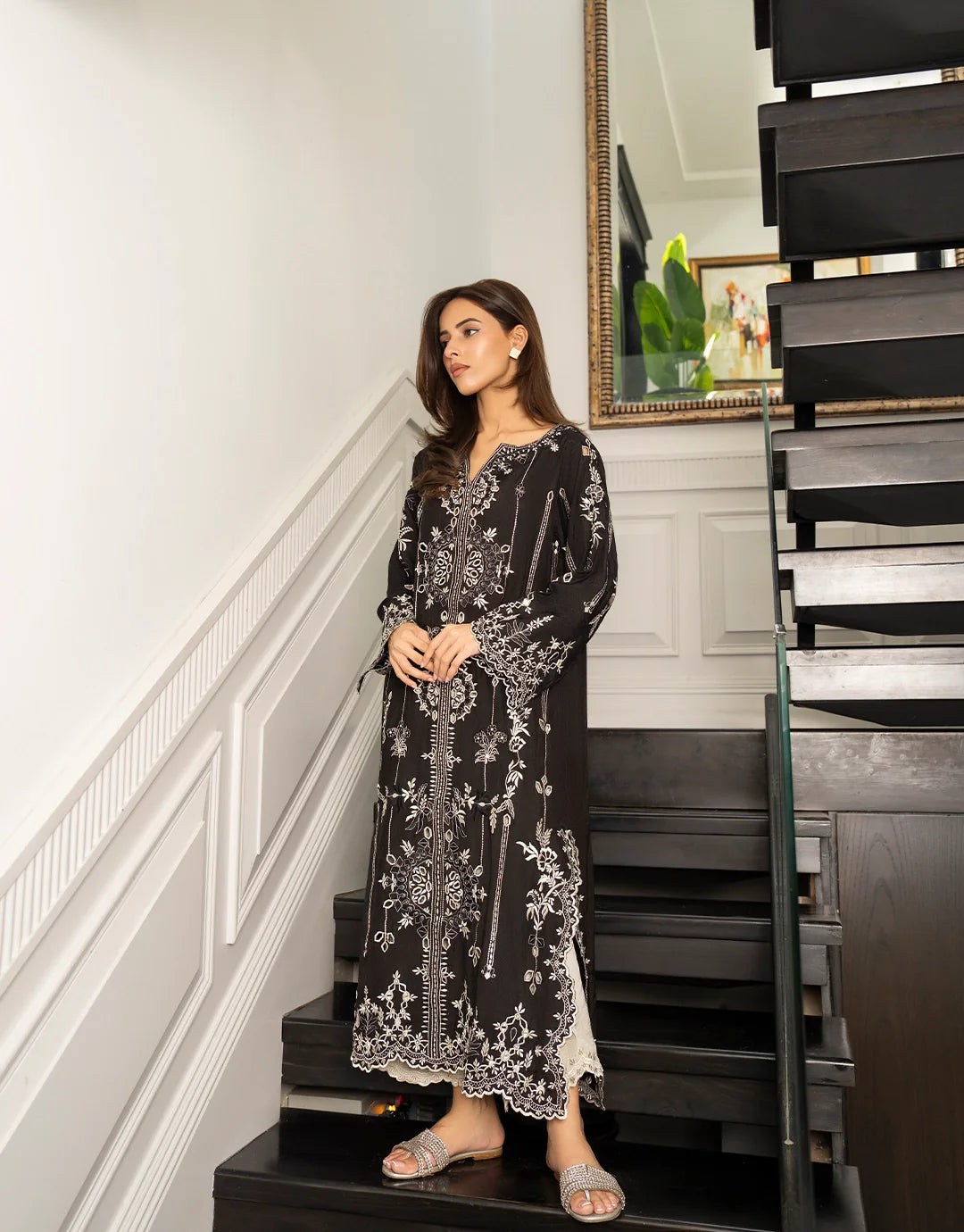 An effortlessly elegant silhouette brought to life with intricate white embroidery on a deep black canvas. This design balances modern grace with traditional charm, offering a look that's polished yet timeless. Perfect for daytime sophistication or evening elegance.