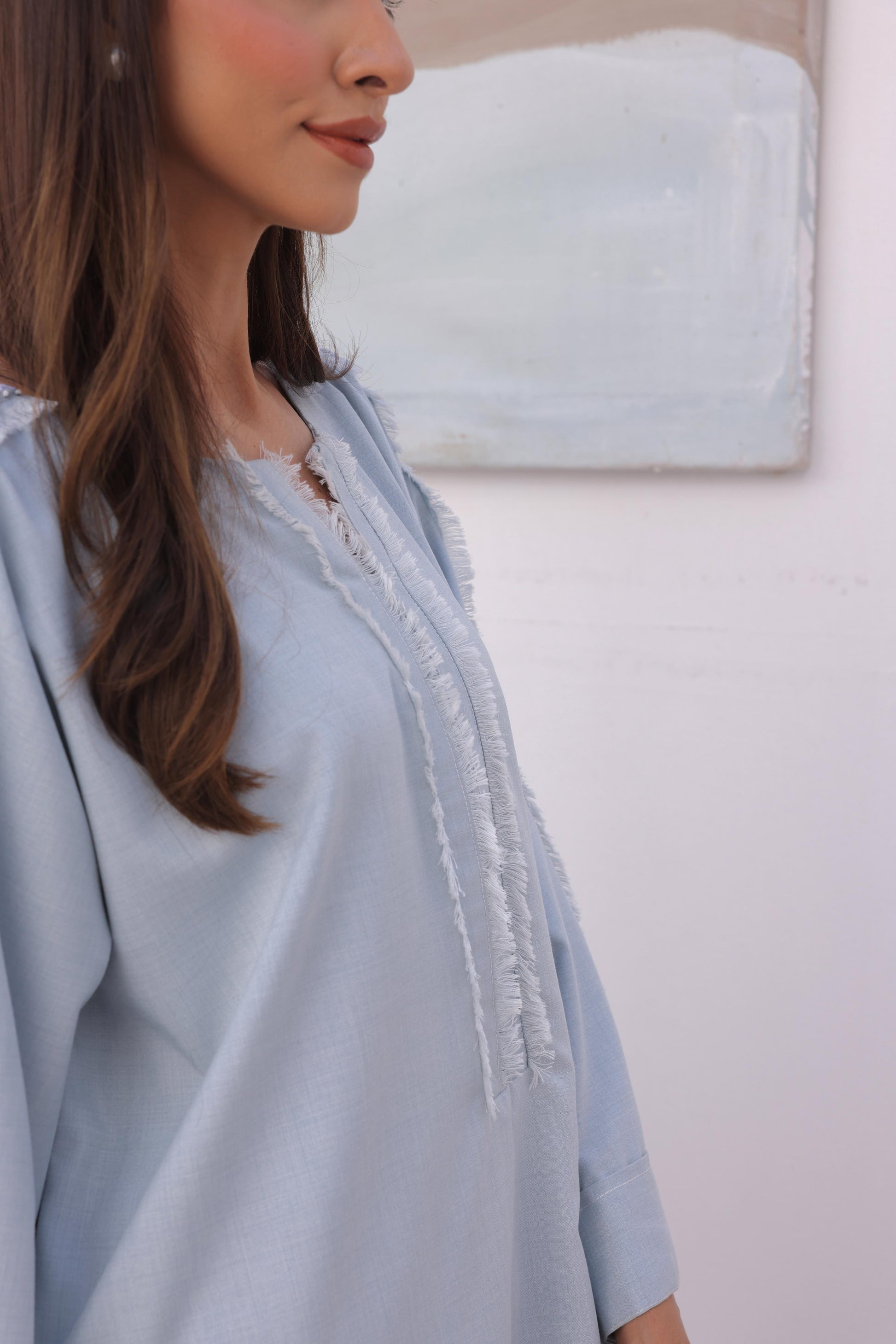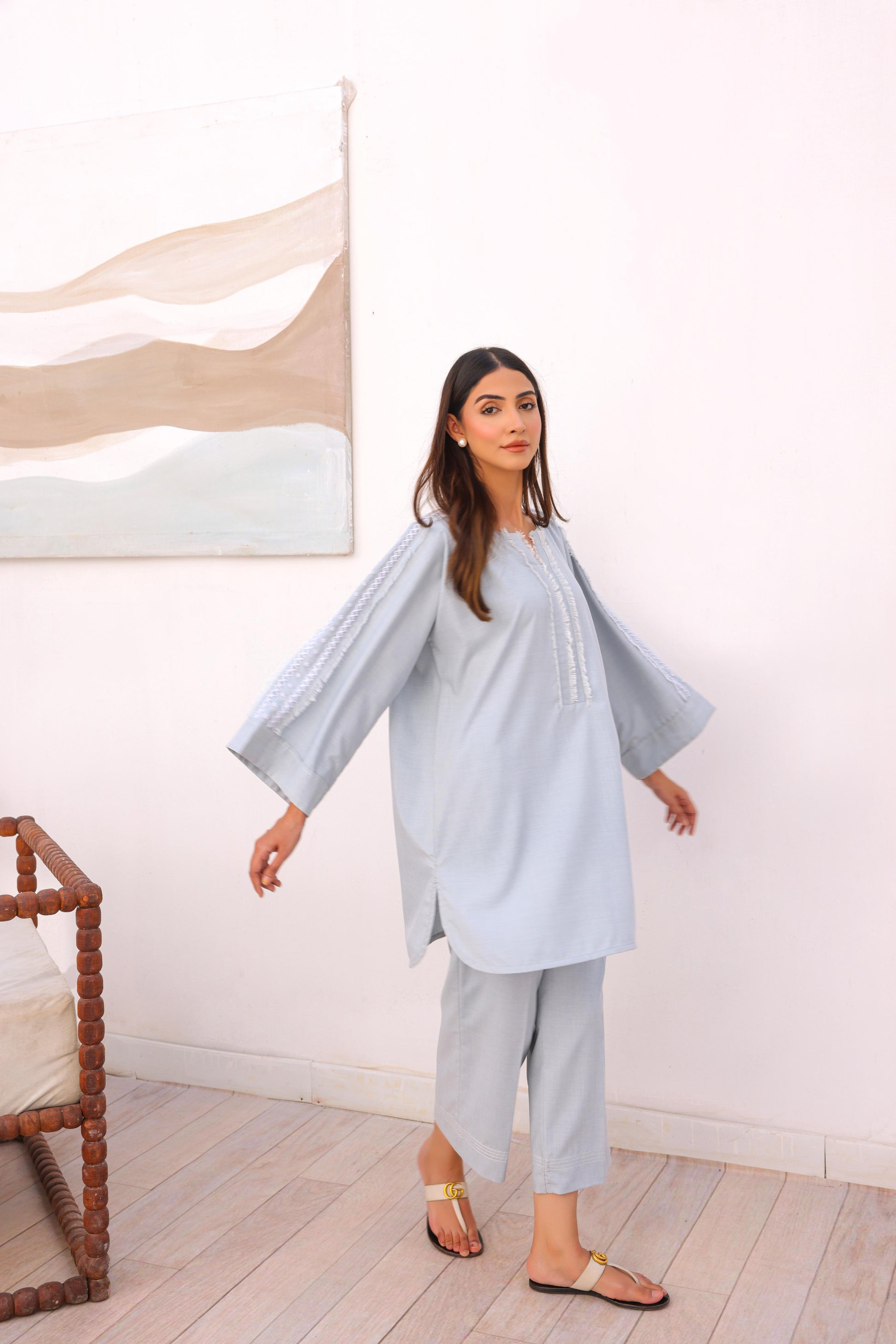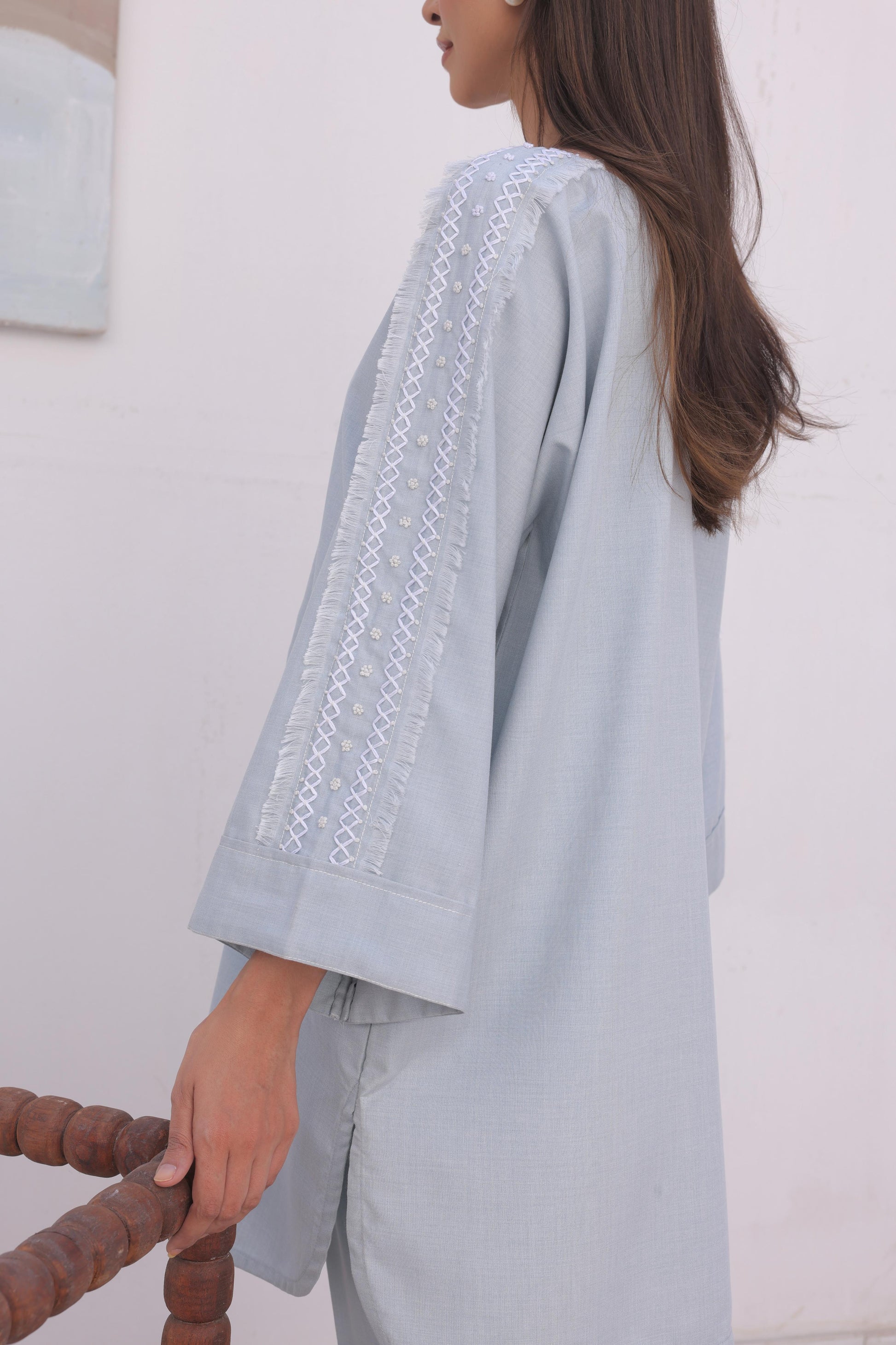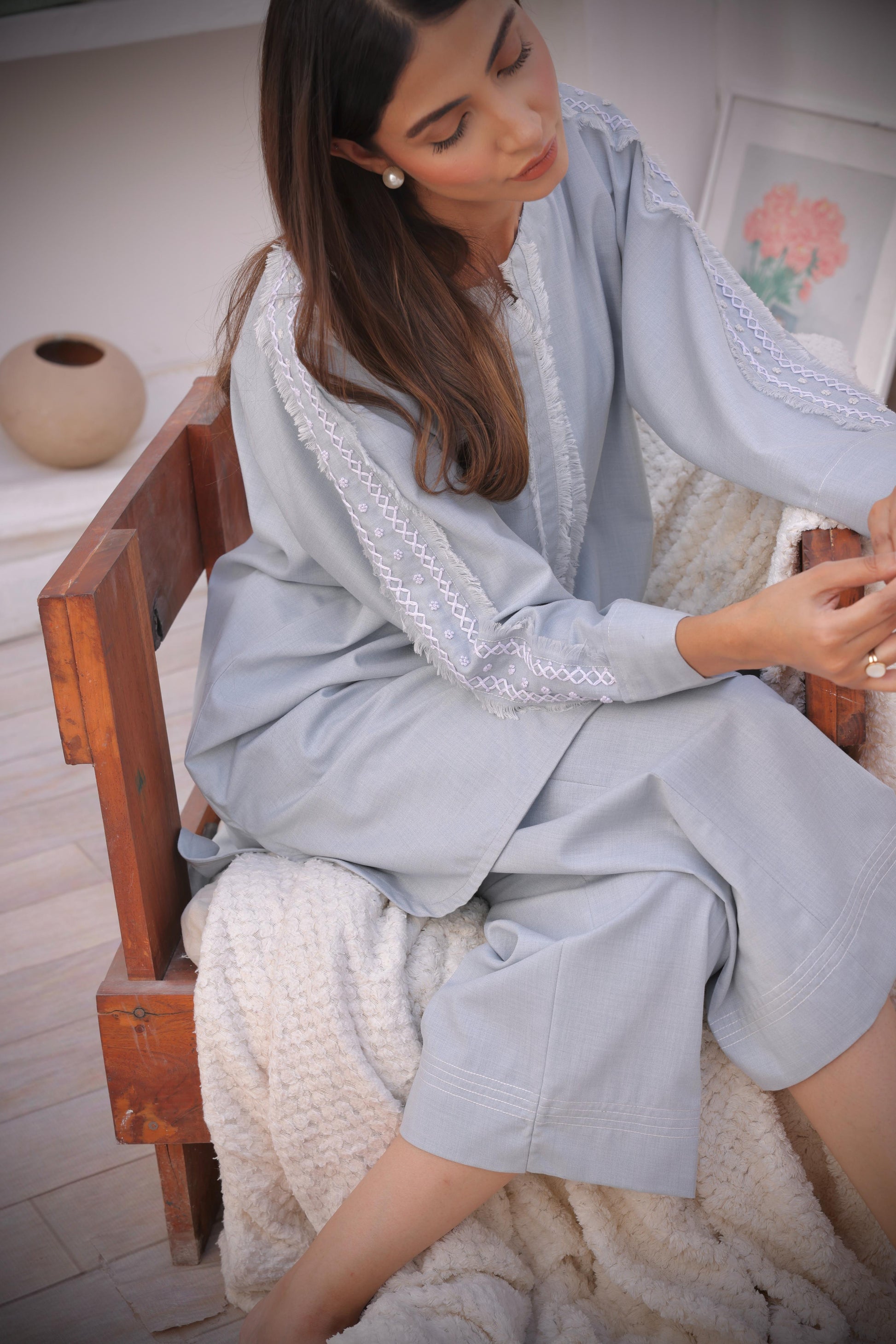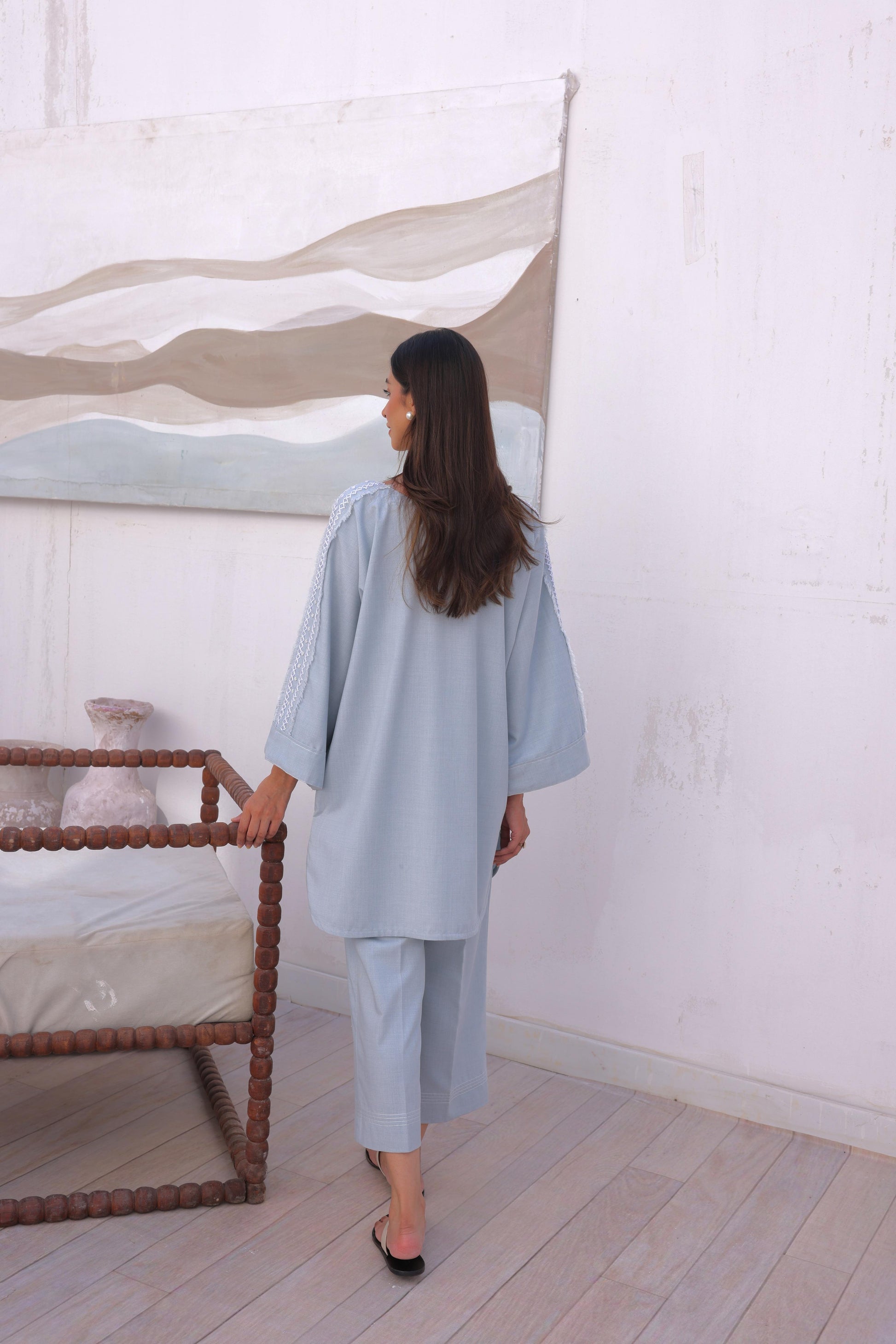The italian blend fabric of our Daara set settles like a breeze against your body. With a straight cut culotte pant and our signature hand embroidery, this entire set is tailored for comfort, the truest luxury.