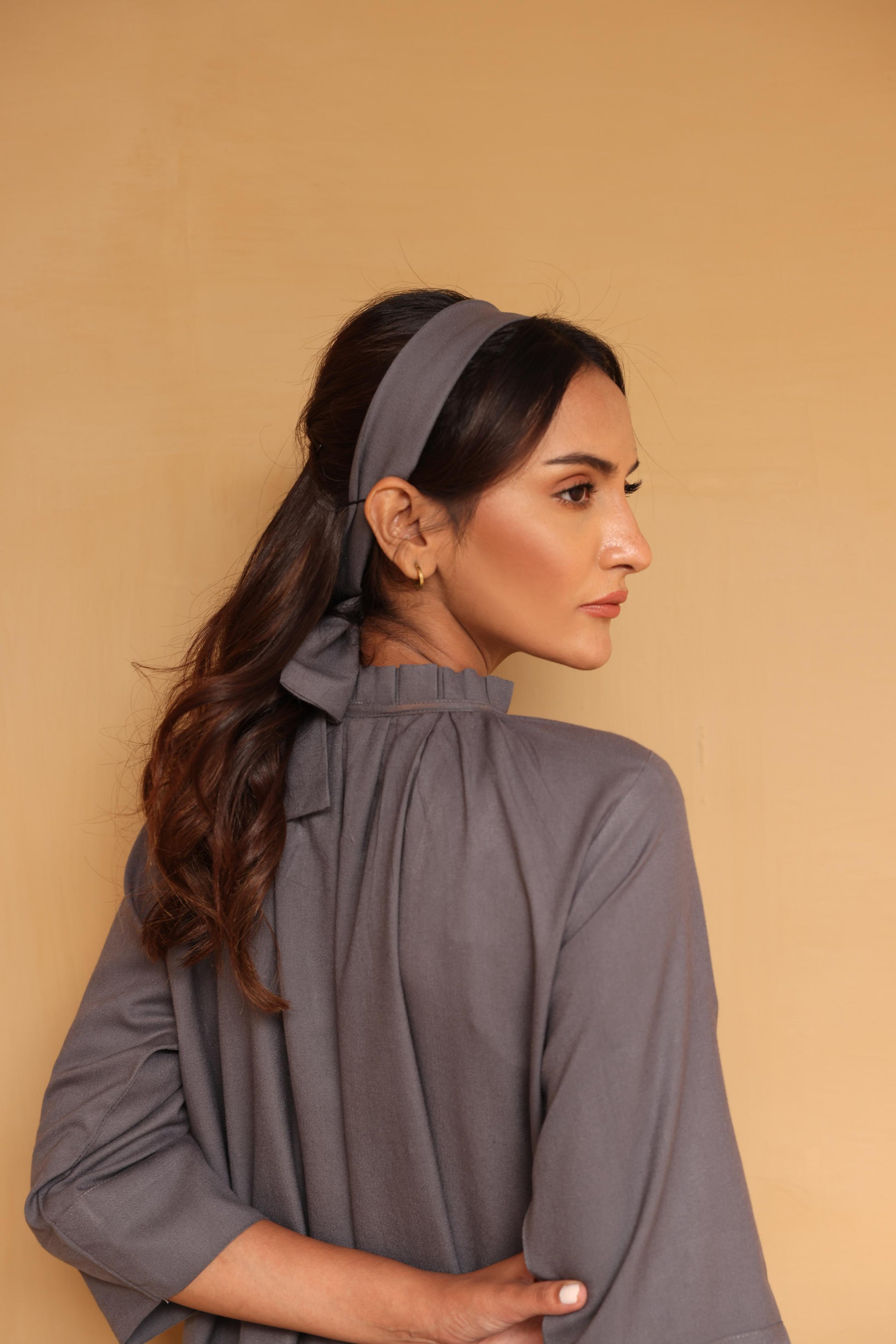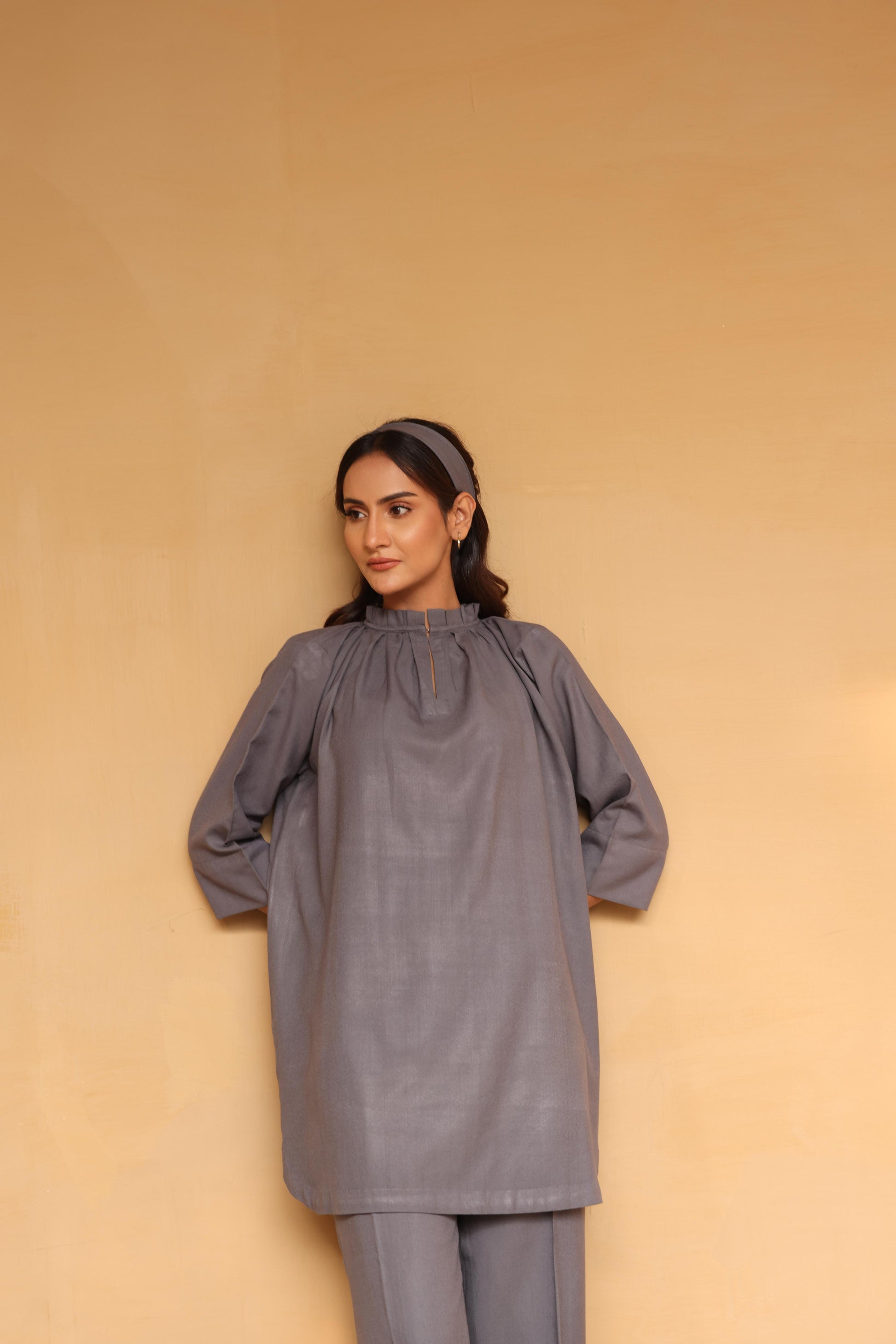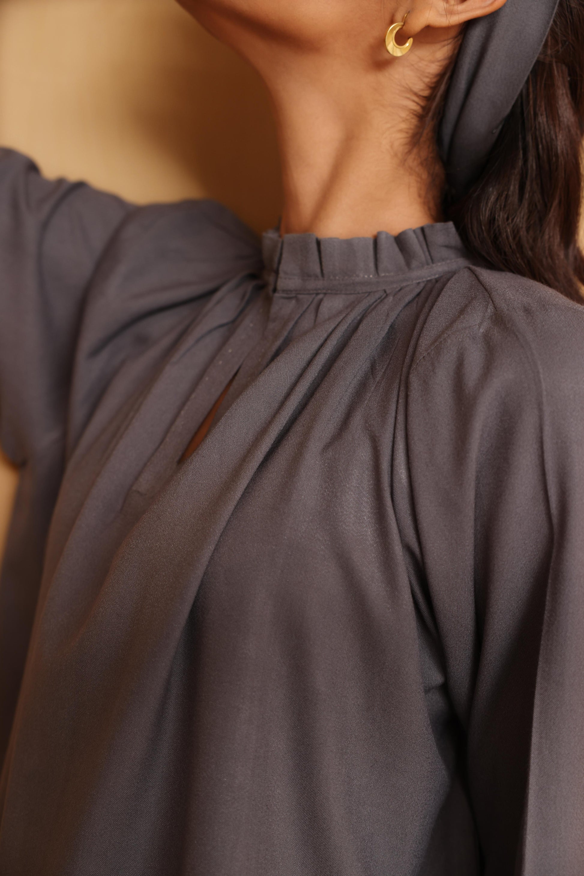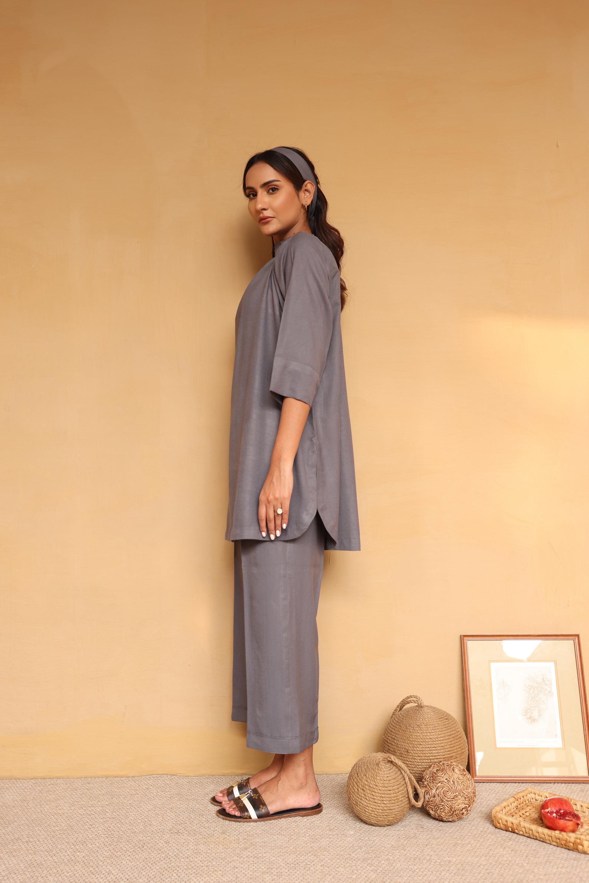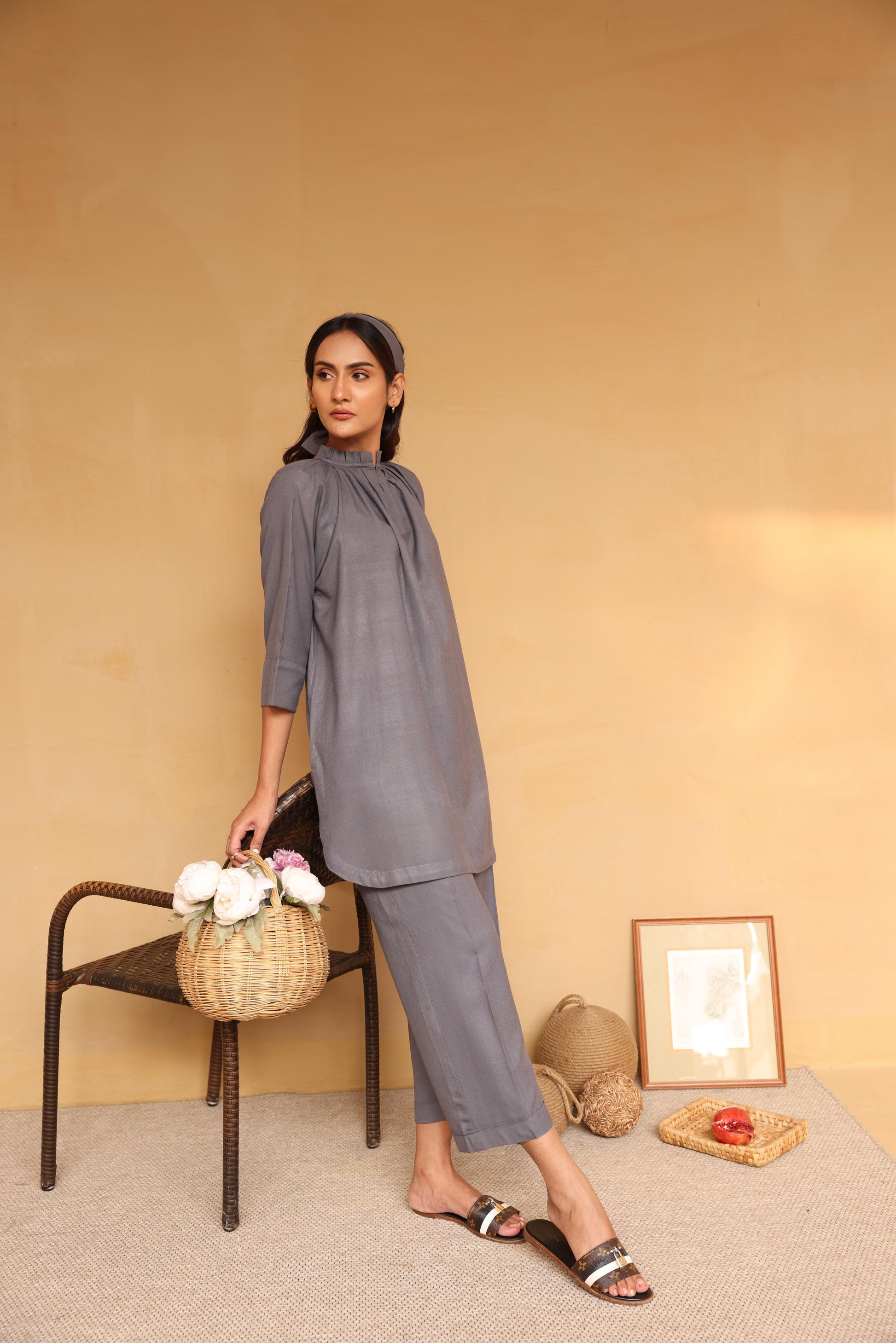 Fiori is a slate grey matching set that consists of a short round cut shirt that features pleating details on the neckline. It comes with culotte pants.