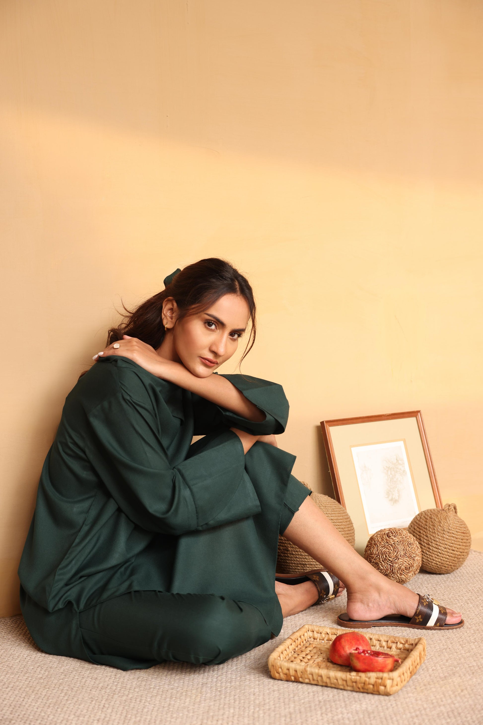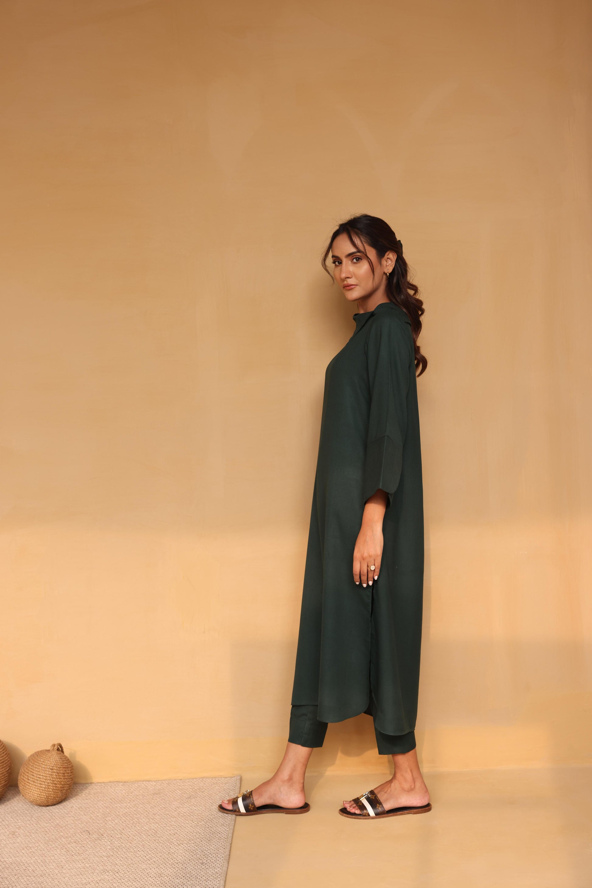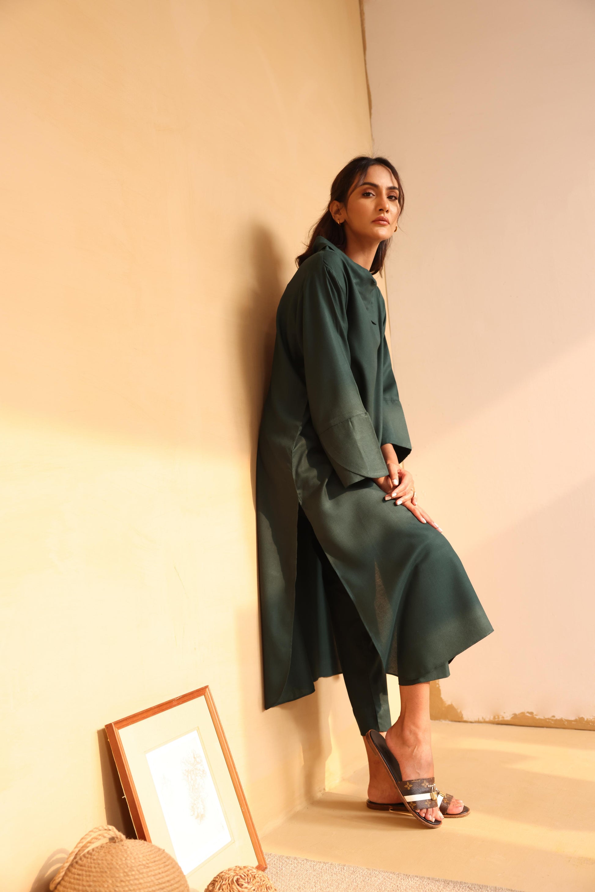 Fria is a dark green matching set that includes a long tailored shirt top and straight pants cut from a flowy fabric ideal for winters.