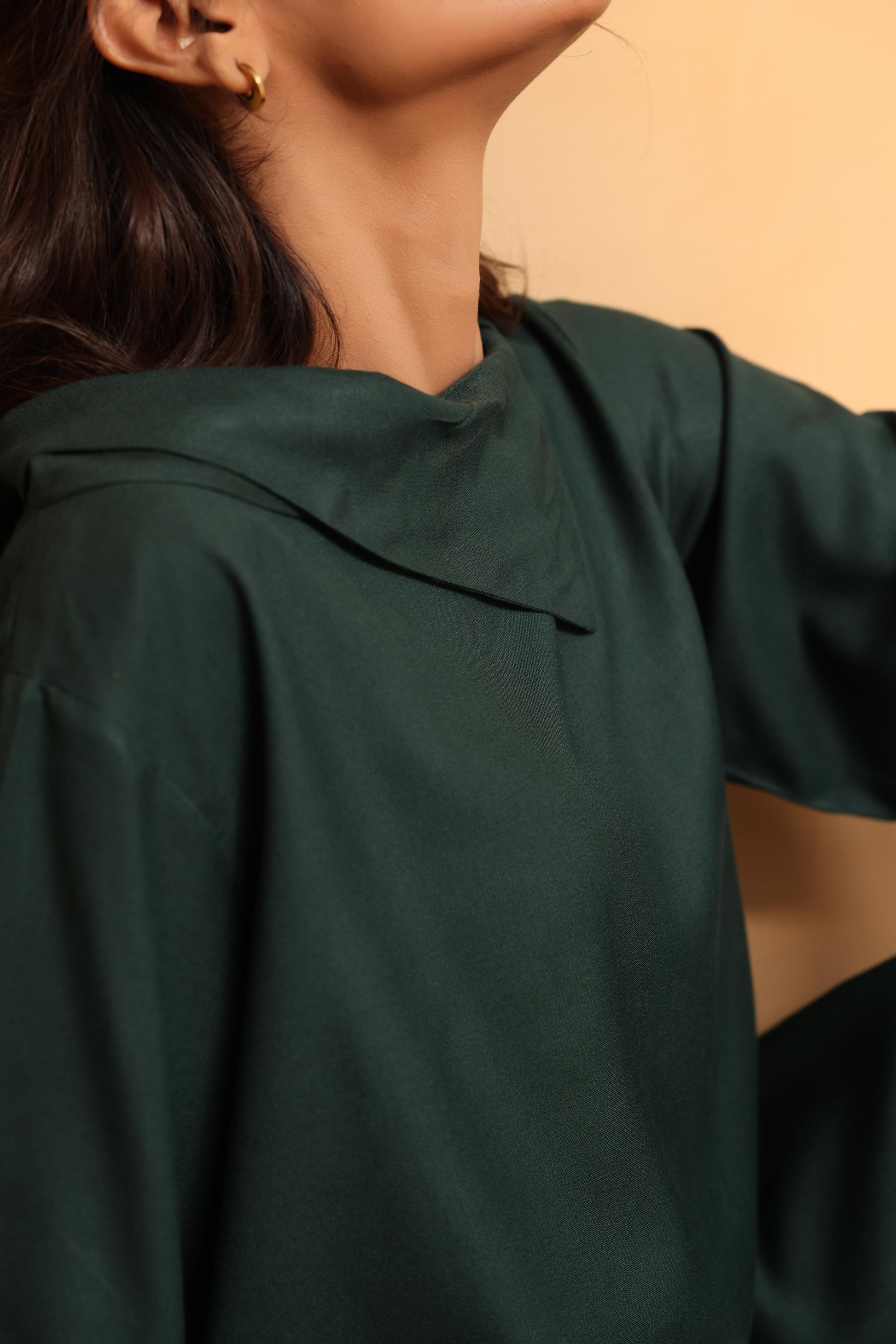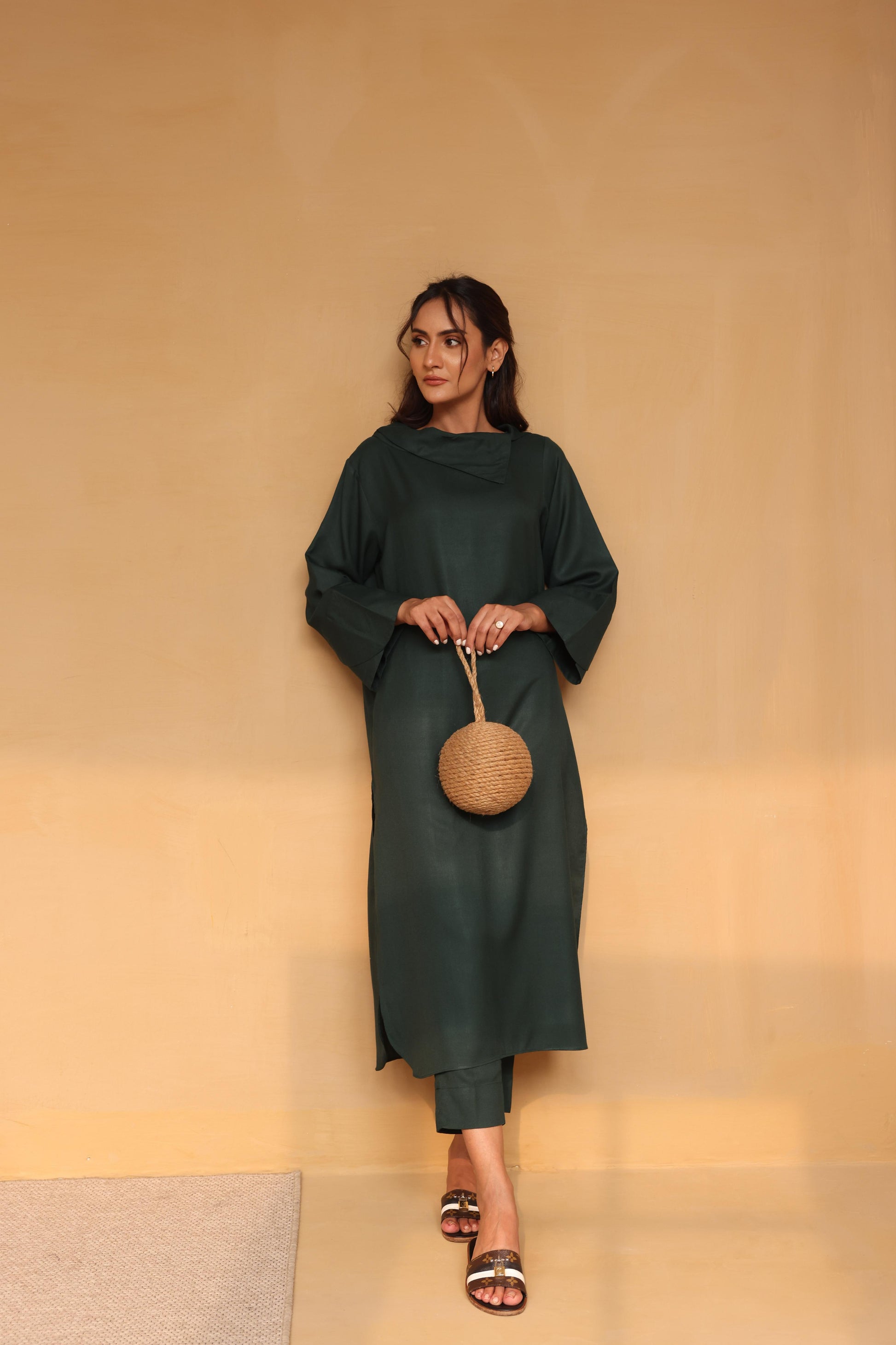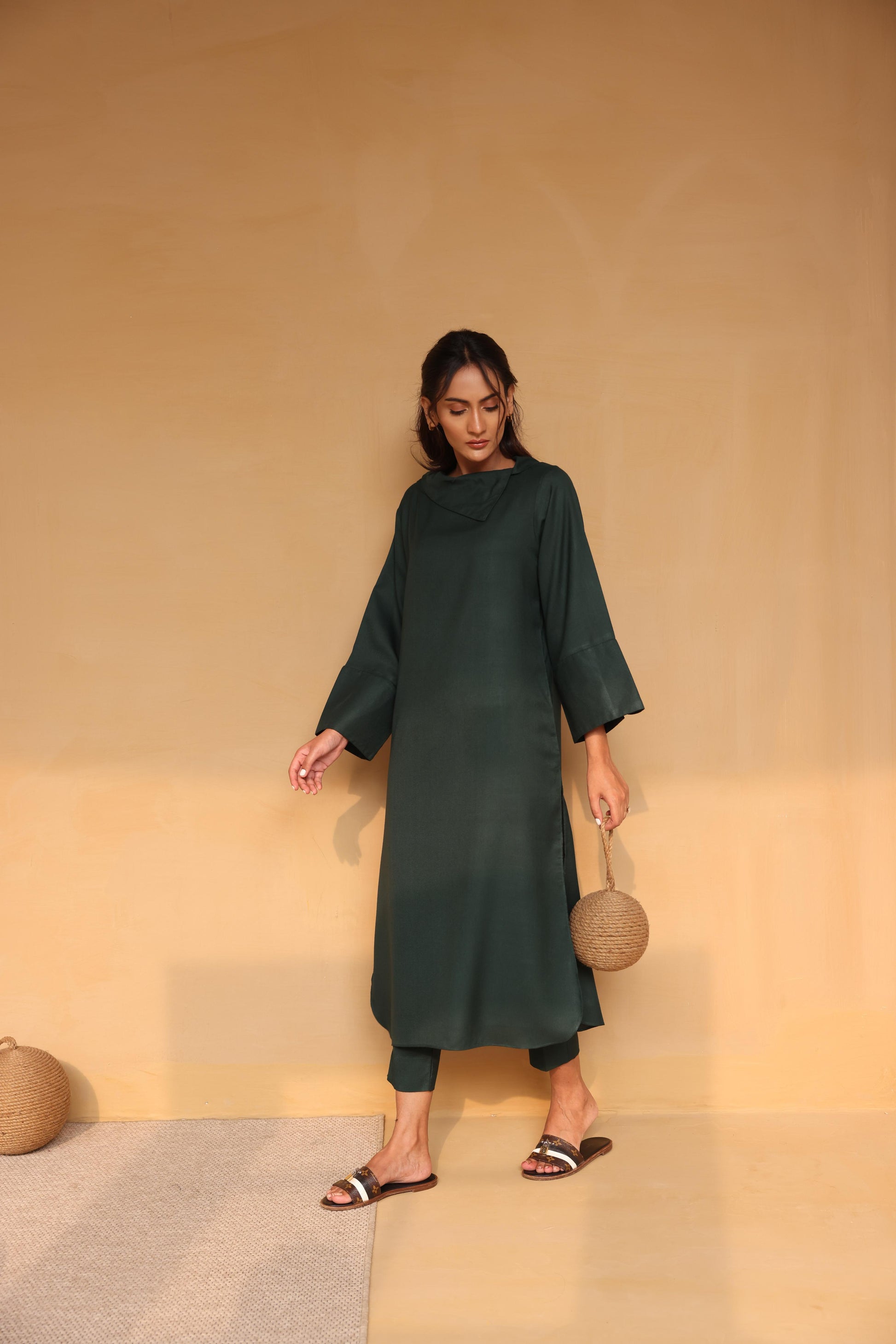 Fria is a dark green matching set that includes a long tailored shirt top and straight pants cut from a flowy fabric ideal for winters.