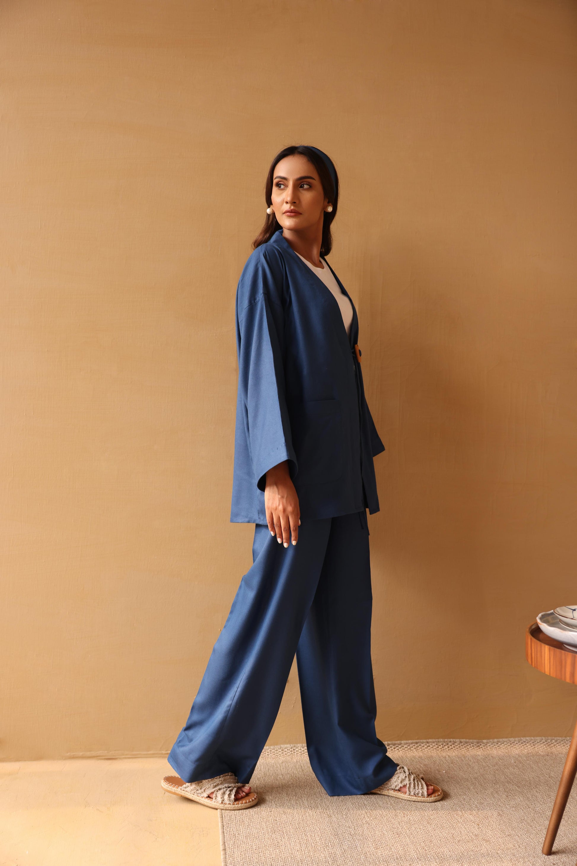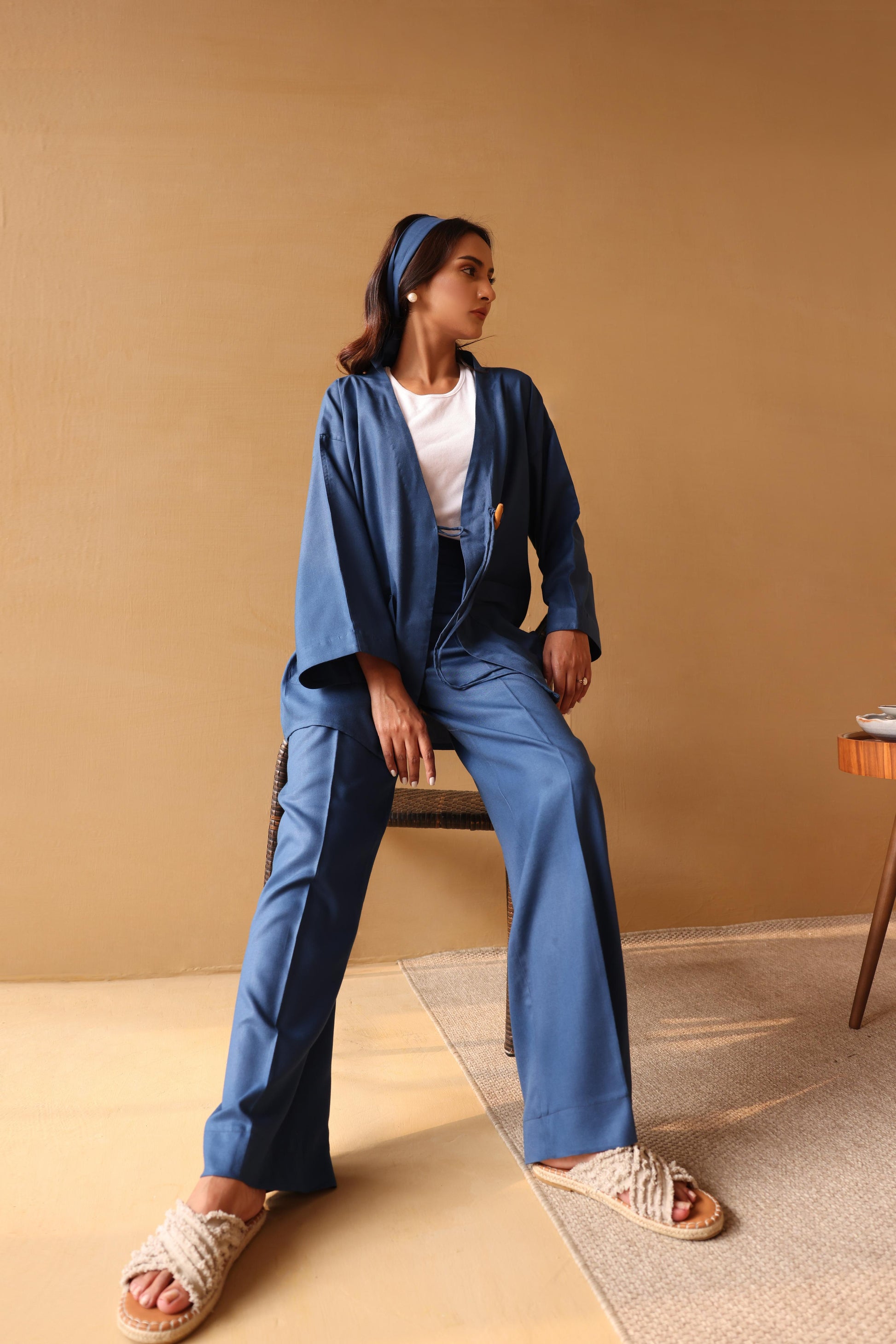 Luna is a matching set in hues of teal blue. It includes a front open shirt with front pockets and toggle button. It comes with same coloured flared pants.