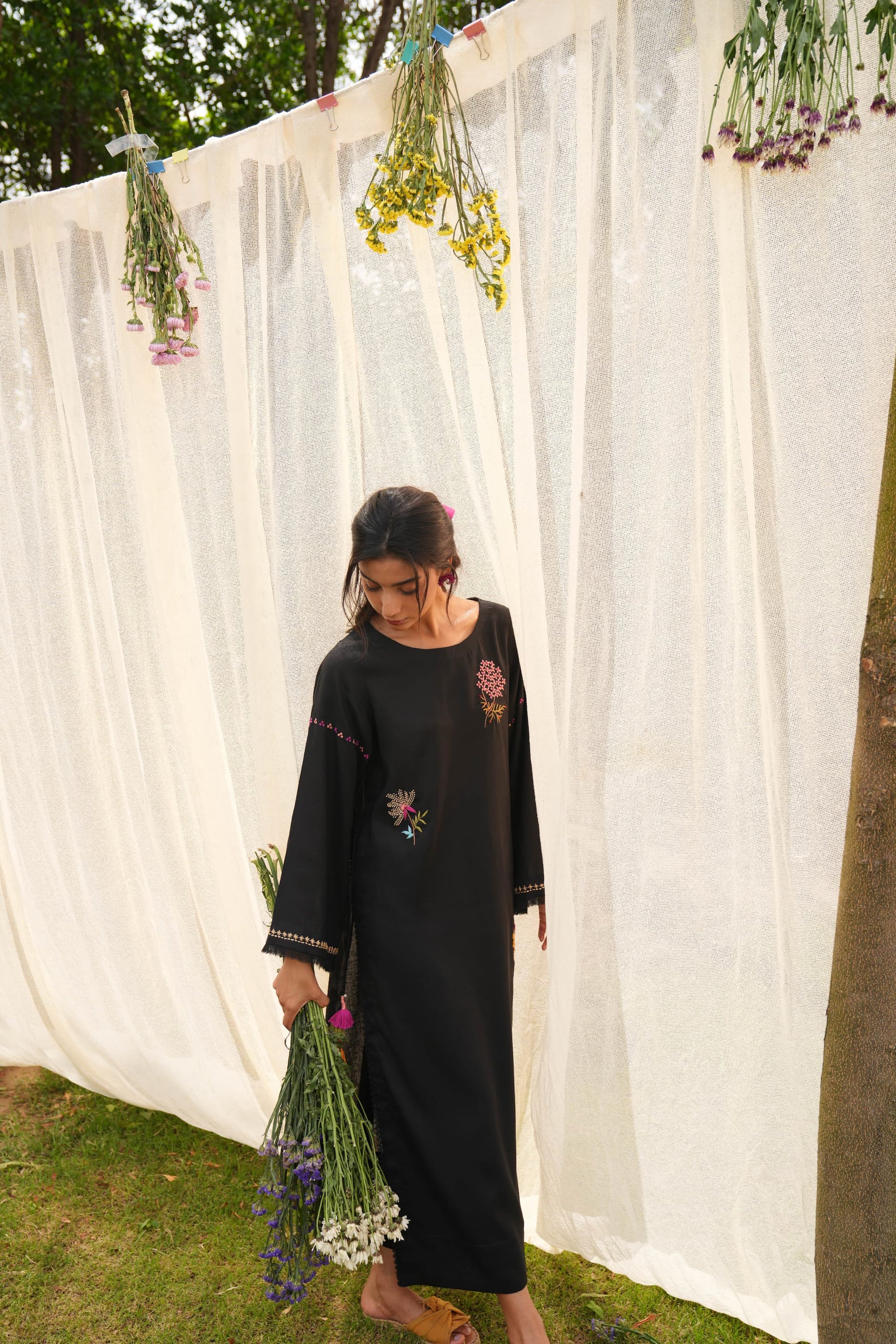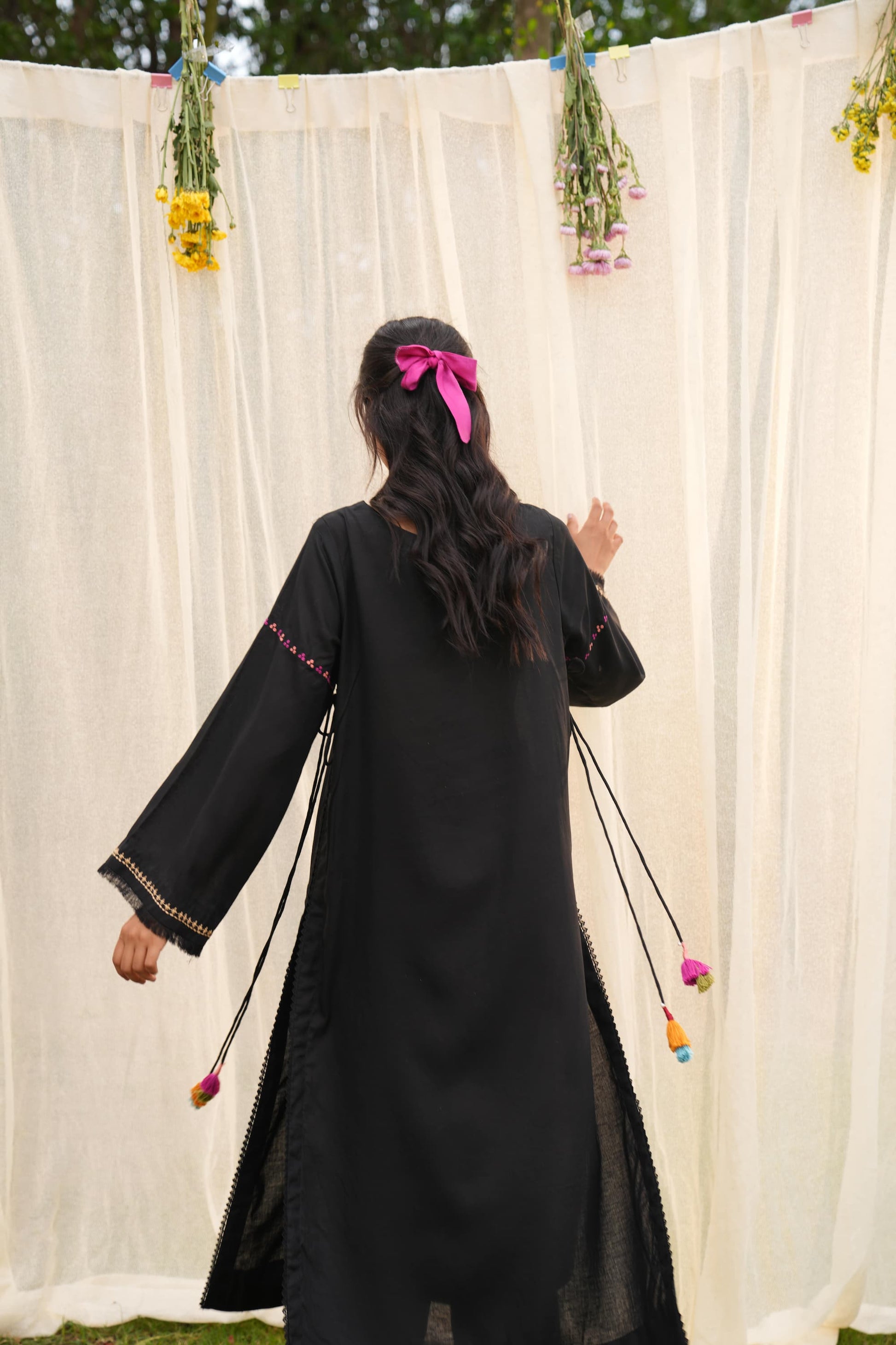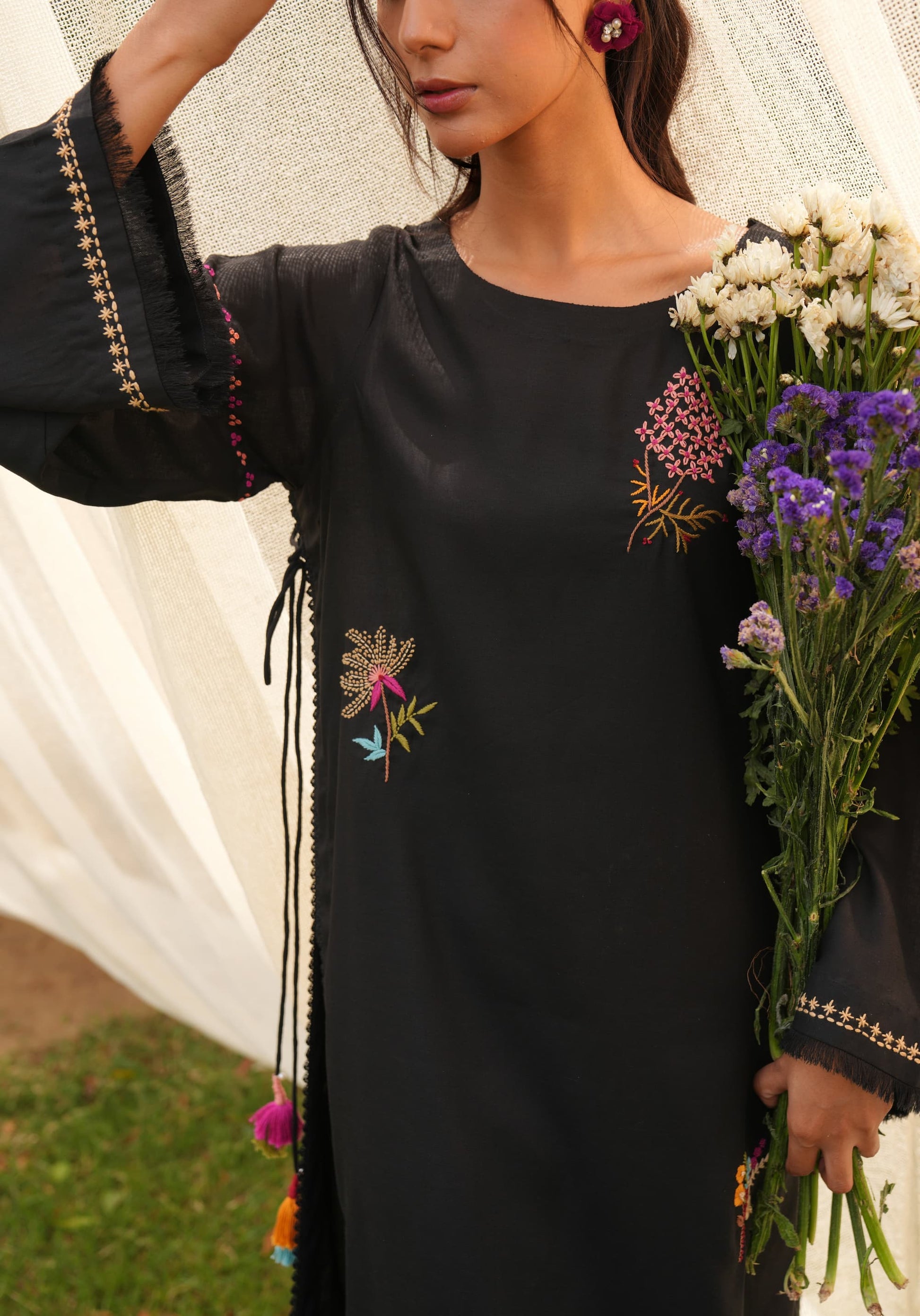 A long black linen silhouette that carries its drama lightly. Finished with delicate lace edgings and bursts of multicoloured floral embroidery scattered across the fabric. Playful tassels dangle from the sides, adding movement and colour to every step. It’s graceful, grounded, and full of little surprises just like you.