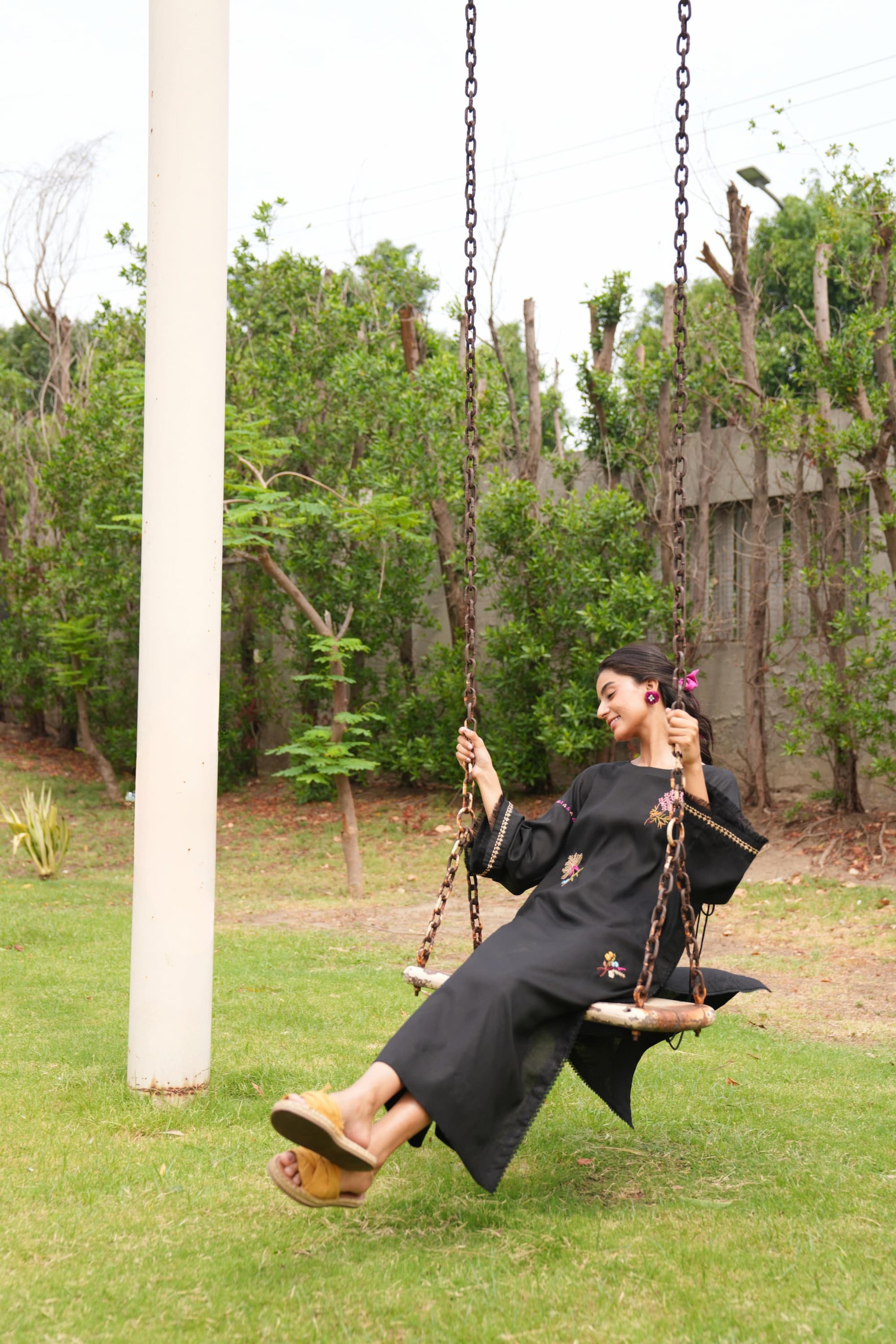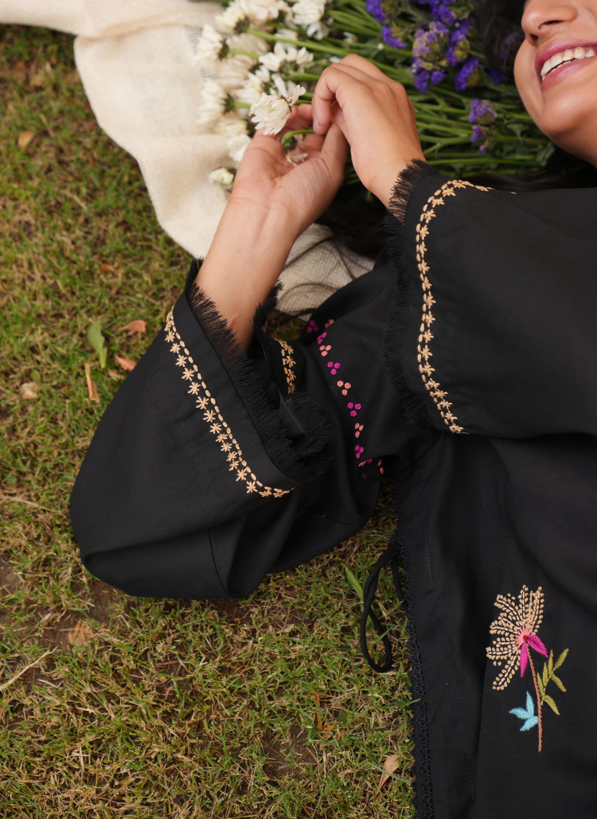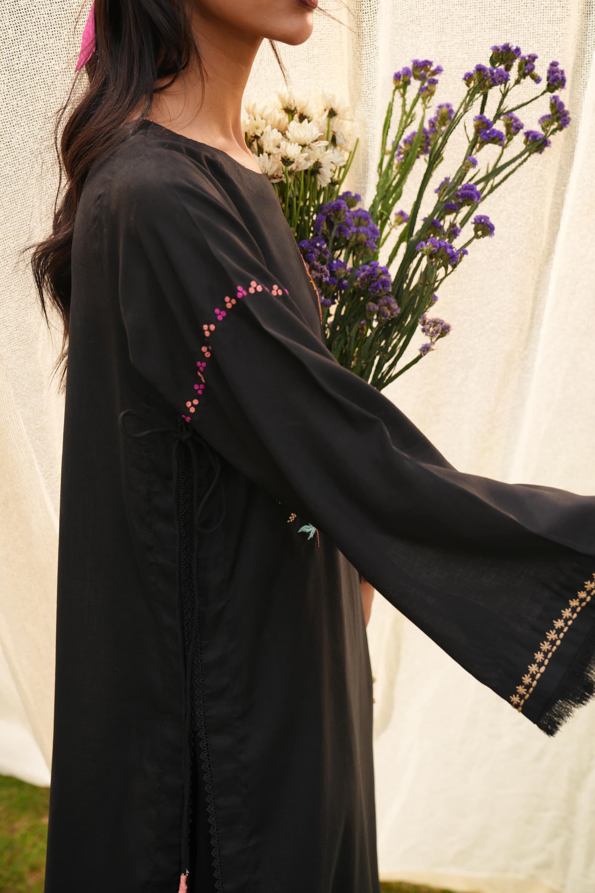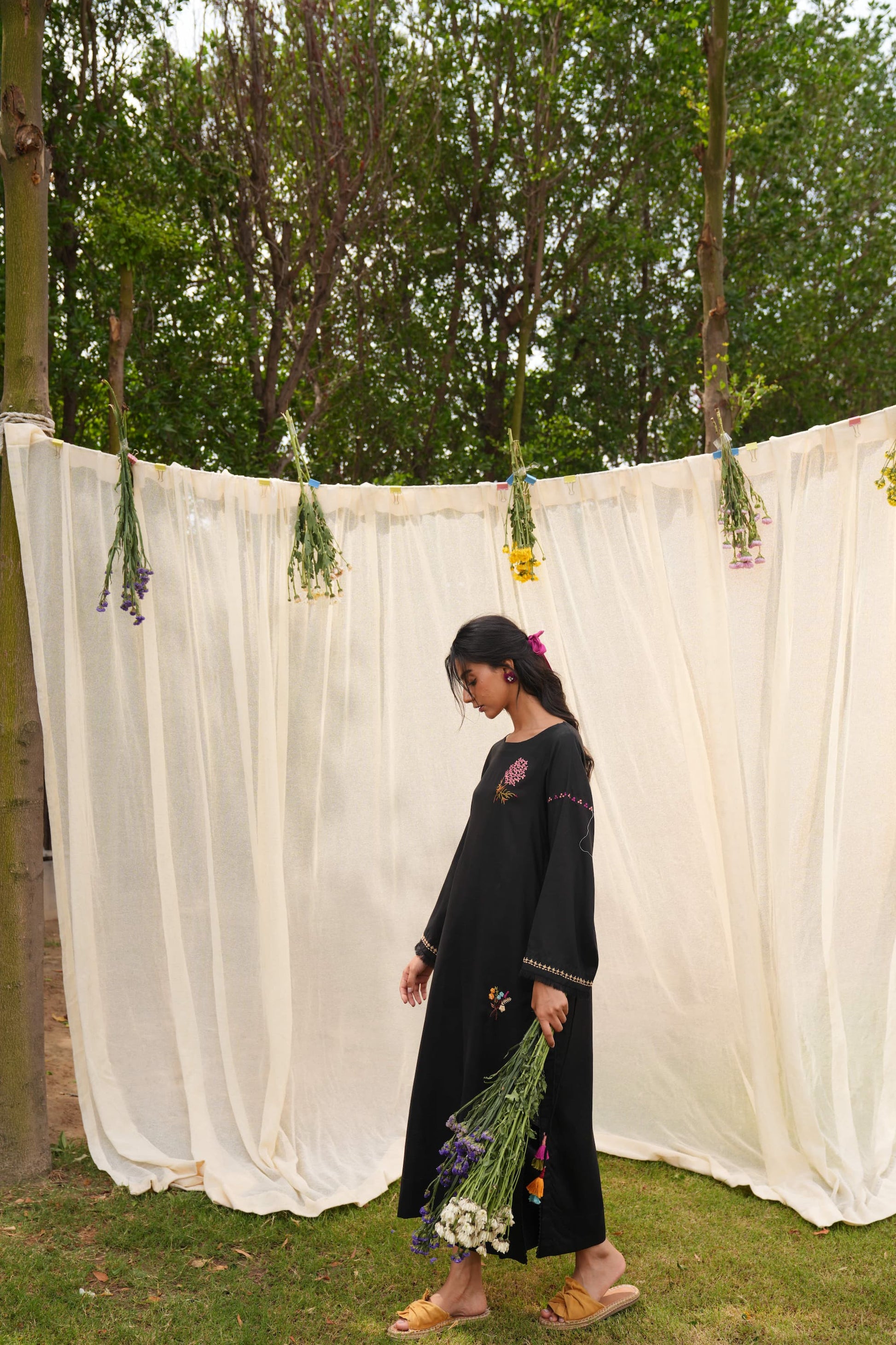 A long black linen silhouette that carries its drama lightly. Finished with delicate lace edgings and bursts of multicoloured floral embroidery scattered across the fabric. Playful tassels dangle from the sides, adding movement and colour to every step. It’s graceful, grounded, and full of little surprises just like you.