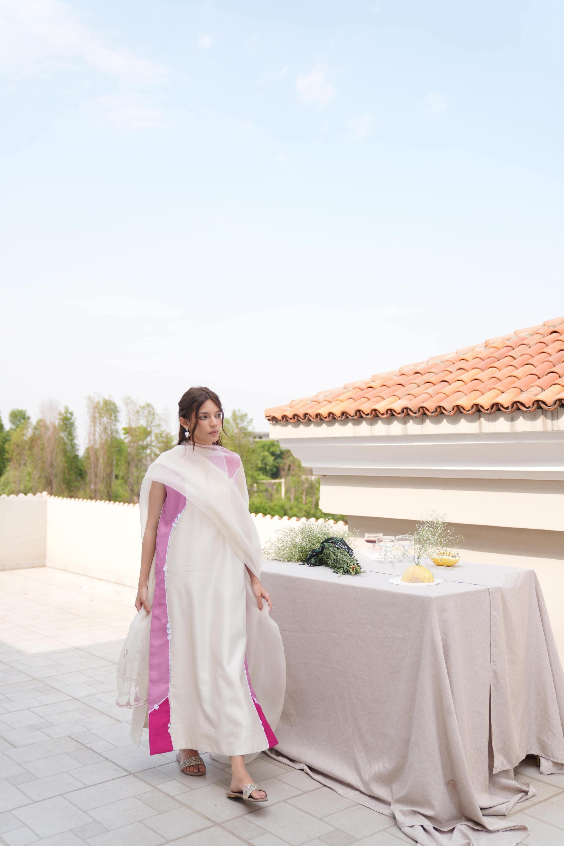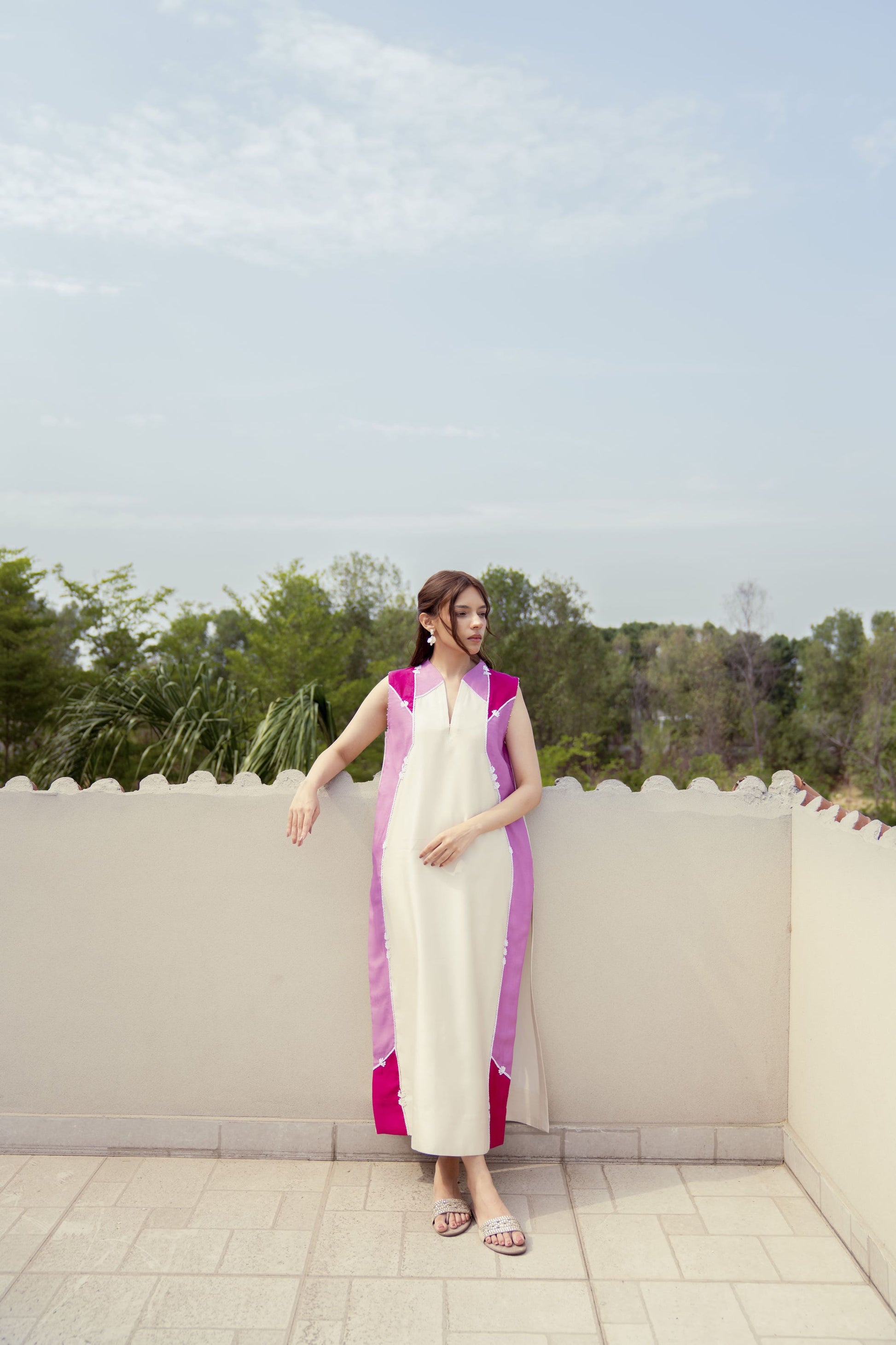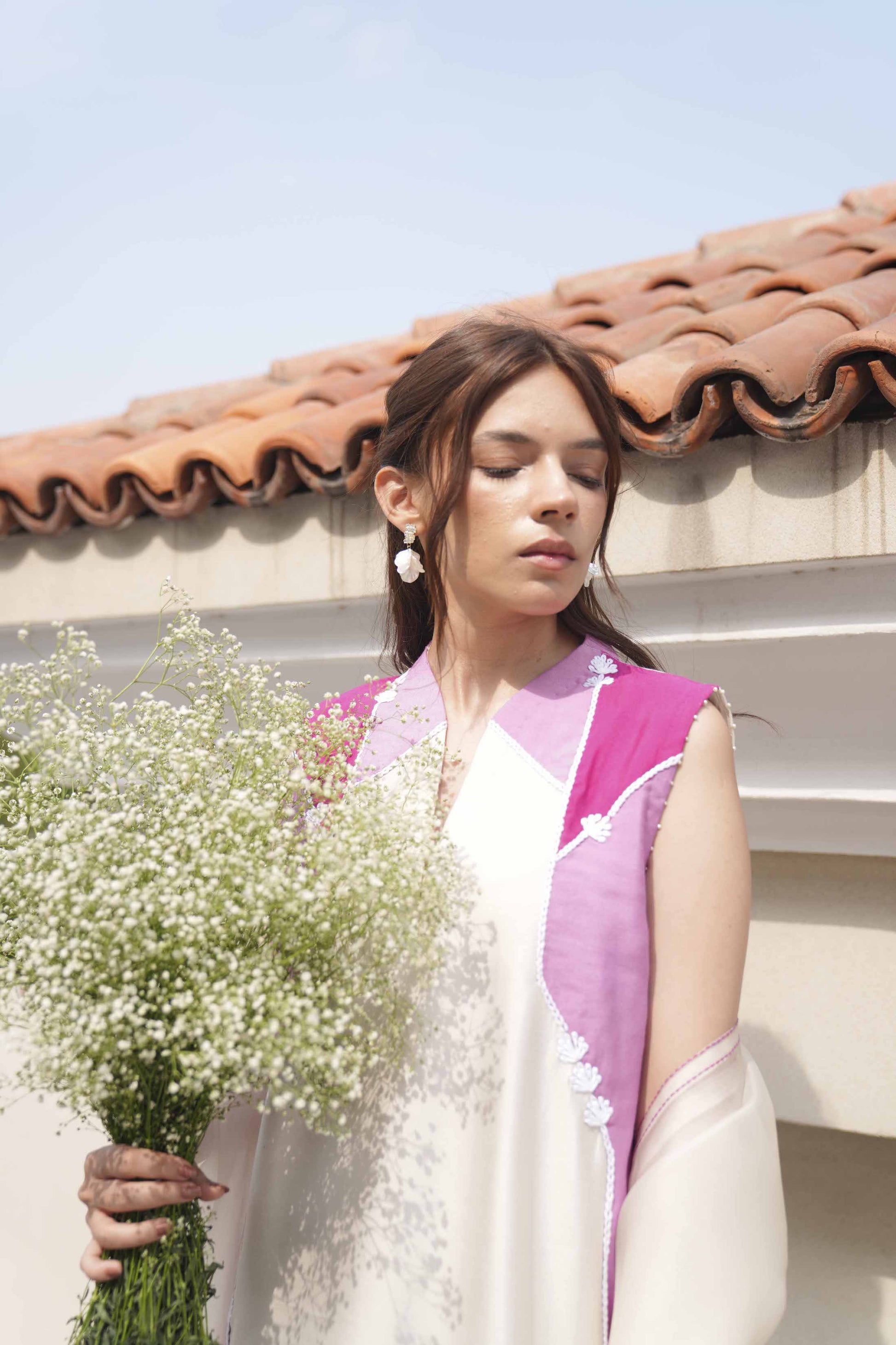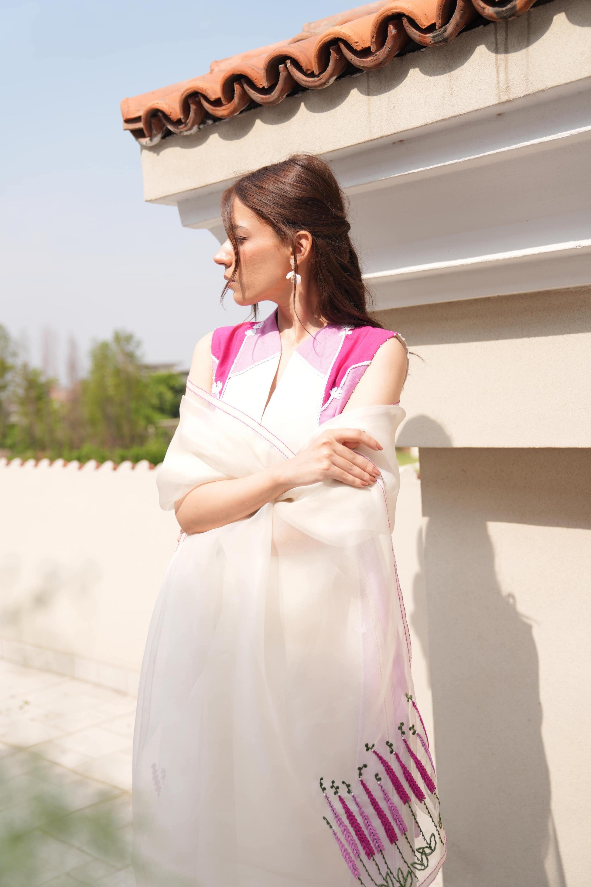 The curving colour blocks in fuschia and lilac contrast beautifully against the ivory net, with delicate white embroidered florals adding an artistic touch.