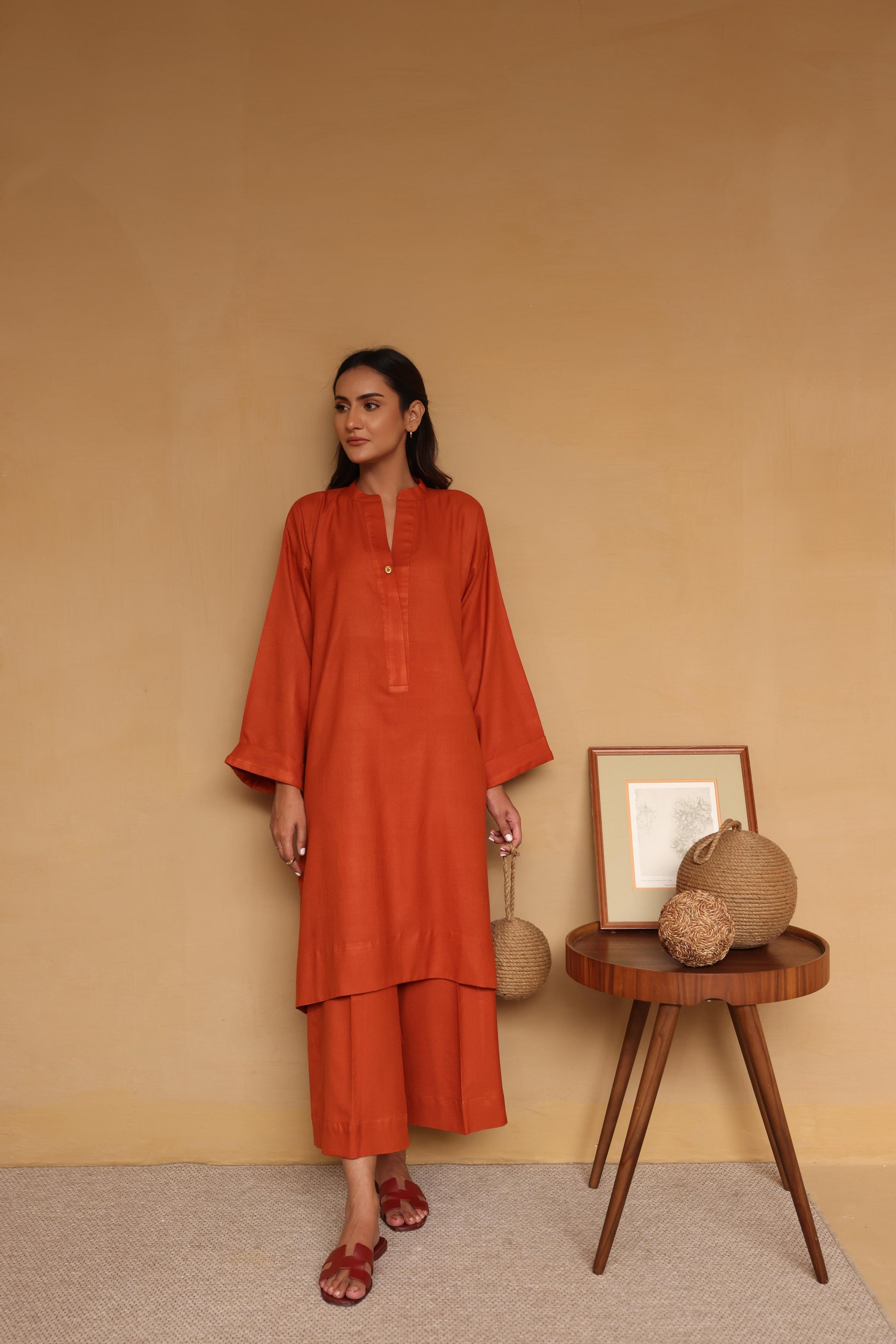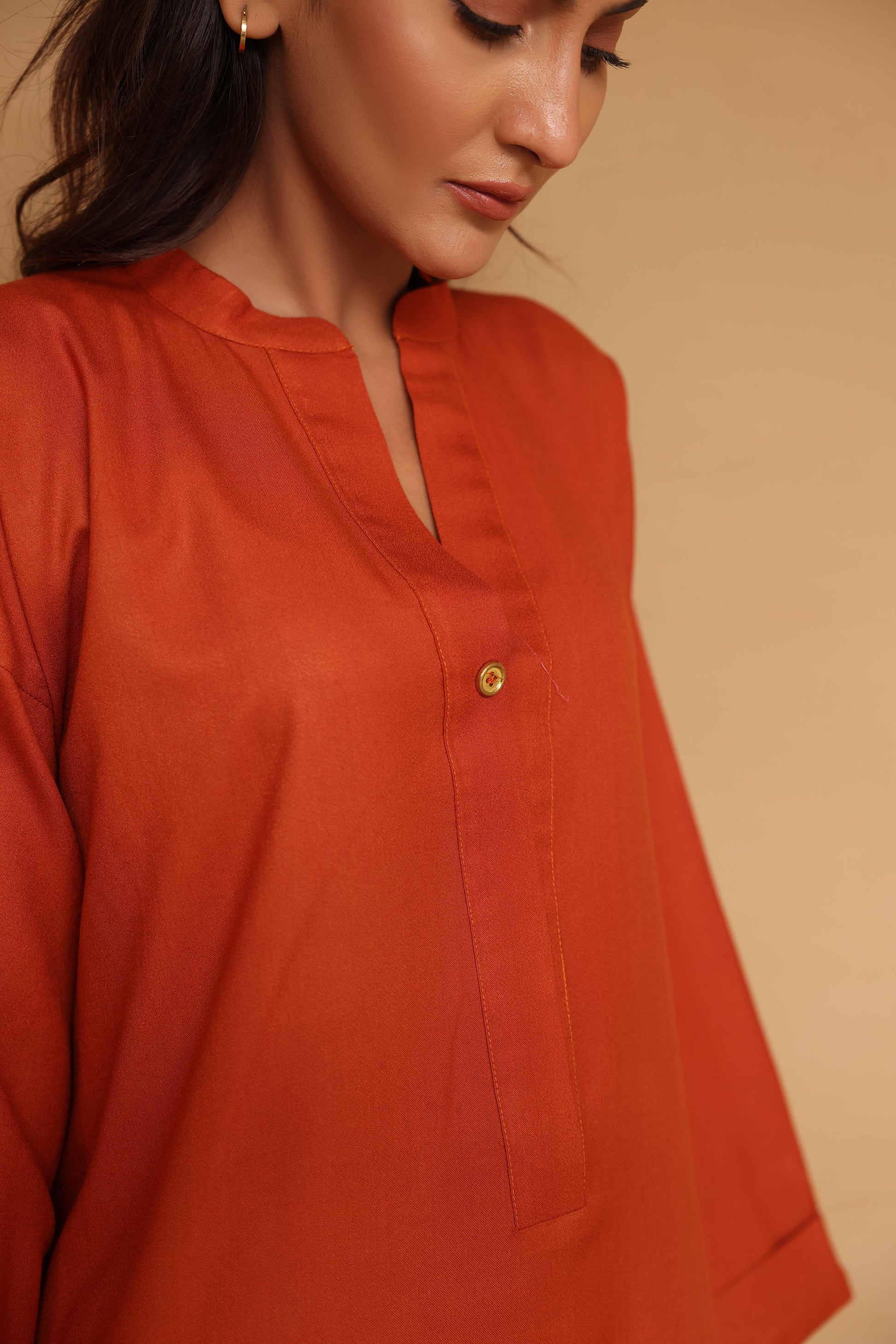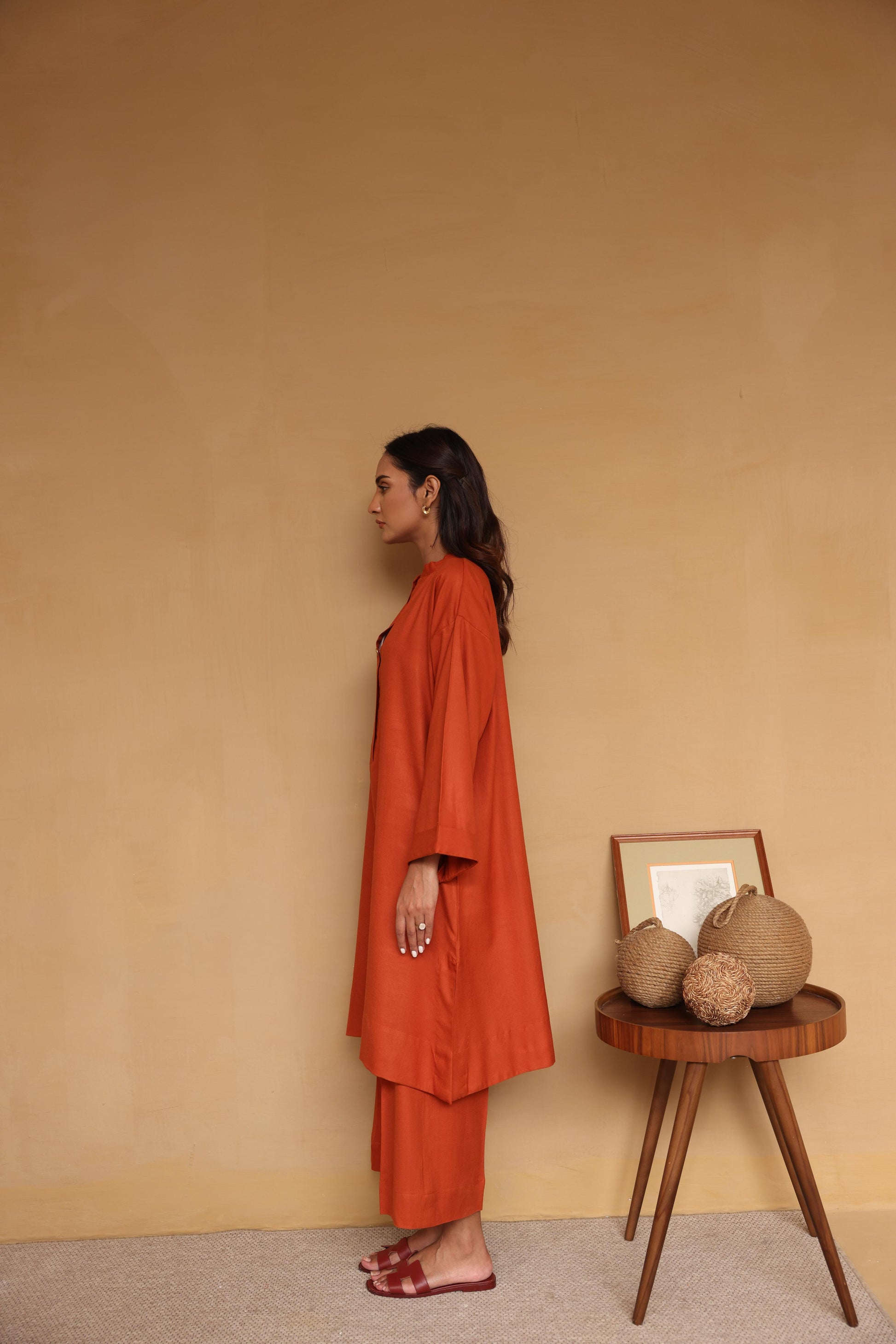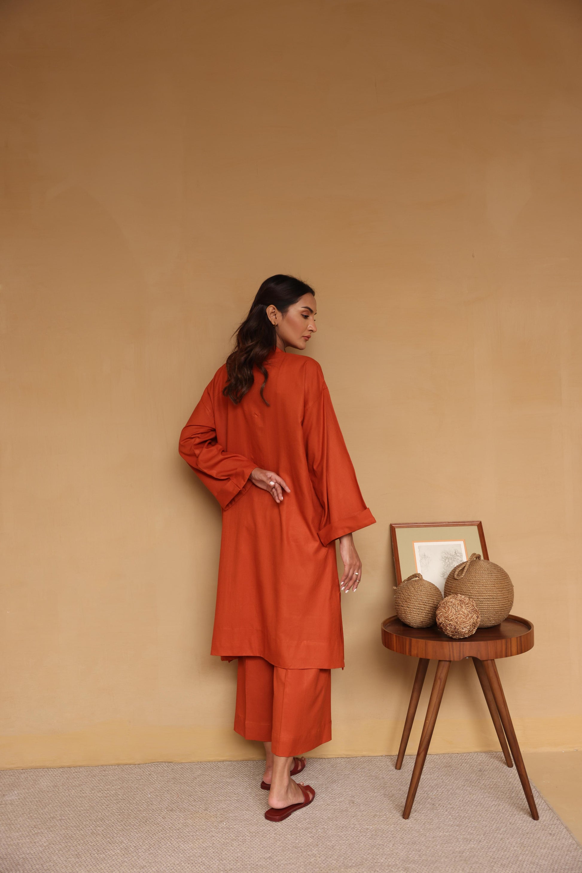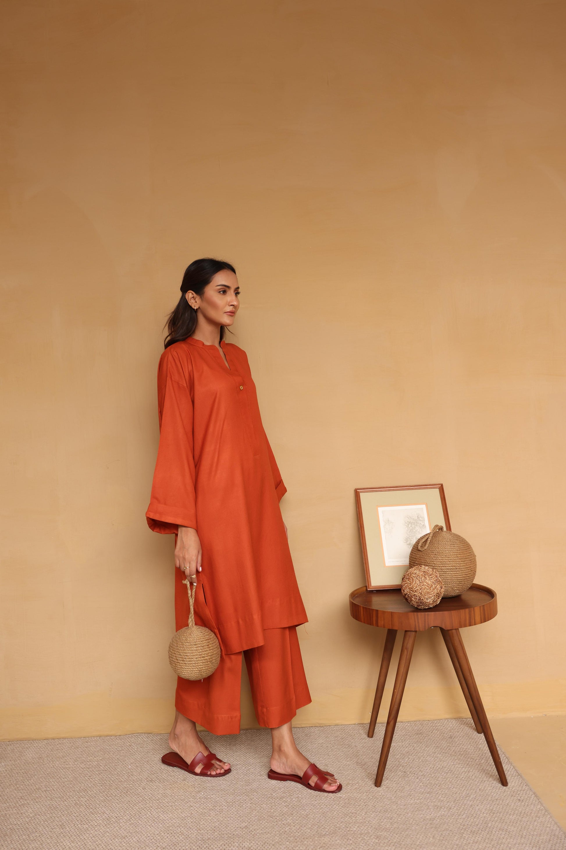 Meya is a tangerine matching set that consists of a minimal shirt with gold button details. It comes with culotte pants.
