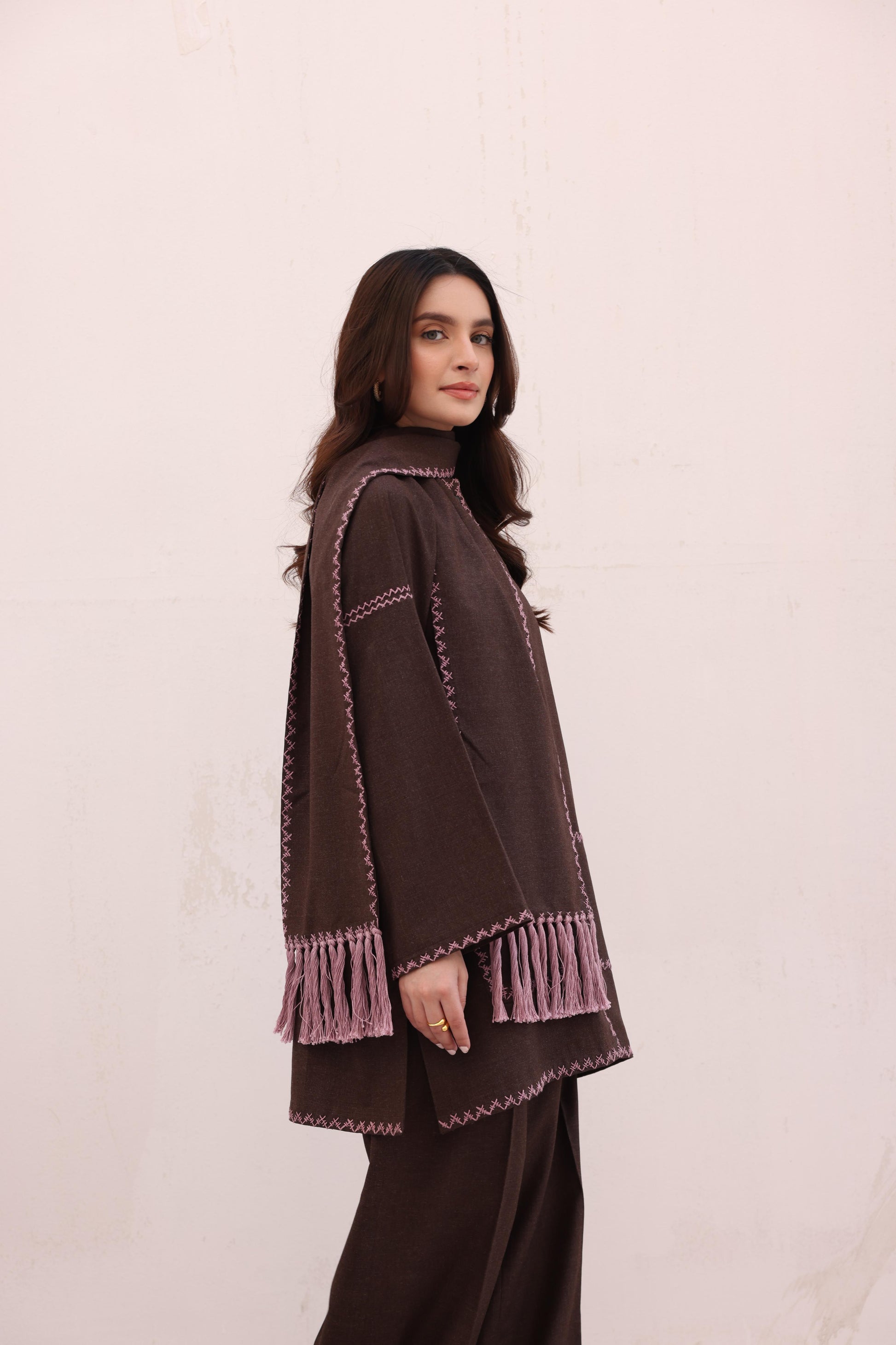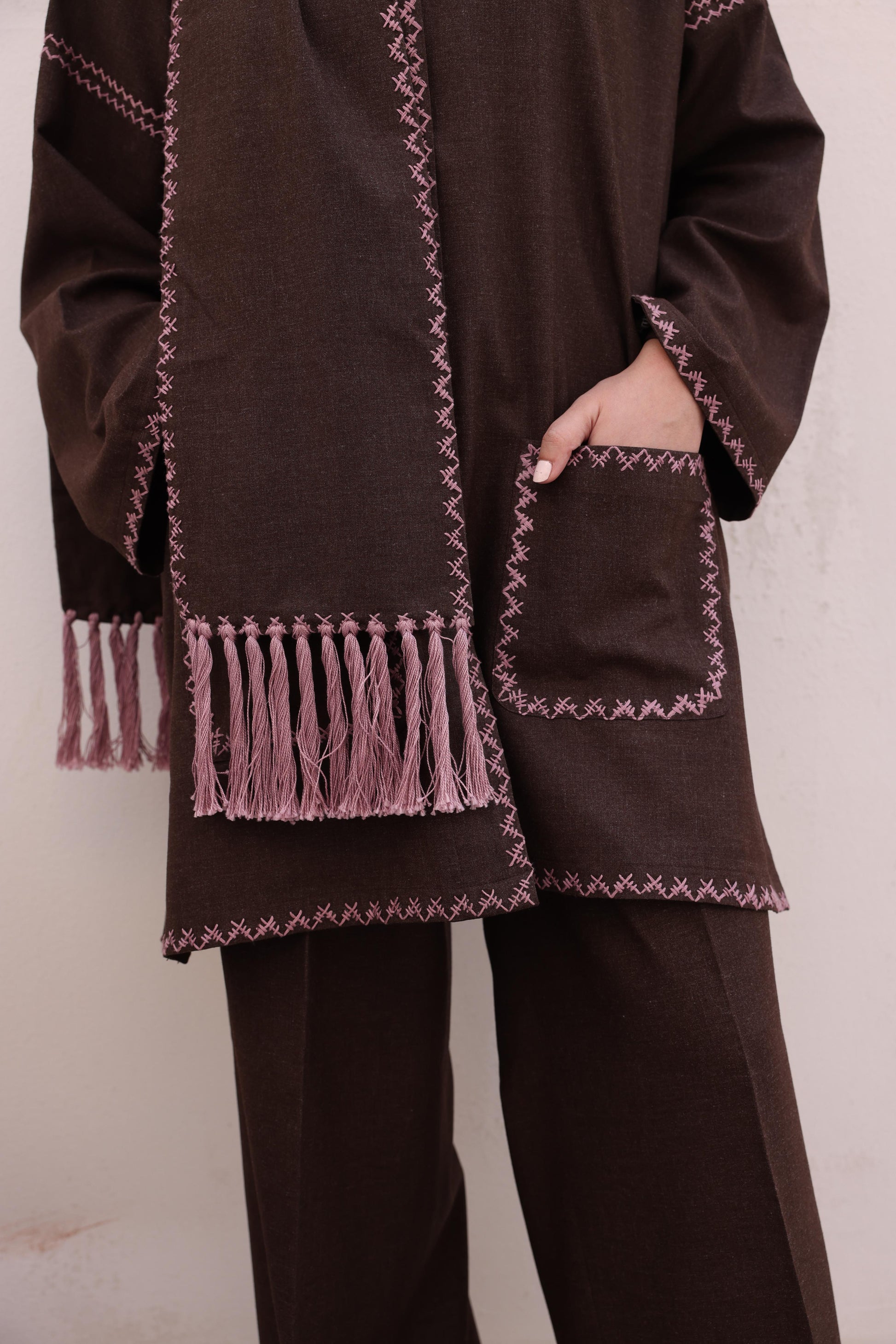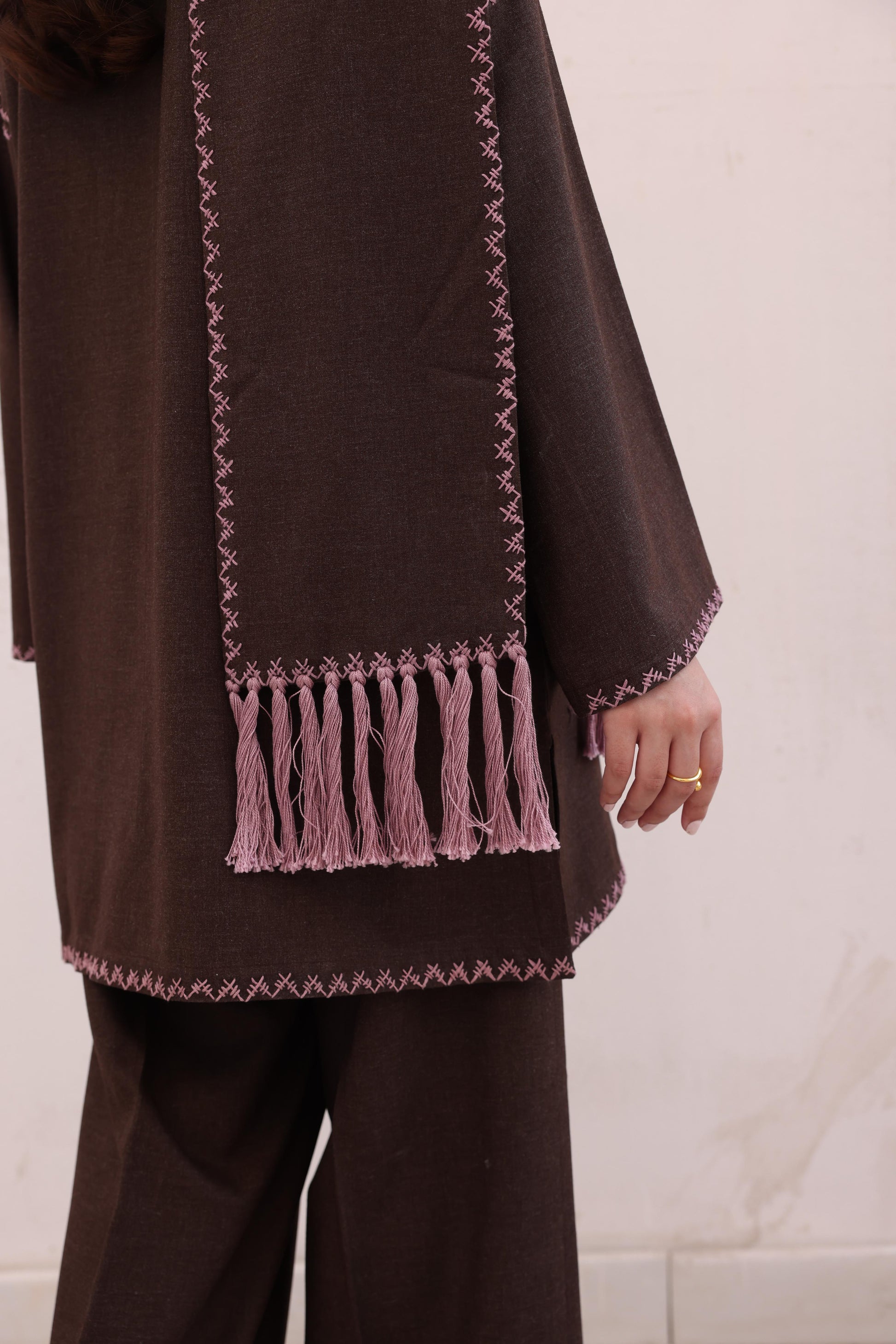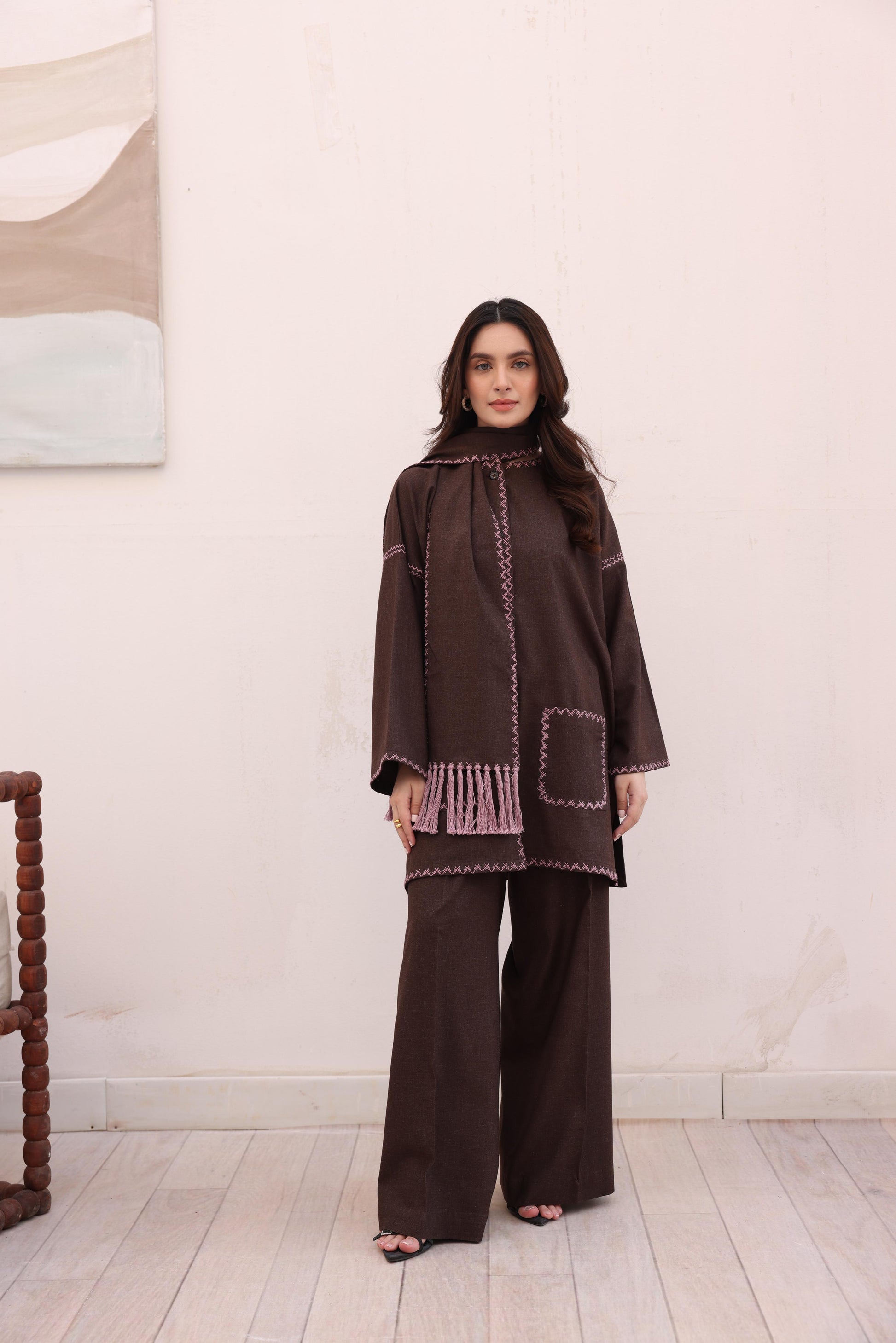 At the point between streamlined elegance and cosy warmth, the Mirana jacket set is a simple stunner that makes winter stylish. Hand embroidered in soft shades of lilac on a warm brown woolen base, this short cut and long flared pants combo feels like a match made in heaven. For a complete look, pair it with our hand embroidered scarf finish and you are good to go.