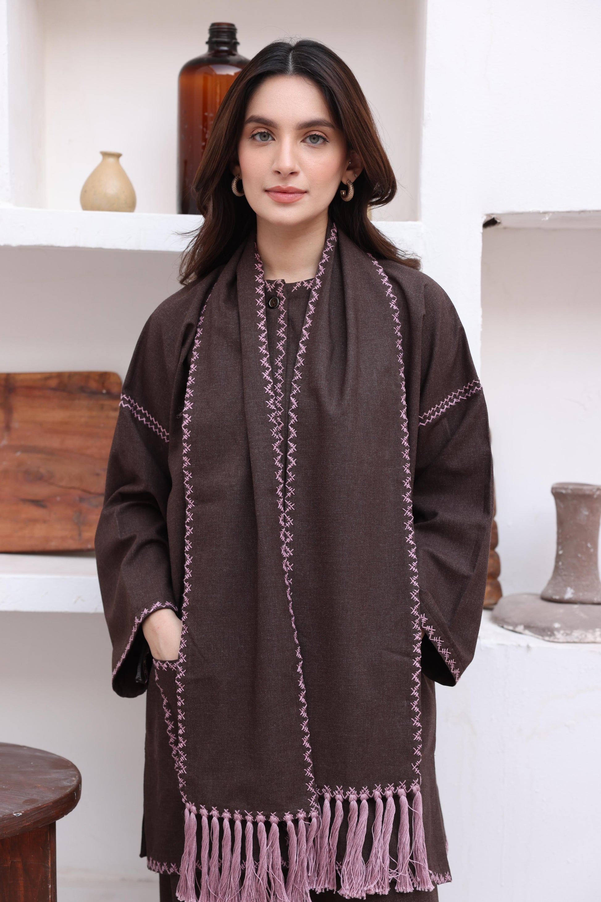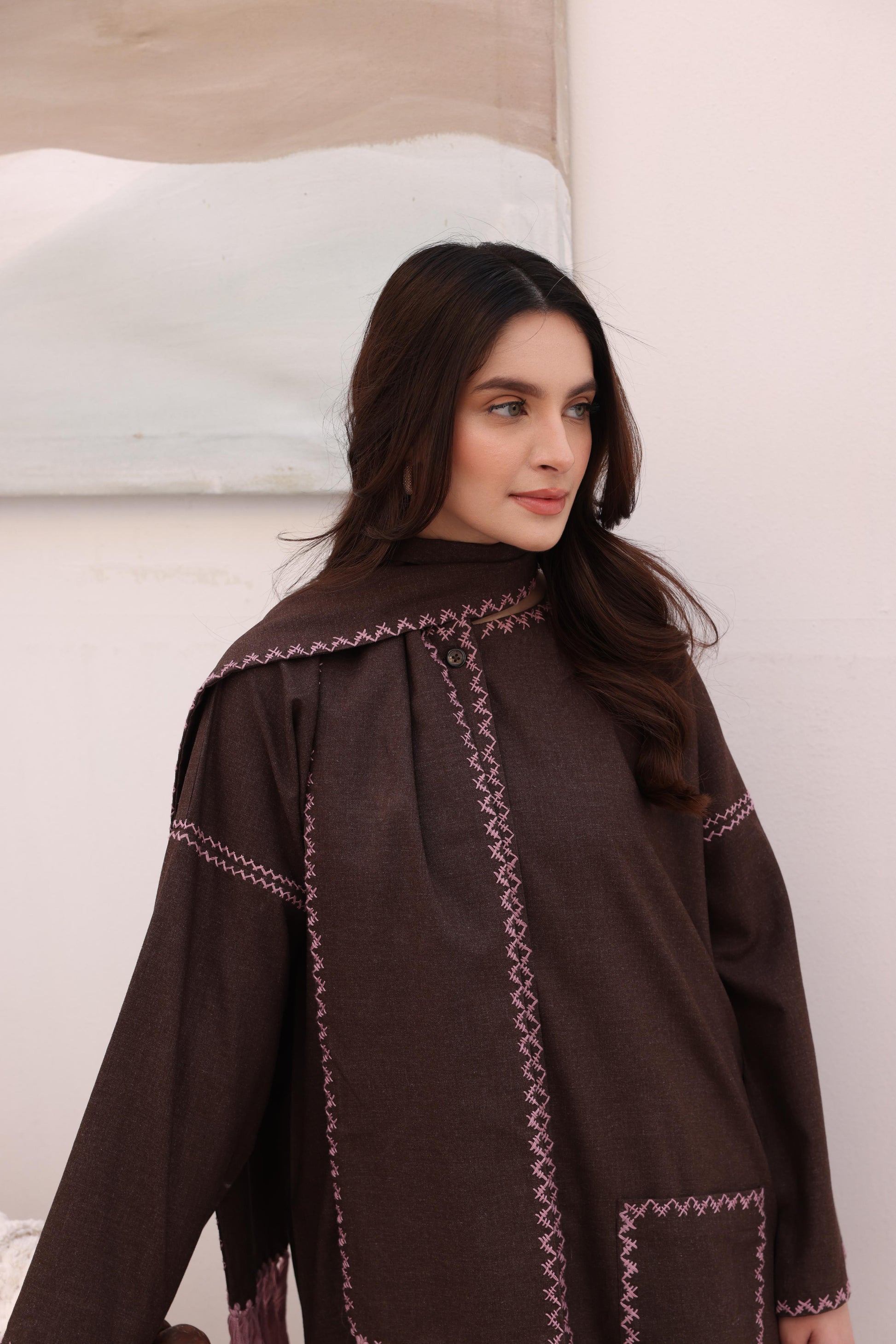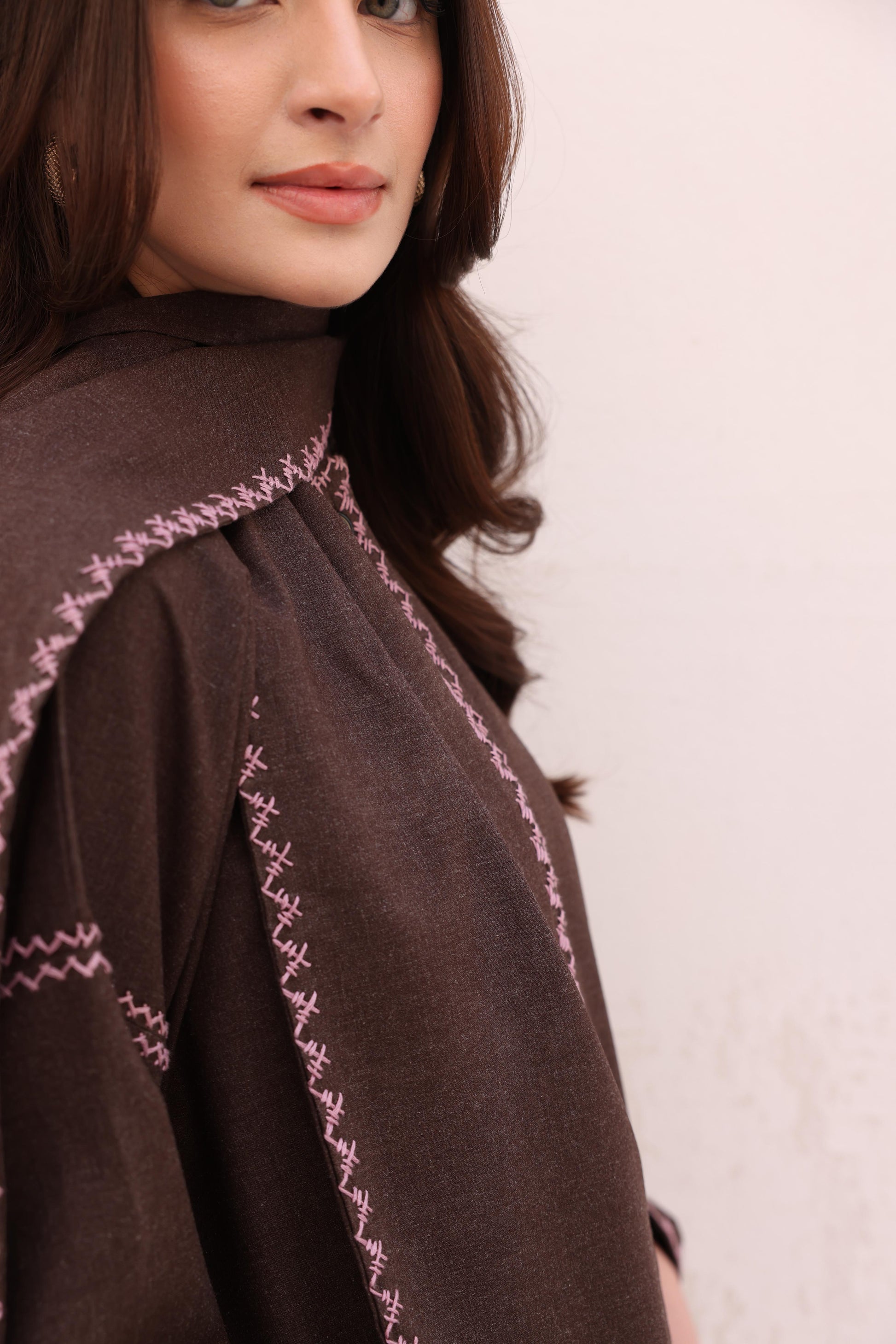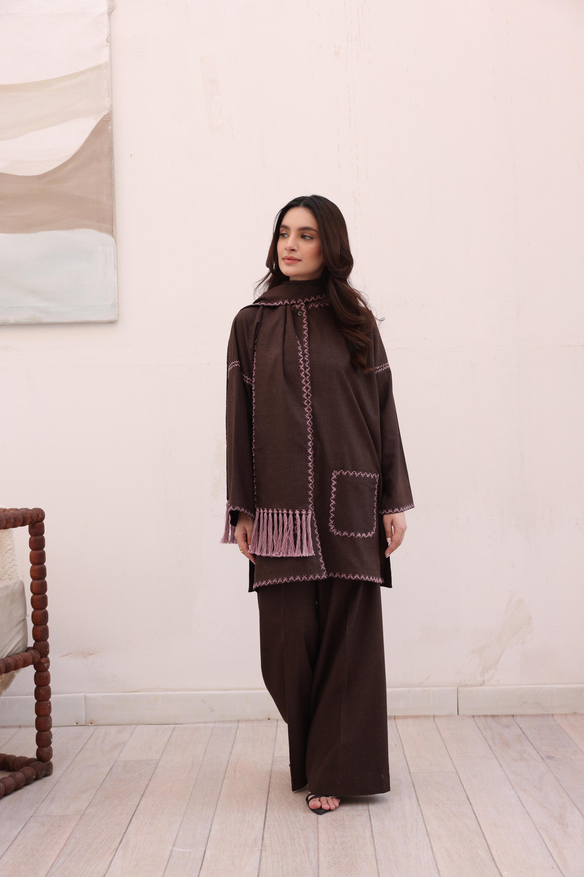 At the point between streamlined elegance and cosy warmth, the Mirana jacket set is a simple stunner that makes winter stylish. Hand embroidered in soft shades of lilac on a warm brown woolen base, this short cut and long flared pants combo feels like a match made in heaven. For a complete look, pair it with our hand embroidered scarf finish and you are good to go.