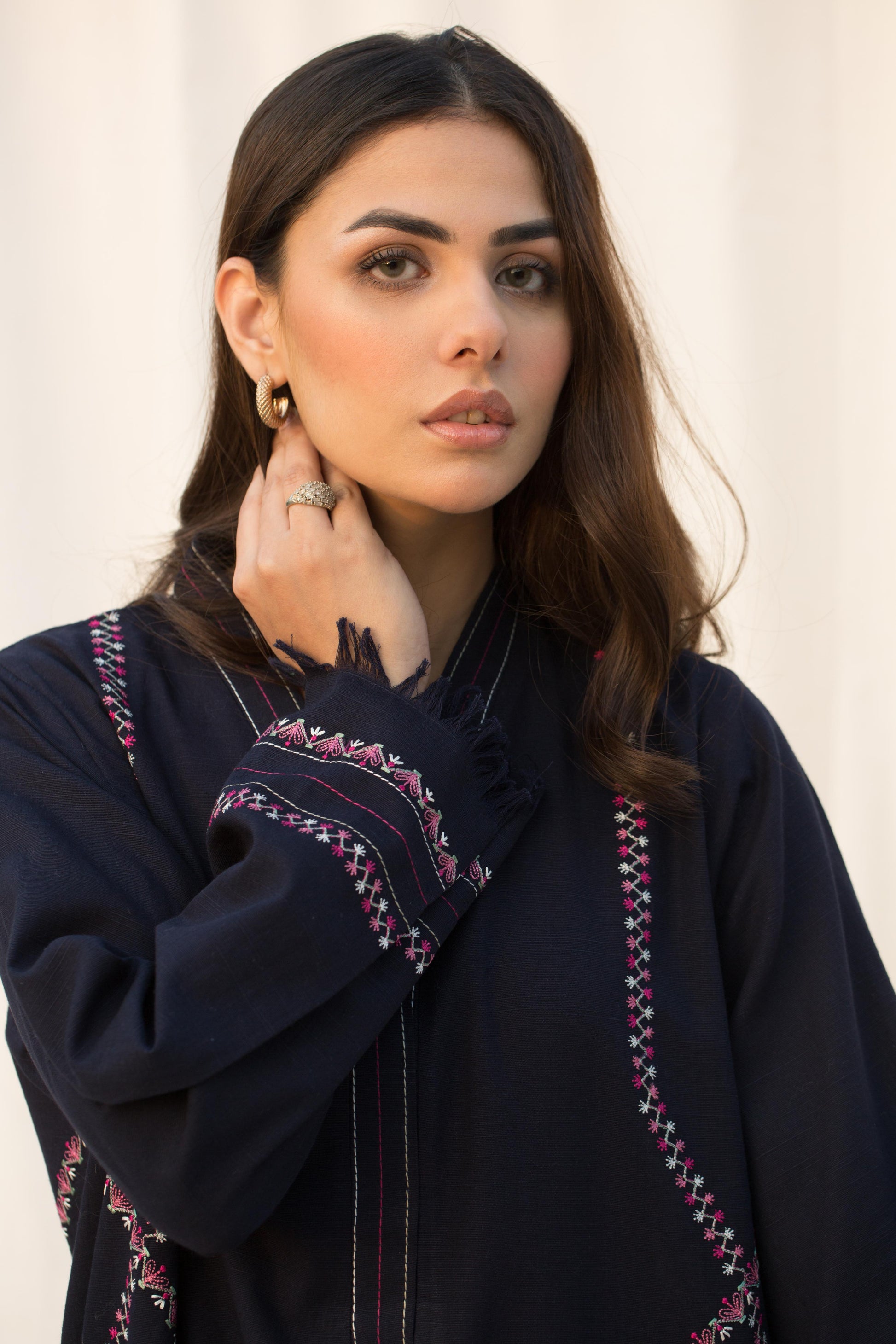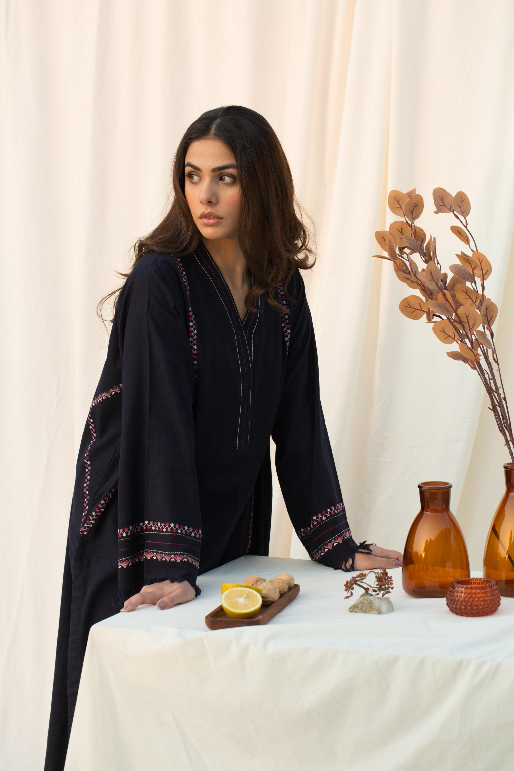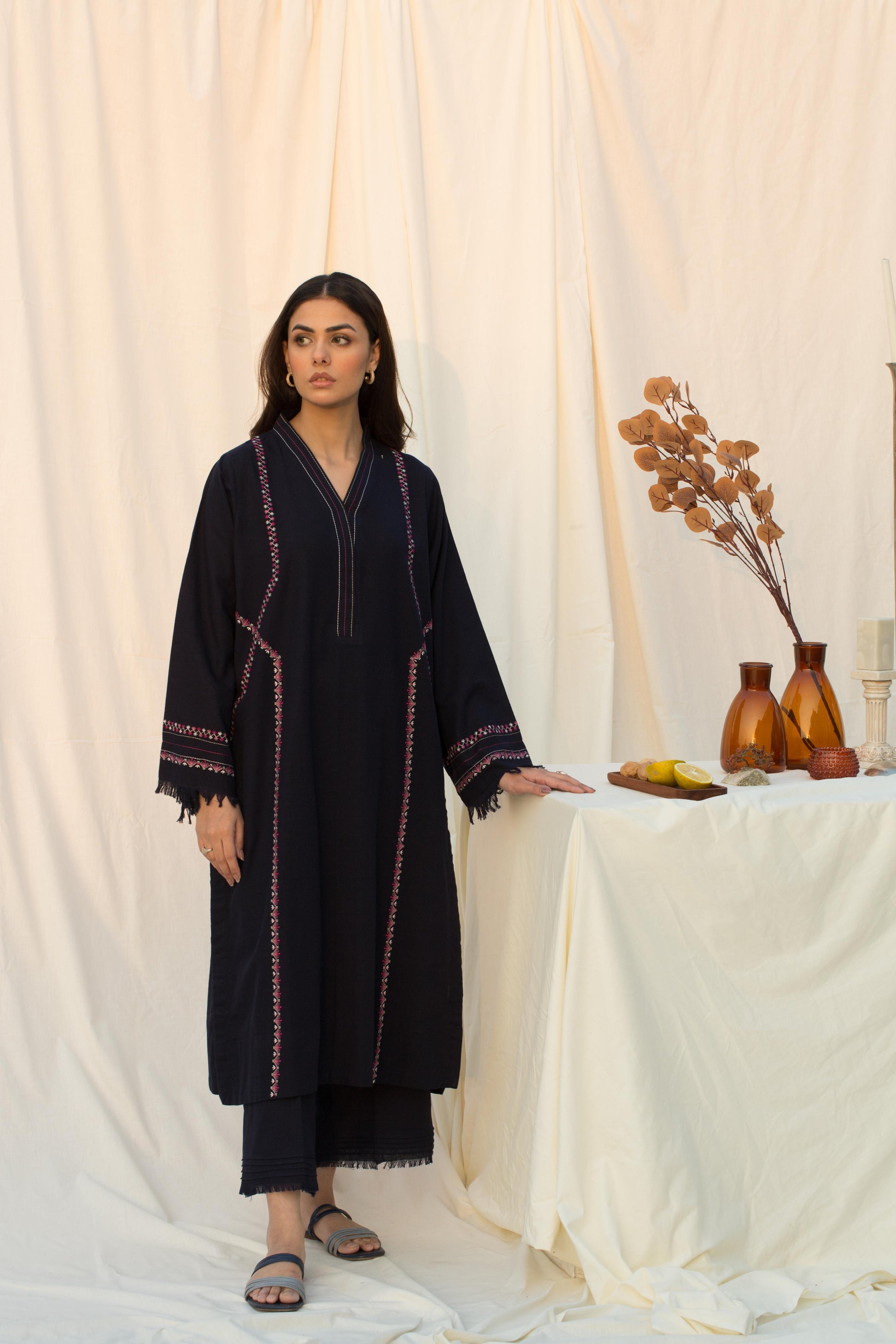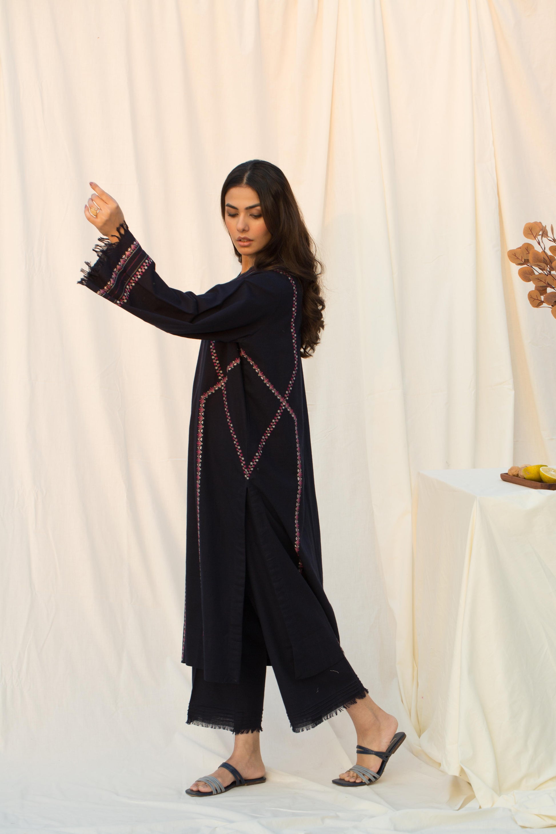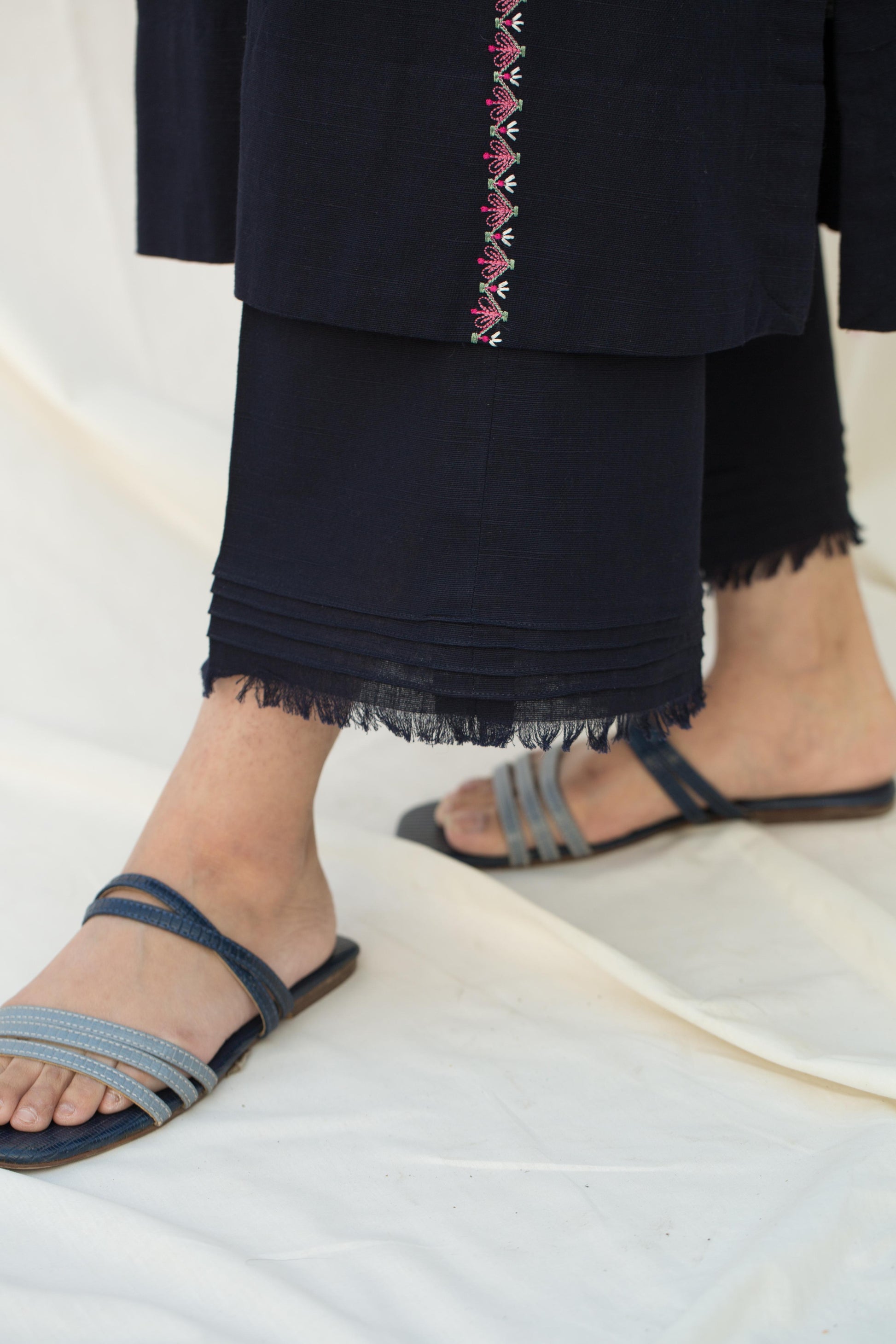 Navy and pink, match made in heaven! Sarah matching set includes an embroidered shirt in our signature linear pattern and pants with little pleated details.