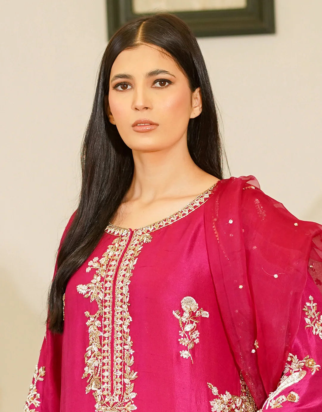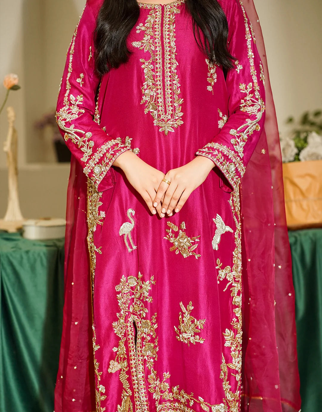 This outfit is a showcase of timeless elegance. Our signature pure silk traditional magenta kurta is a work of art, adorned with delicate hand embroidery in gold and silver zardozi. It’s complemented by a hand embroidered magenta pure silk izaar and a stunning pure organza magenta dupatta with intricate hand embroidery, making it the epitome of sophistication and style.