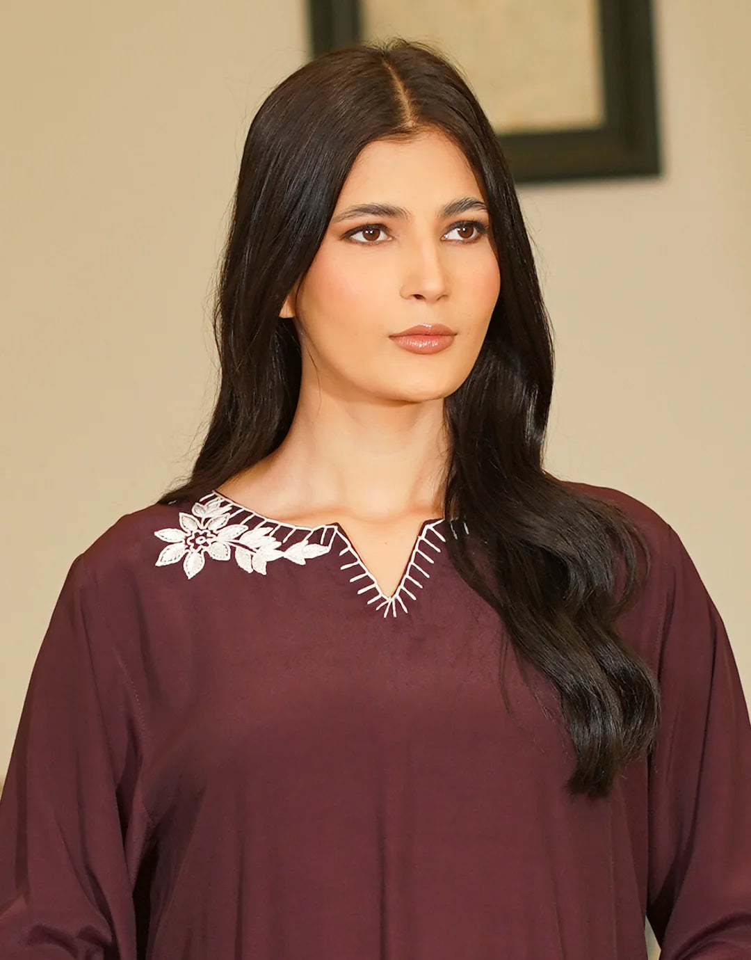 This elegant two-piece dress is crafted from soft, flowing georgette fabric, offering a graceful drape and comfortable fit. The rich maroon hue is beautifully enhanced with delicate floral embroidery adorning the neckline, shirt front, and arms, adding a touch of charm and sophistication. The shirt features a relaxed silhouette, ideal for casual outings or semi-formal gatherings, while the matching georgette trousers provide effortless comfort and style. Perfect for creating a refined yet relaxed look, this ensemble combines timeless elegance with modern design.