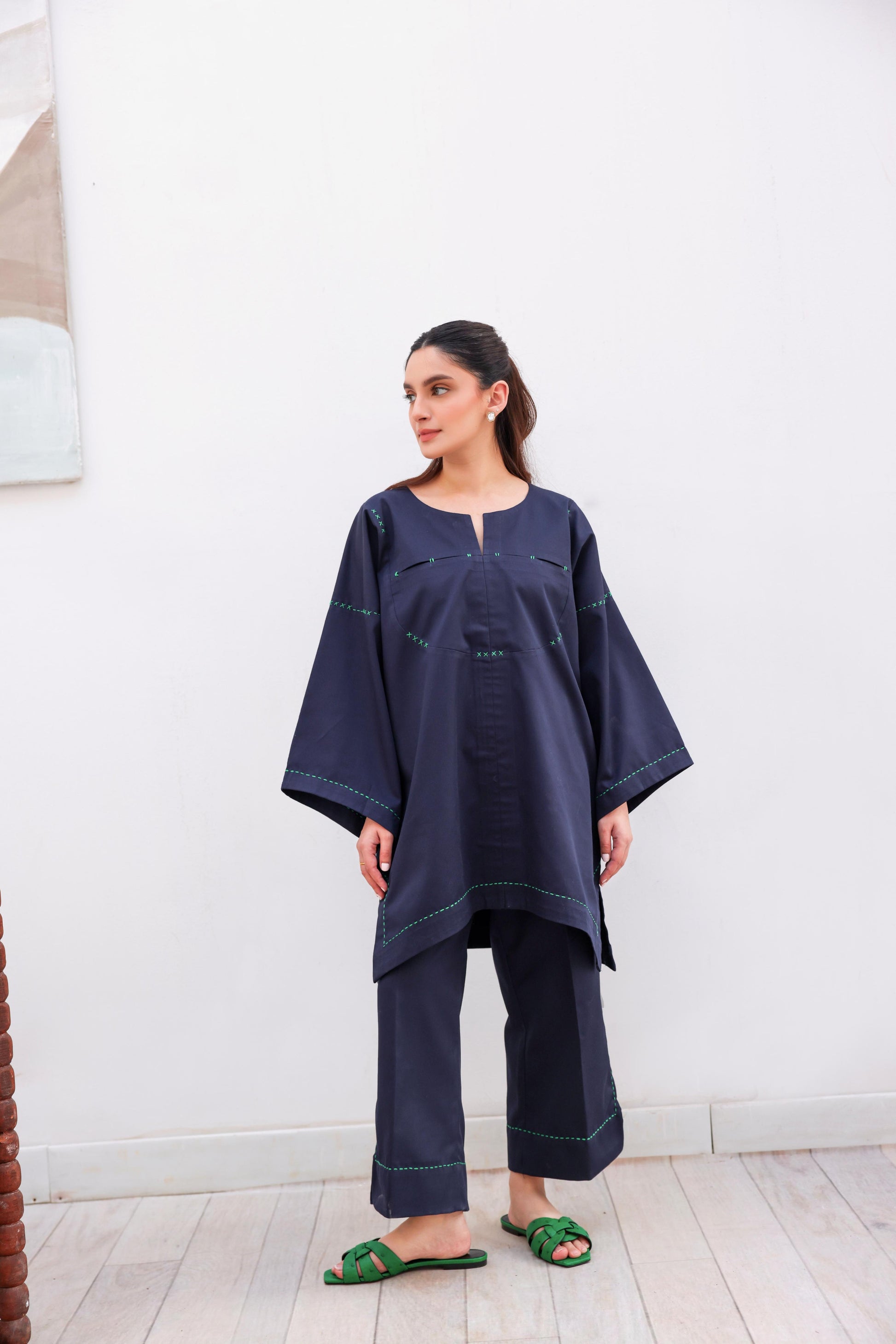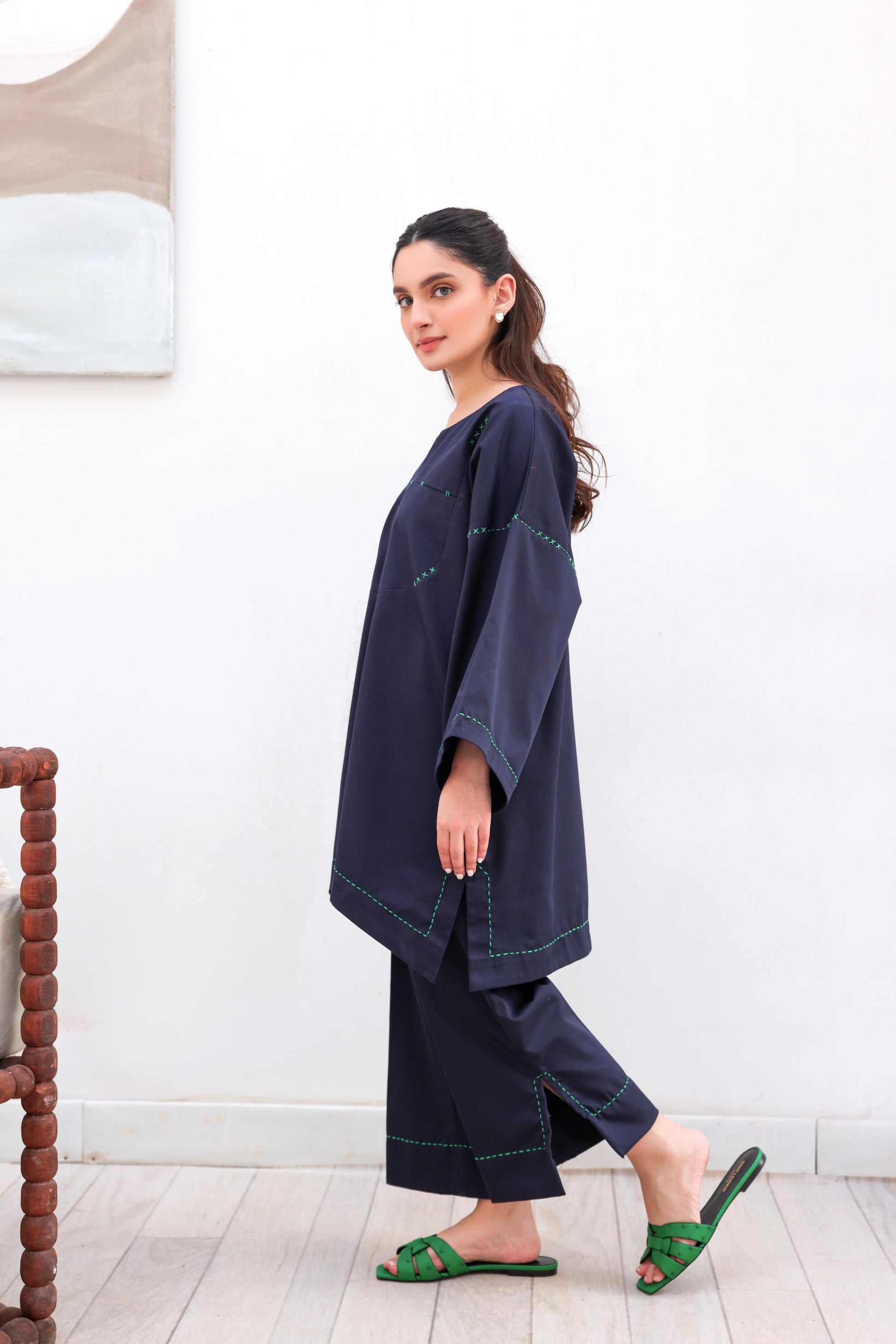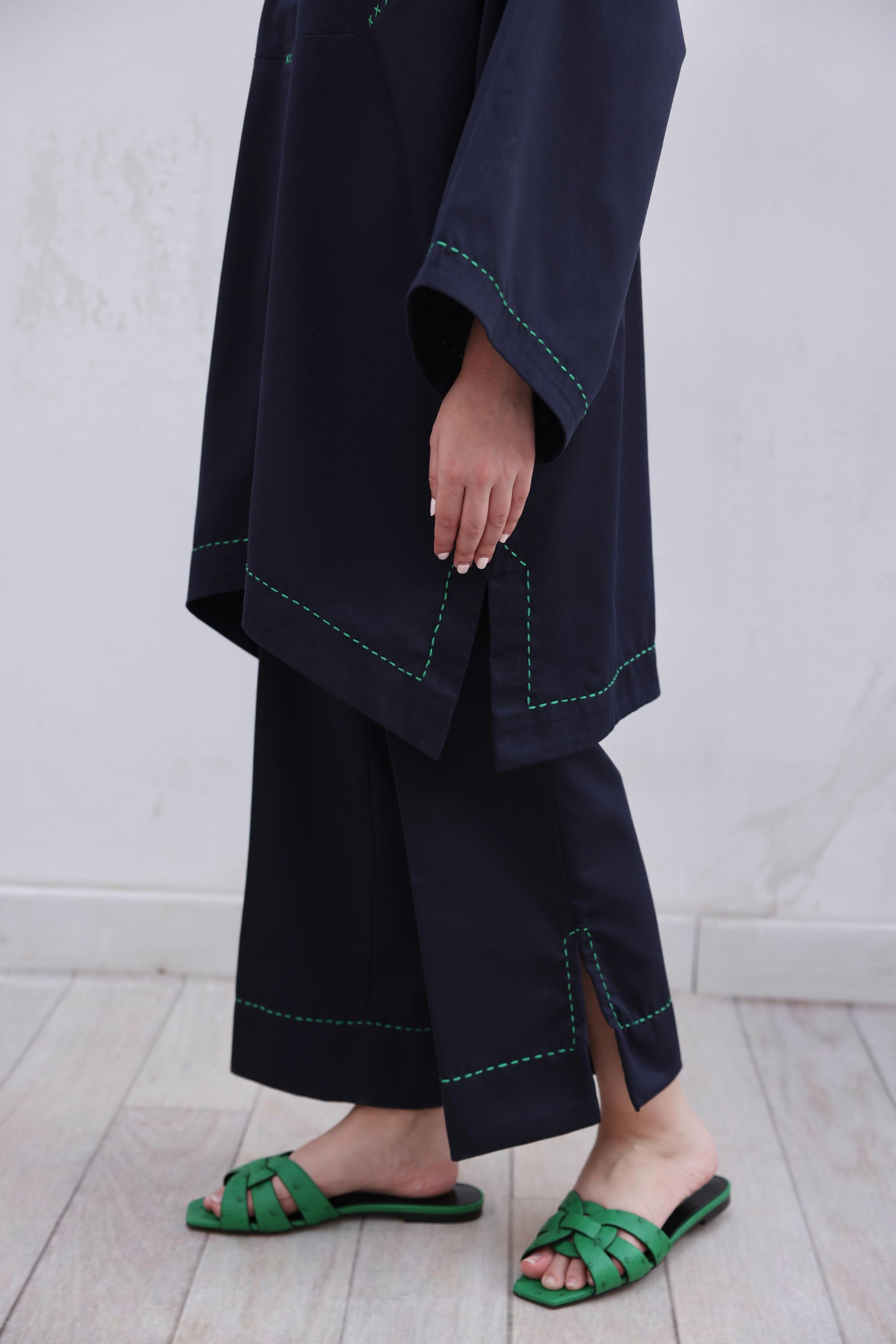 A perfect blend of comfort and style. Gabardine - tightly woven semi-stiff wool in navy blends seamlessly with delicate green stitch details. Our rafa set is a winter must-have. Comes complete with matching pants.