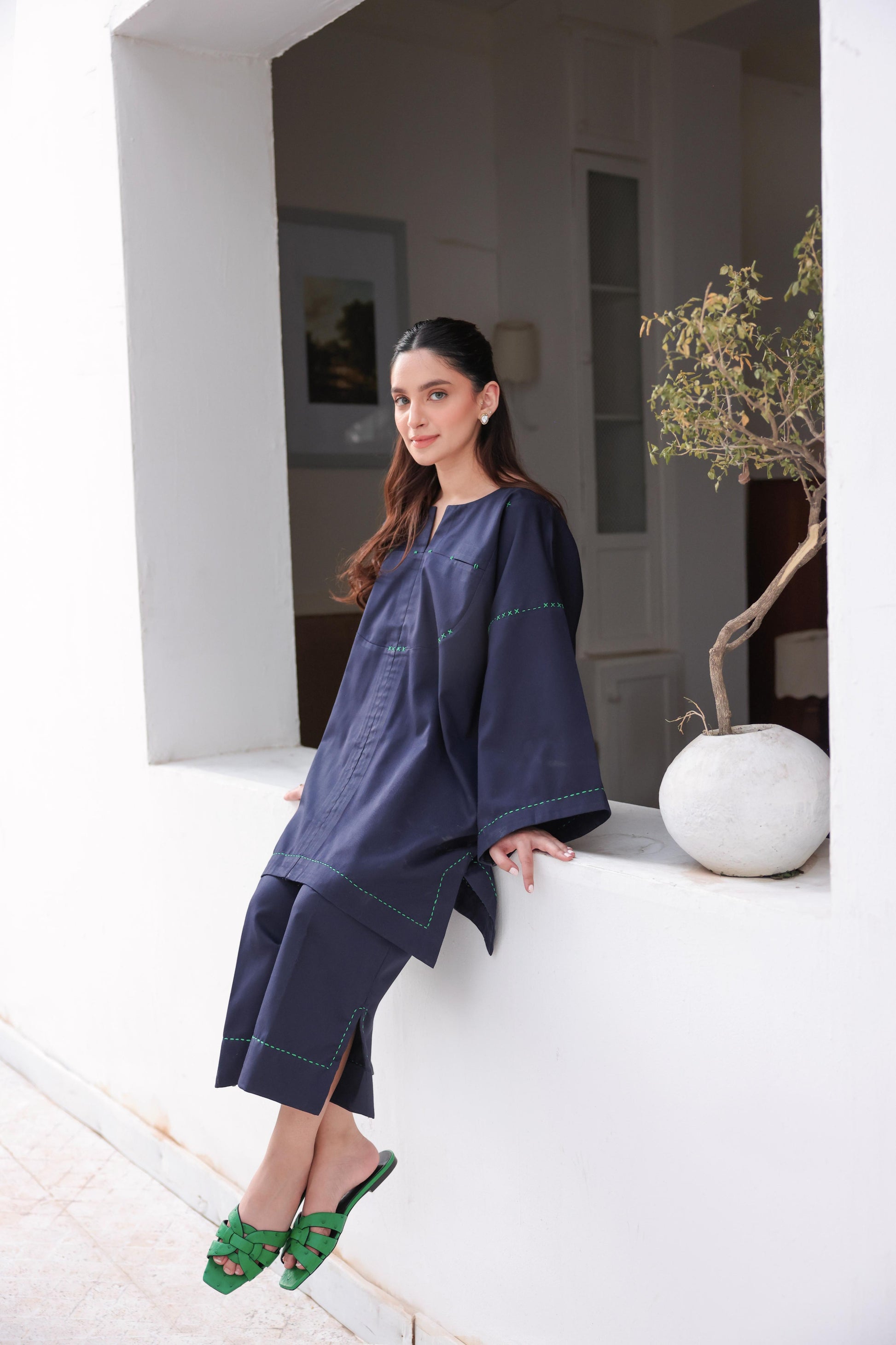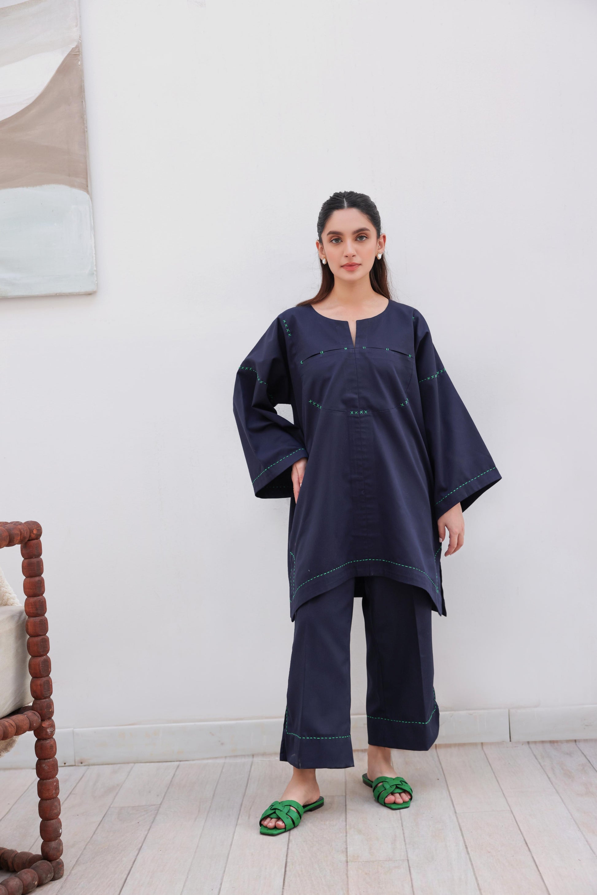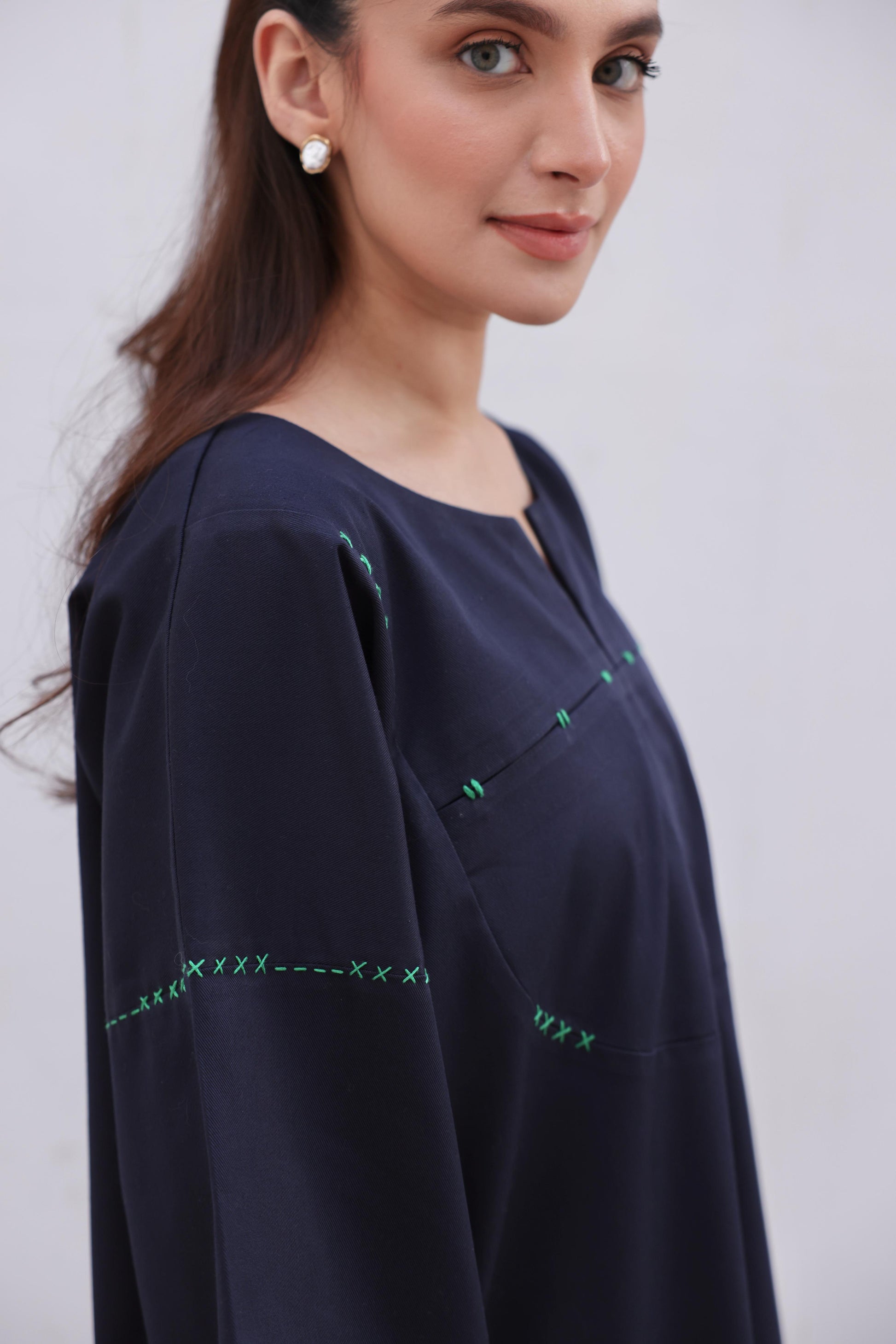 A perfect blend of comfort and style. Gabardine - tightly woven semi-stiff wool in navy blends seamlessly with delicate green stitch details. Our rafa set is a winter must-have. Comes complete with matching pants.