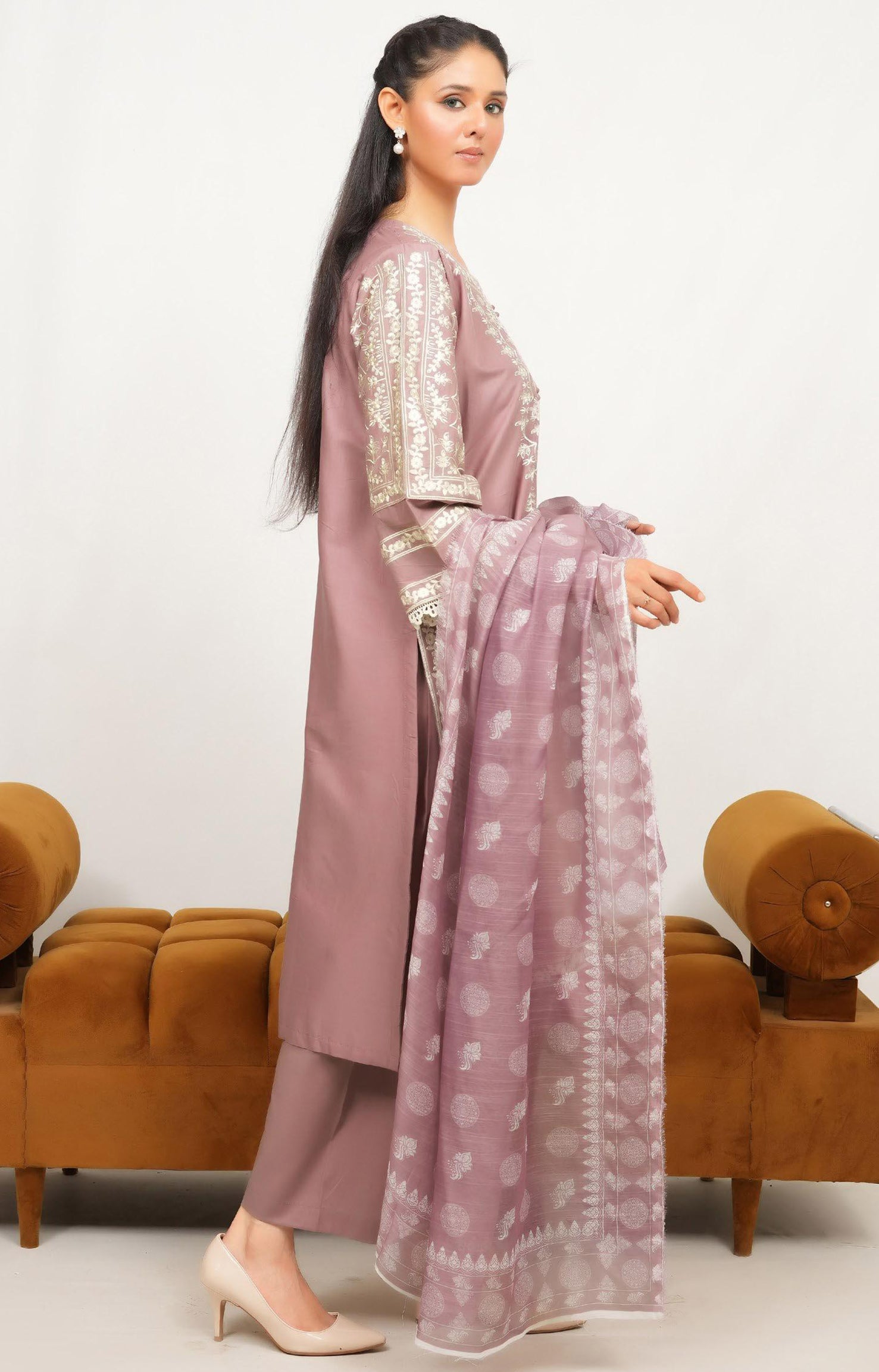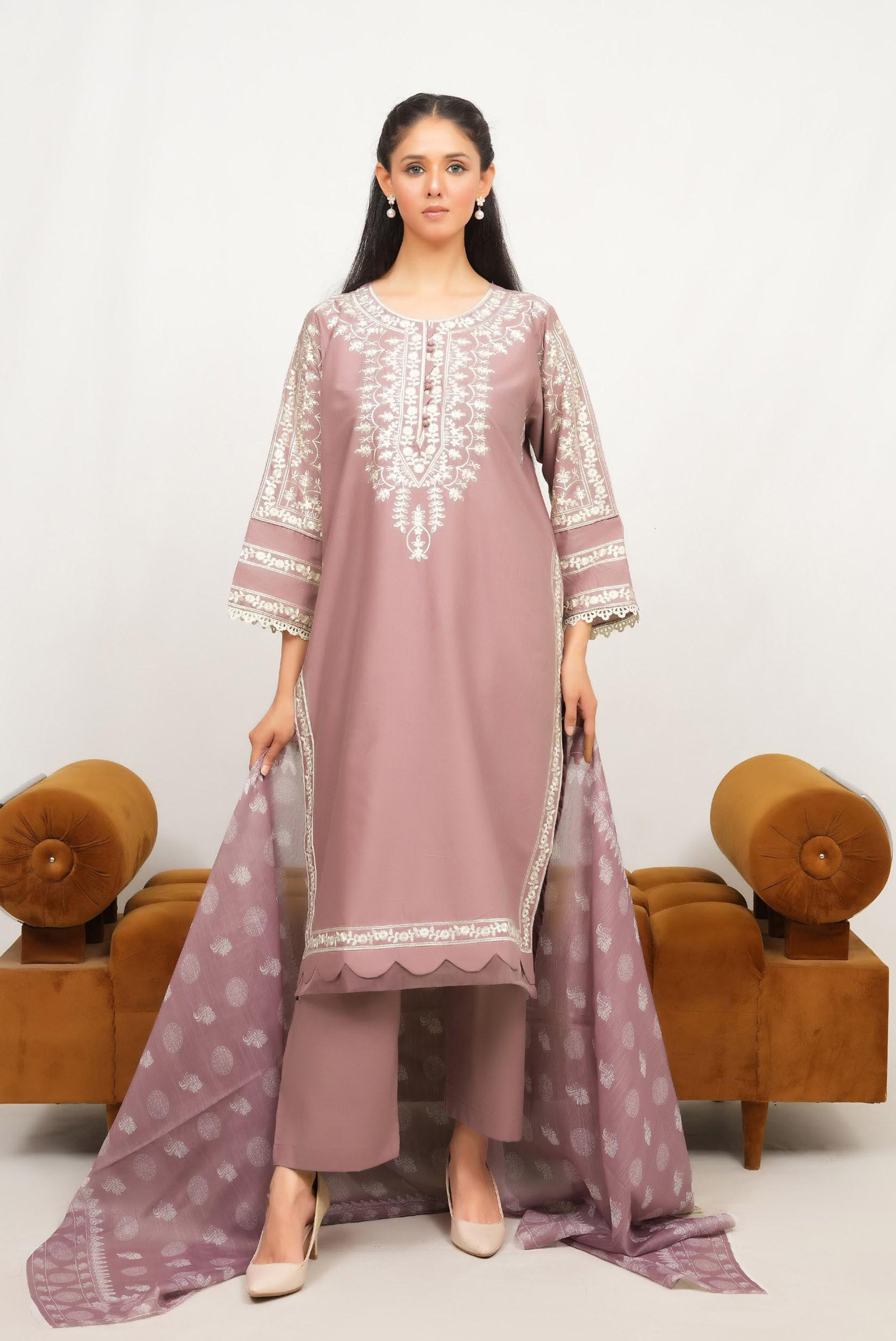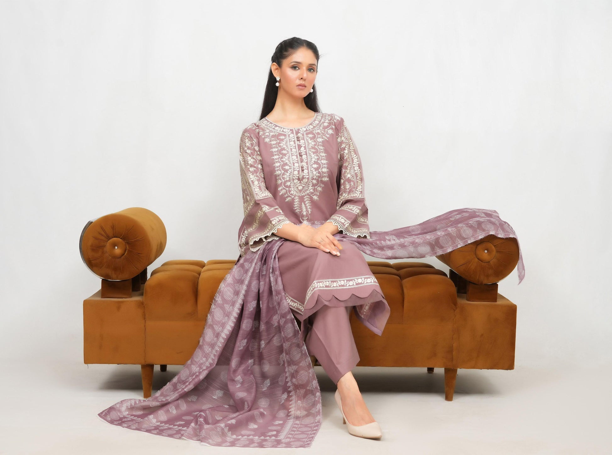Presenting the elegant allure "Serenity" ensemble. this striking outfit radiates grace and timeless beauty. The soft, pinkish-purple hue exudes sophistication, adorned with delicate threadwork and intricate ethnic motifs, The beautifully embroidered neckline and wide, flared sleeves seamlessly combine traditional charm with modern flair. Styled with matching straight trouser and a digitally printed dupatta, Serenity offers the perfect balance of tradition, finesse, and comfort. A standout piece that will effortlessly enhance your wardrobe, ideal for any festive or semi-formal occasion.