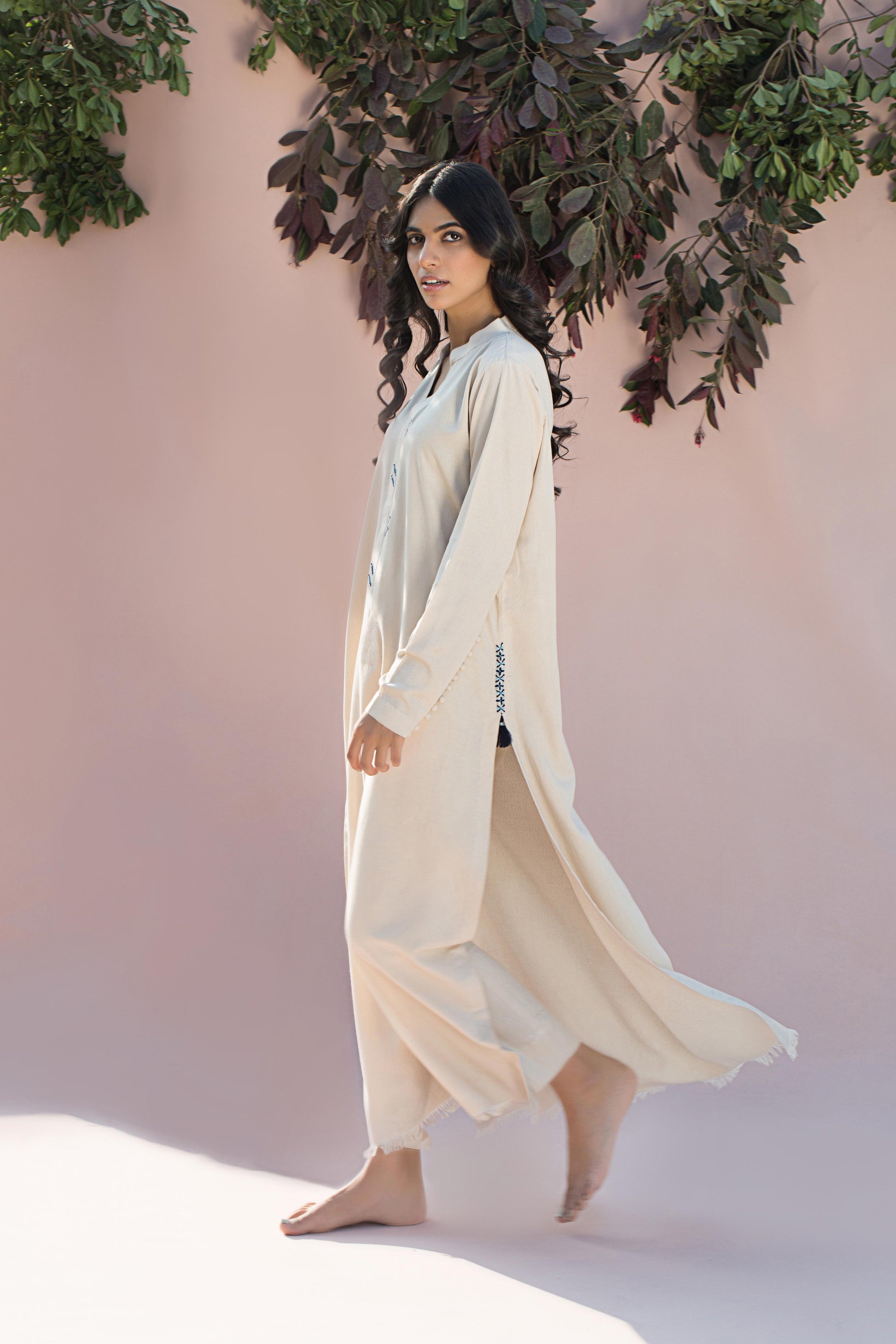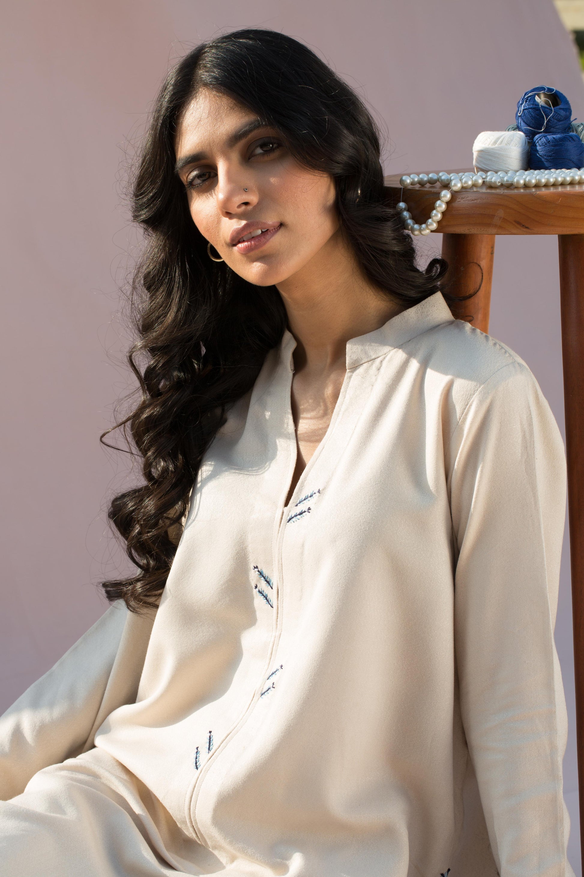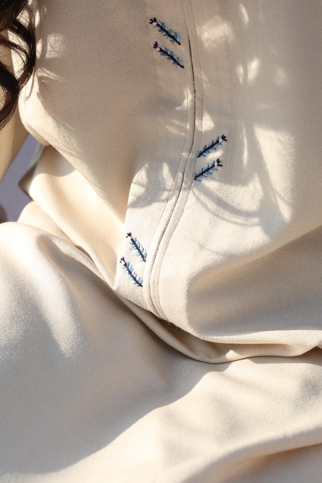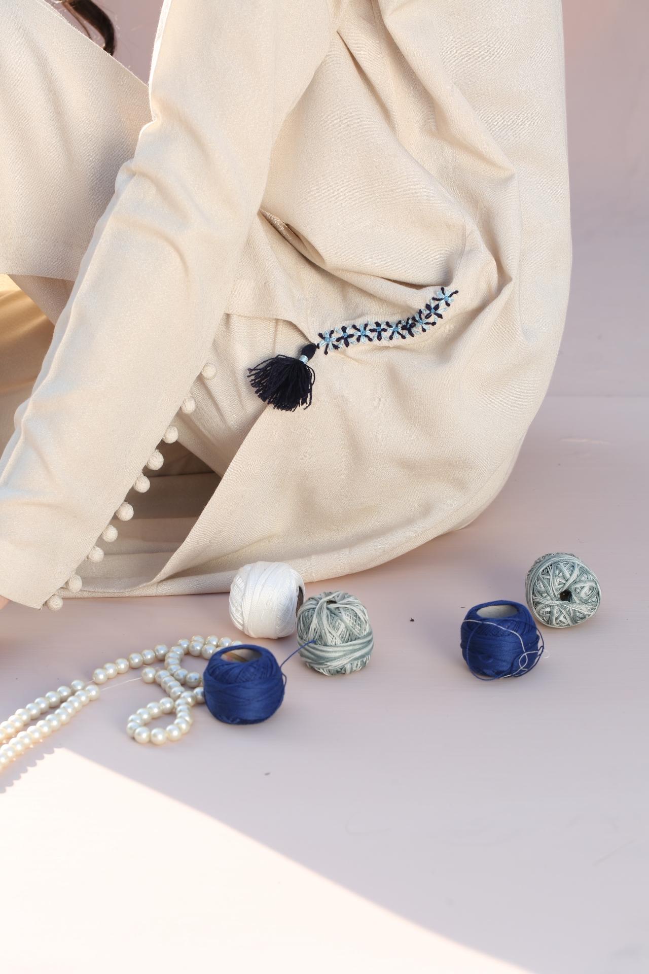 Lara in ivory karandi is hand embroidery with contrasting shades of blue.