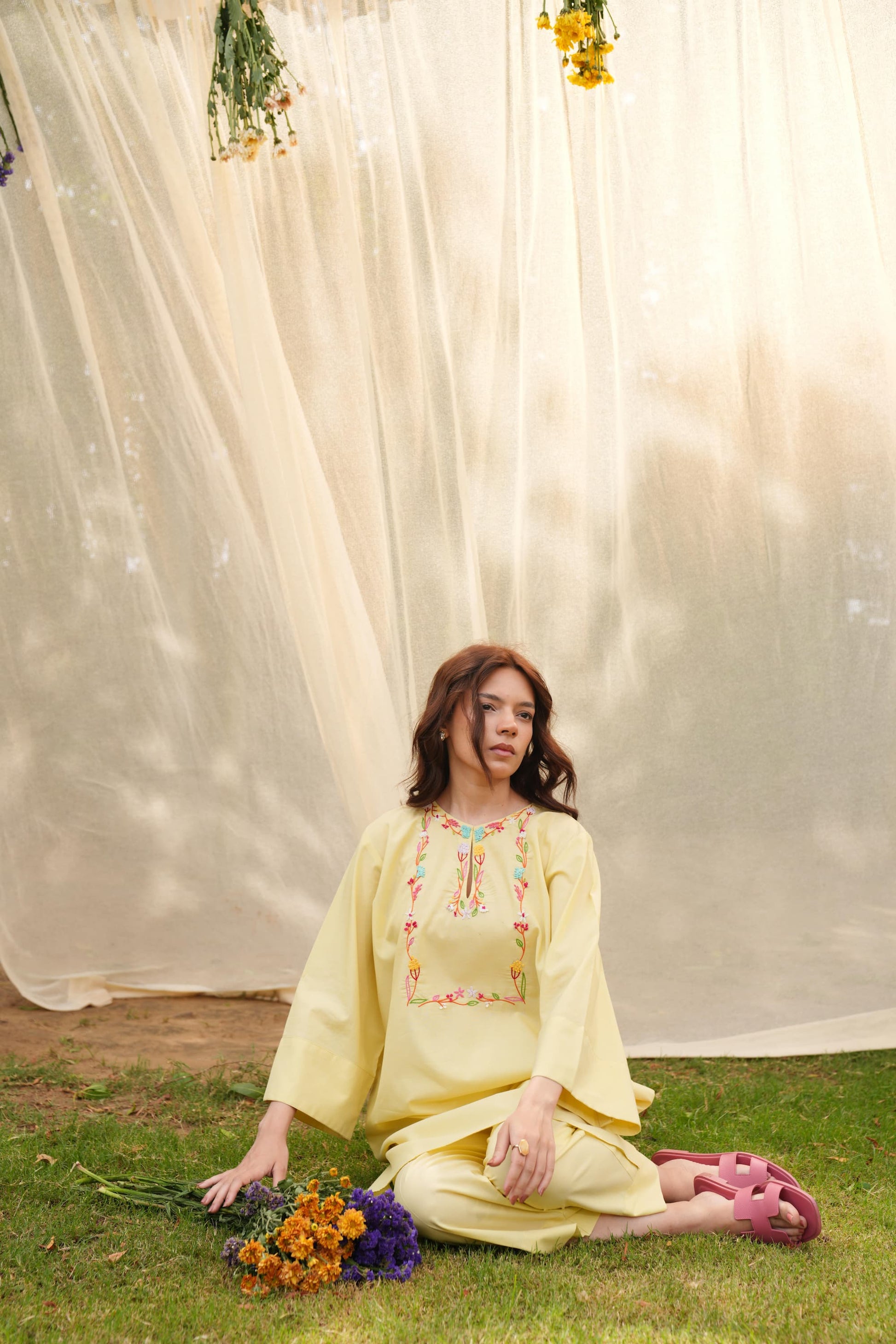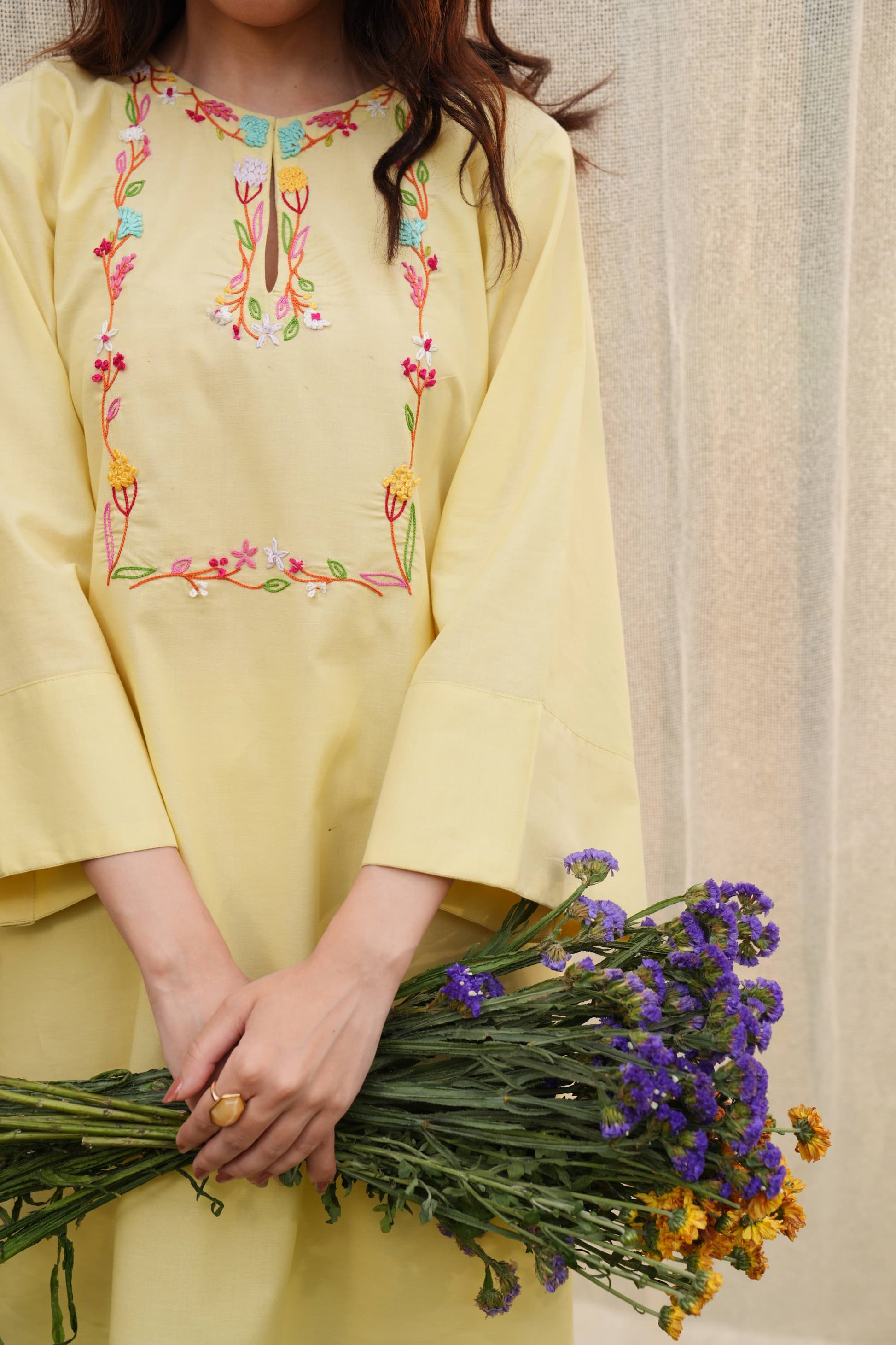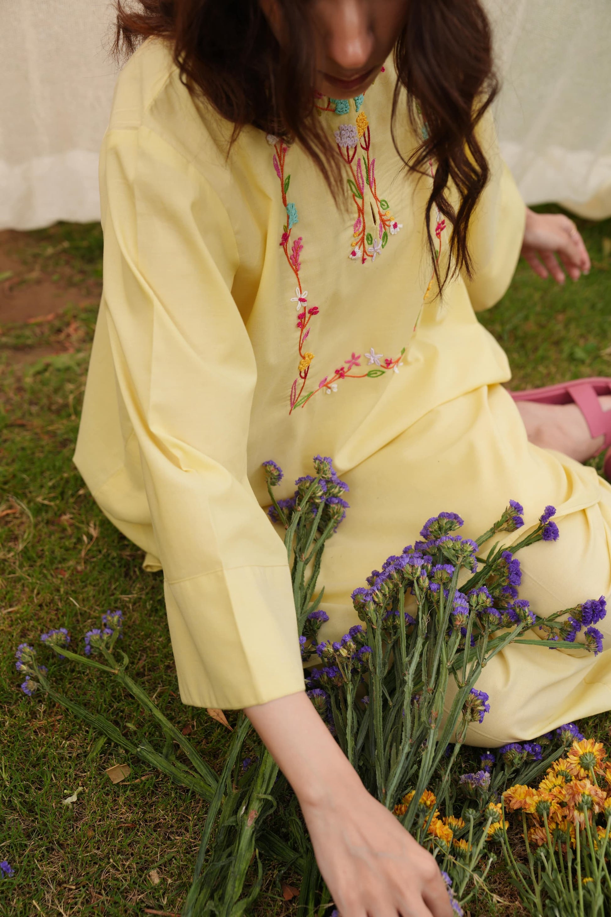 A soft butter yellow dream, delicately finished with floral embroidery blooming along the neckline. Easy, airy, and just enough charm to make you feel like summer.
