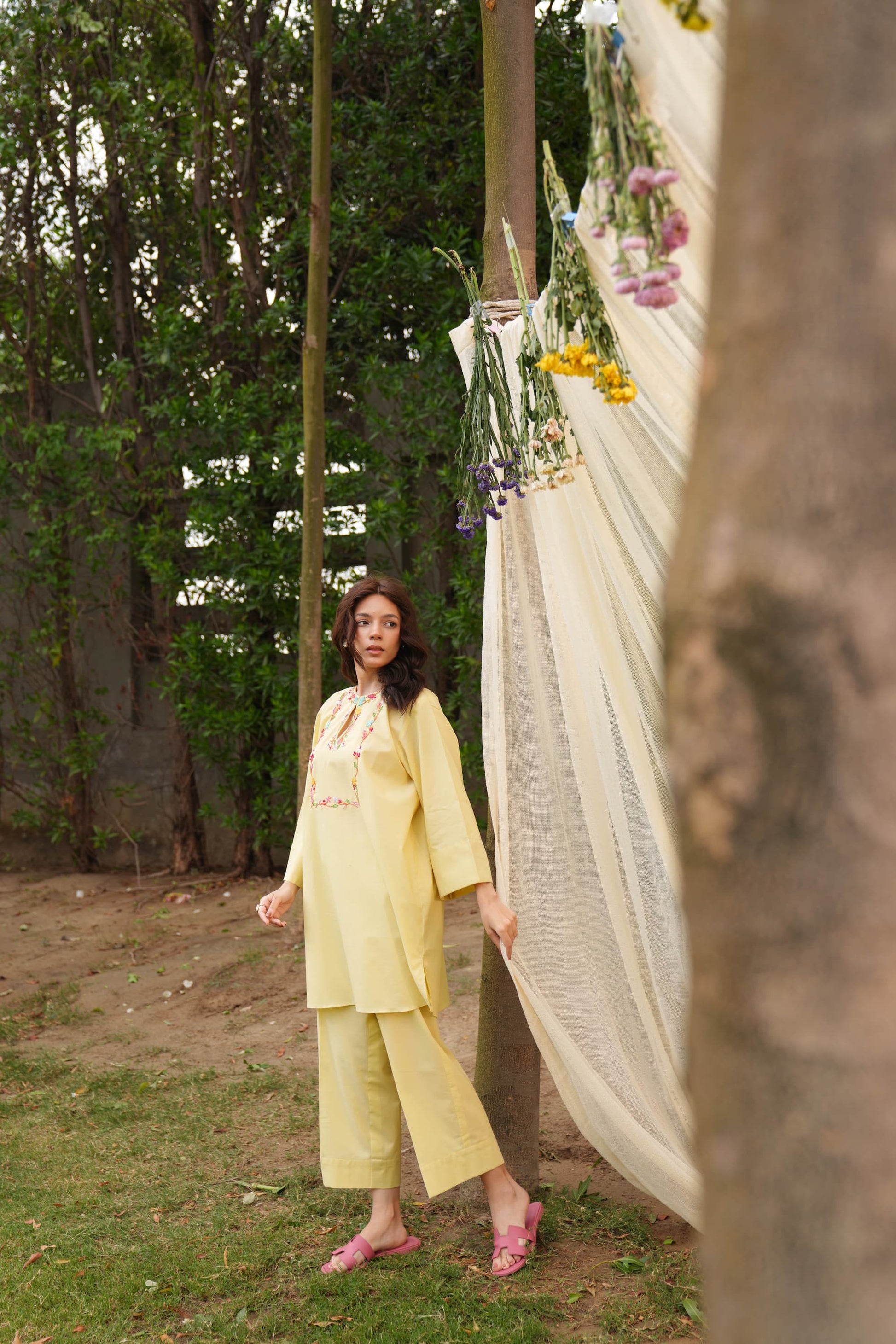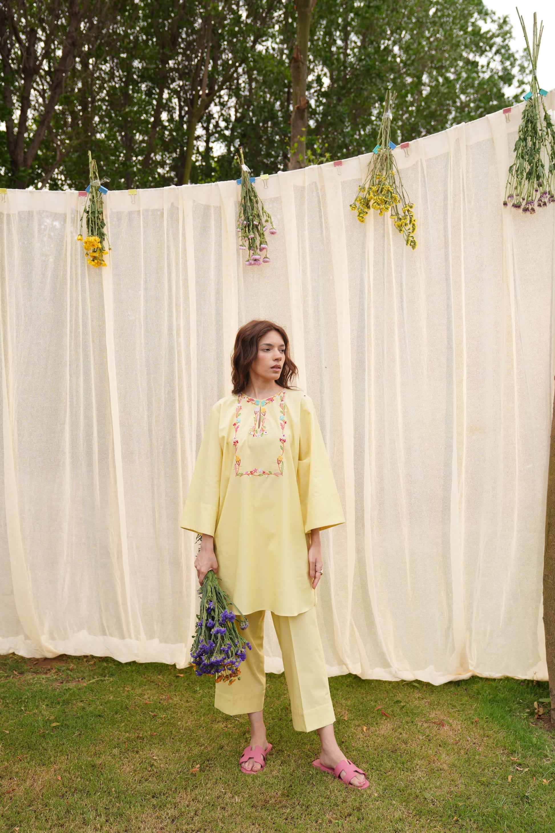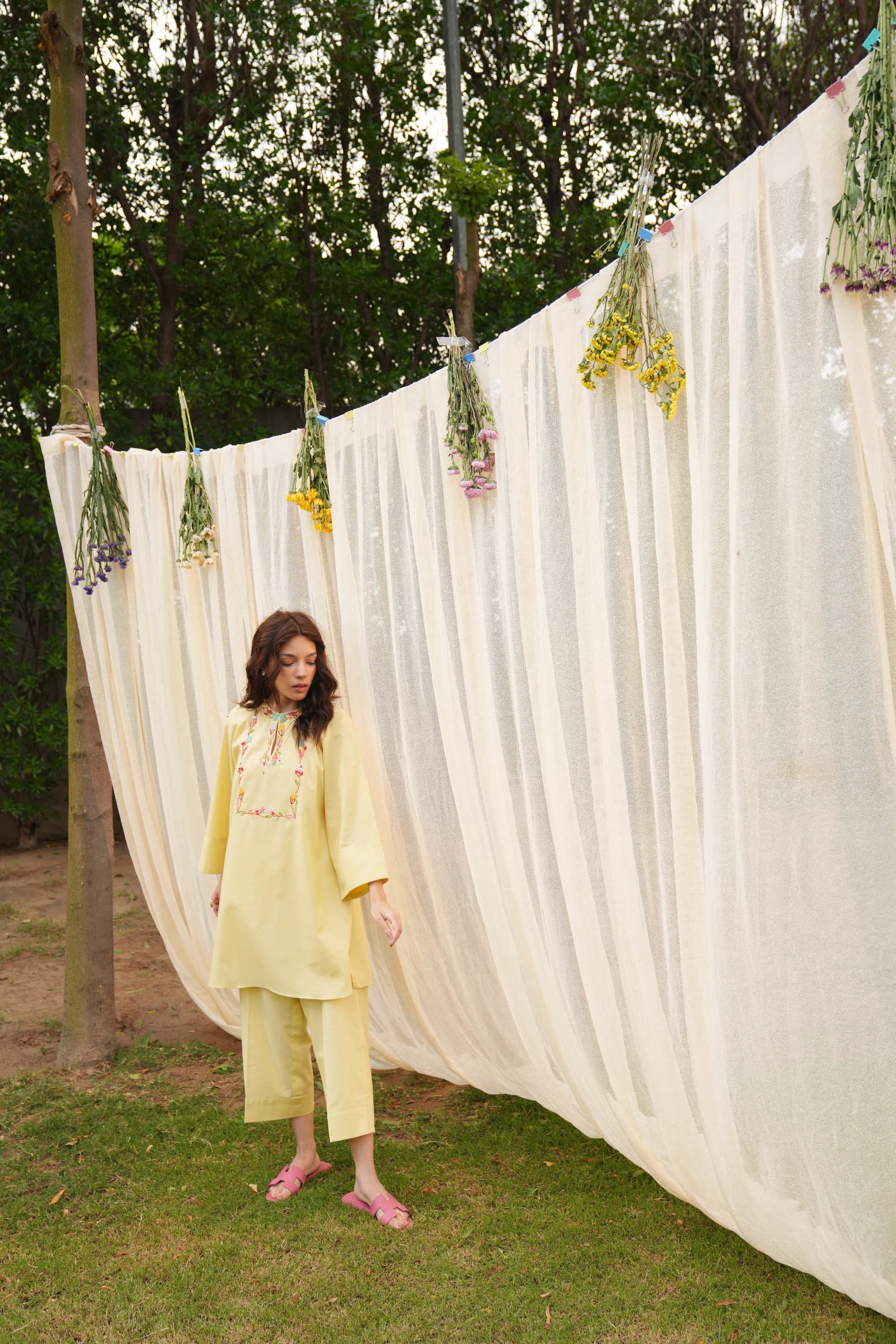 A soft butter yellow dream, delicately finished with floral embroidery blooming along the neckline. Easy, airy, and just enough charm to make you feel like summer.